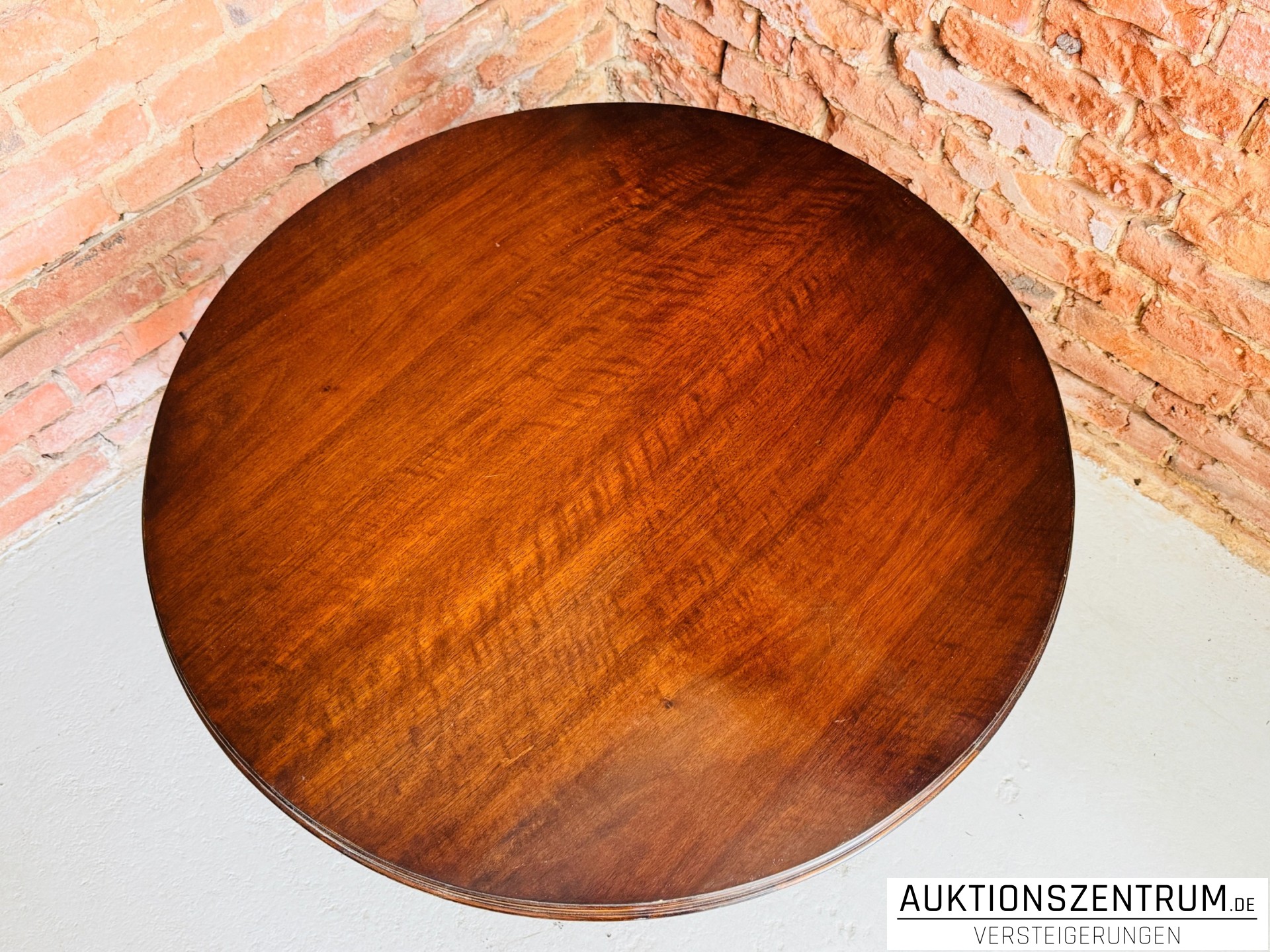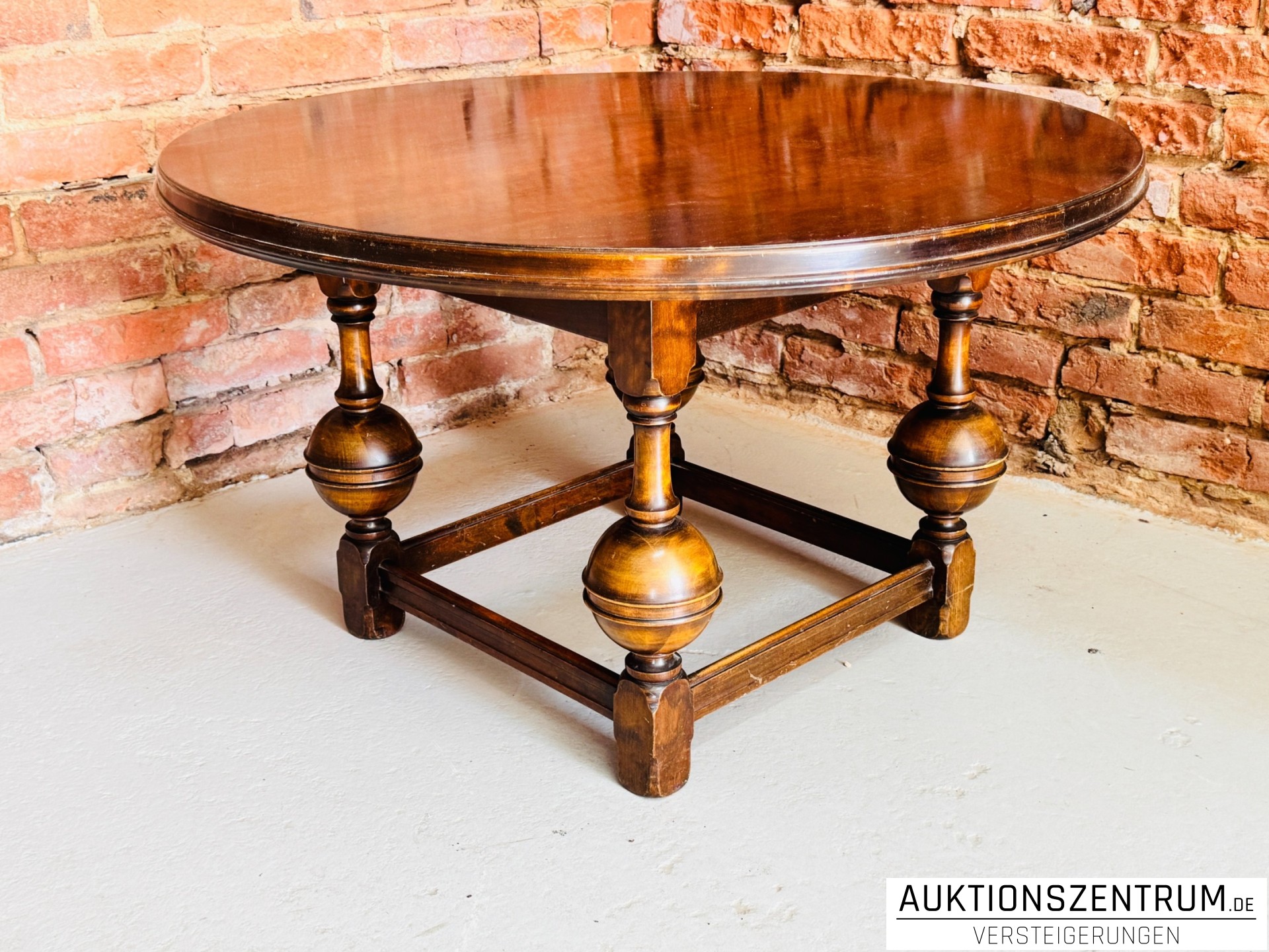 Die runde Platte ruht auf vier kräftig gedrechselten Balusterbeinen, die über einen umlaufenden Rahmensteg stabil miteinander verbunden sind.
