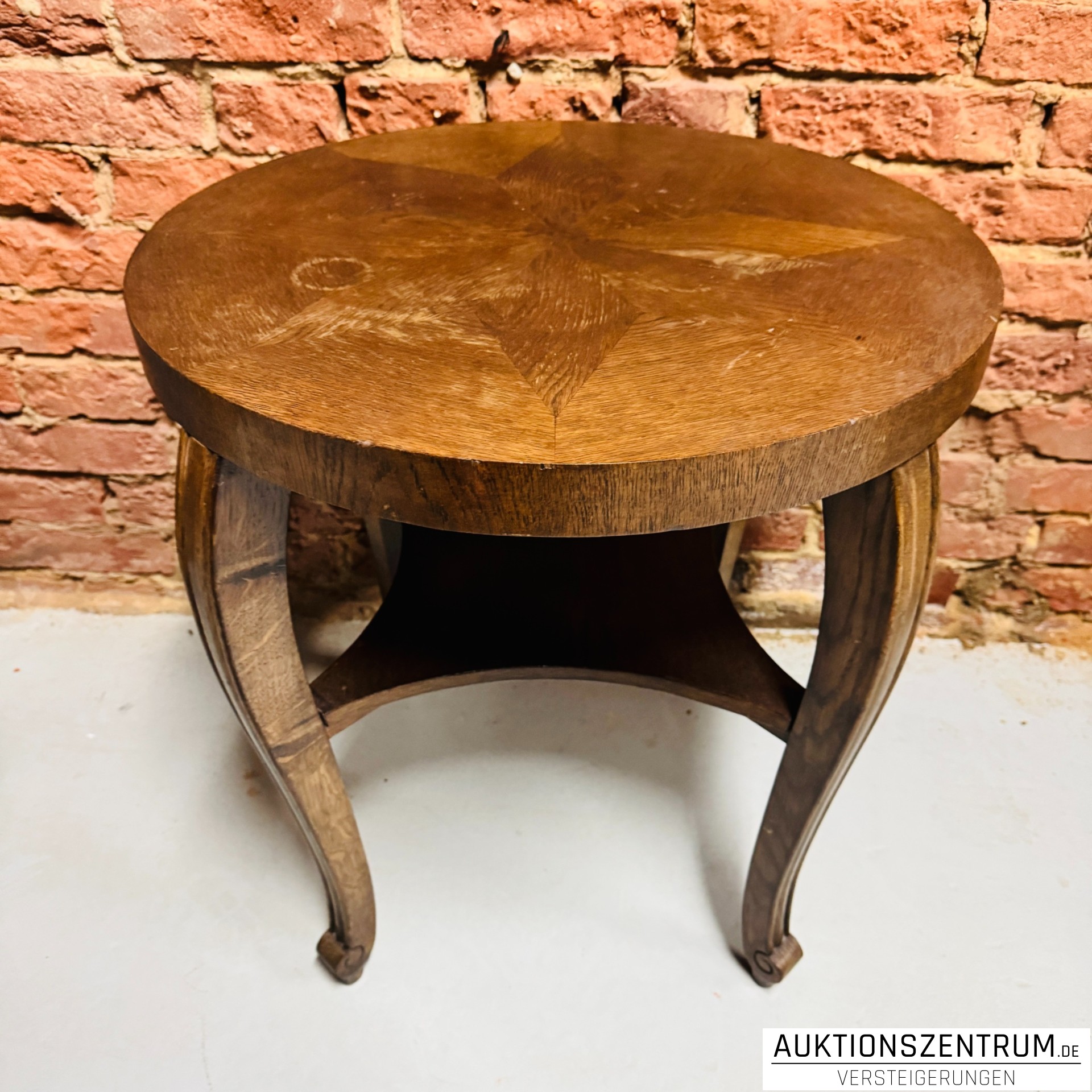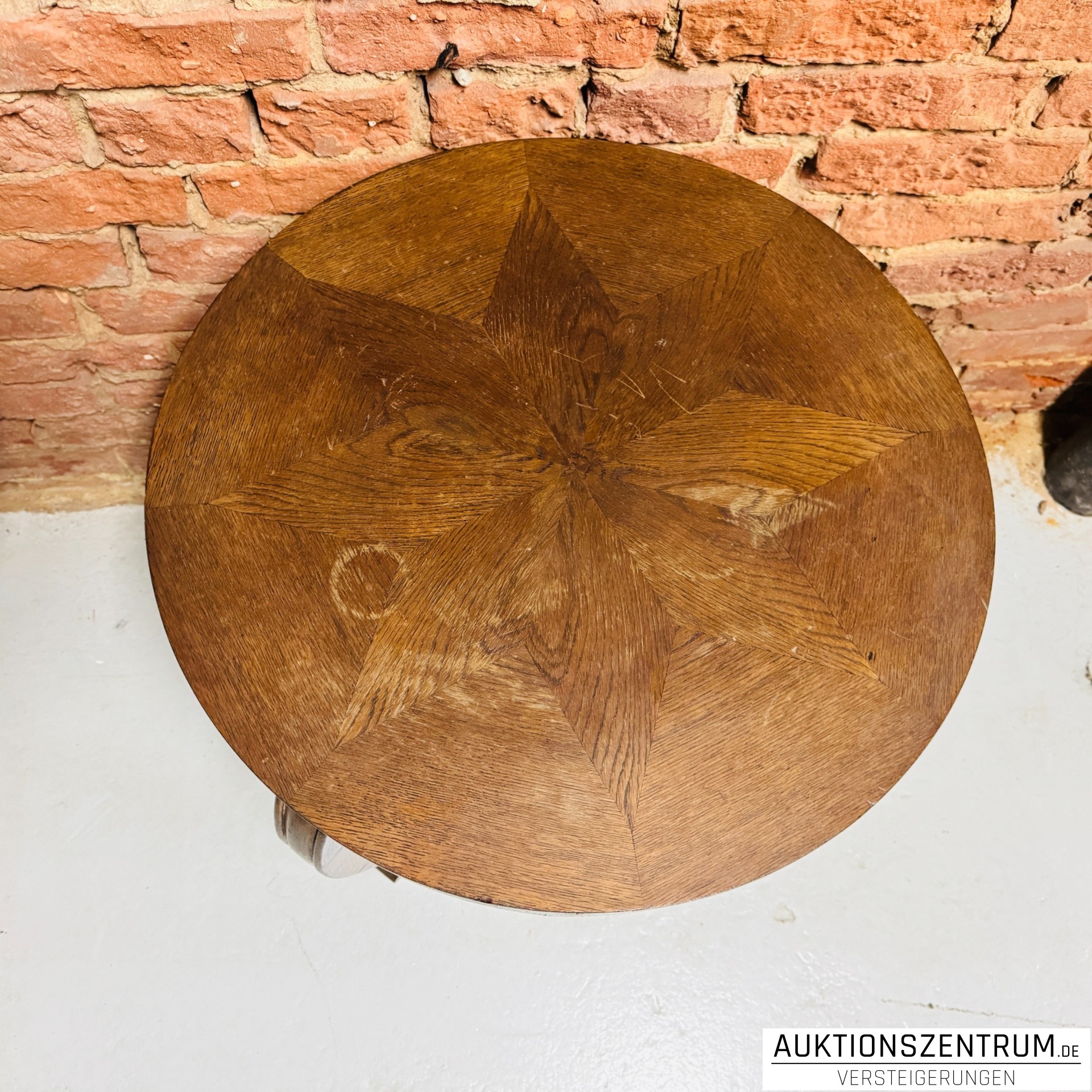 Runder Beistelltisch aus Holz mit dekorativer, sternförmiger Intarsienarbeit auf der Tischplatte.