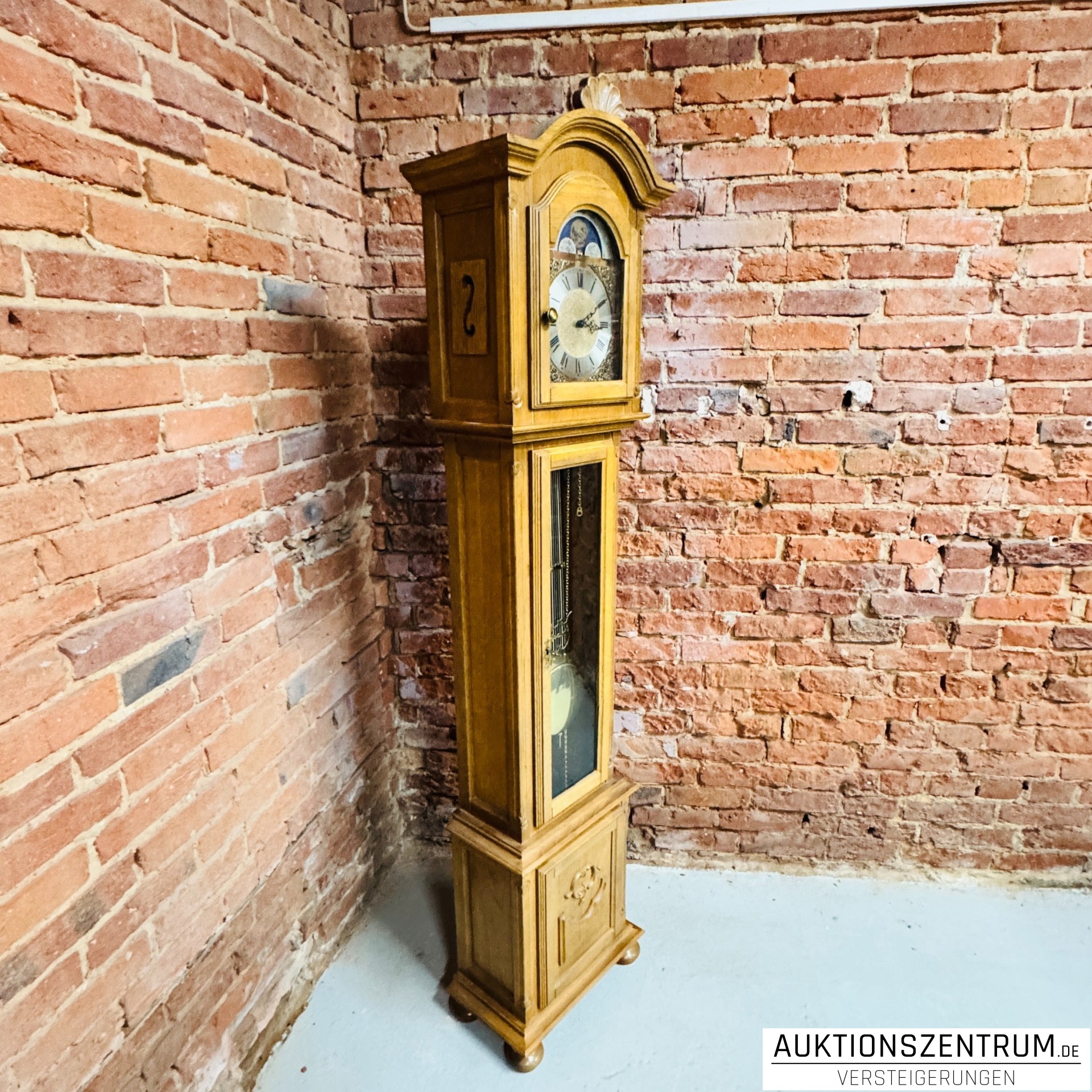 Das hohe, geradlinige Gehäuse mit geschwungenem Giebelabschluss und geschnitztem Dekorelement steht auf vier gedrechselten Kugelfüßen und verfügt über eine verglaste Mitteltür zur Sicht auf Pendel und 3 Gewichte.