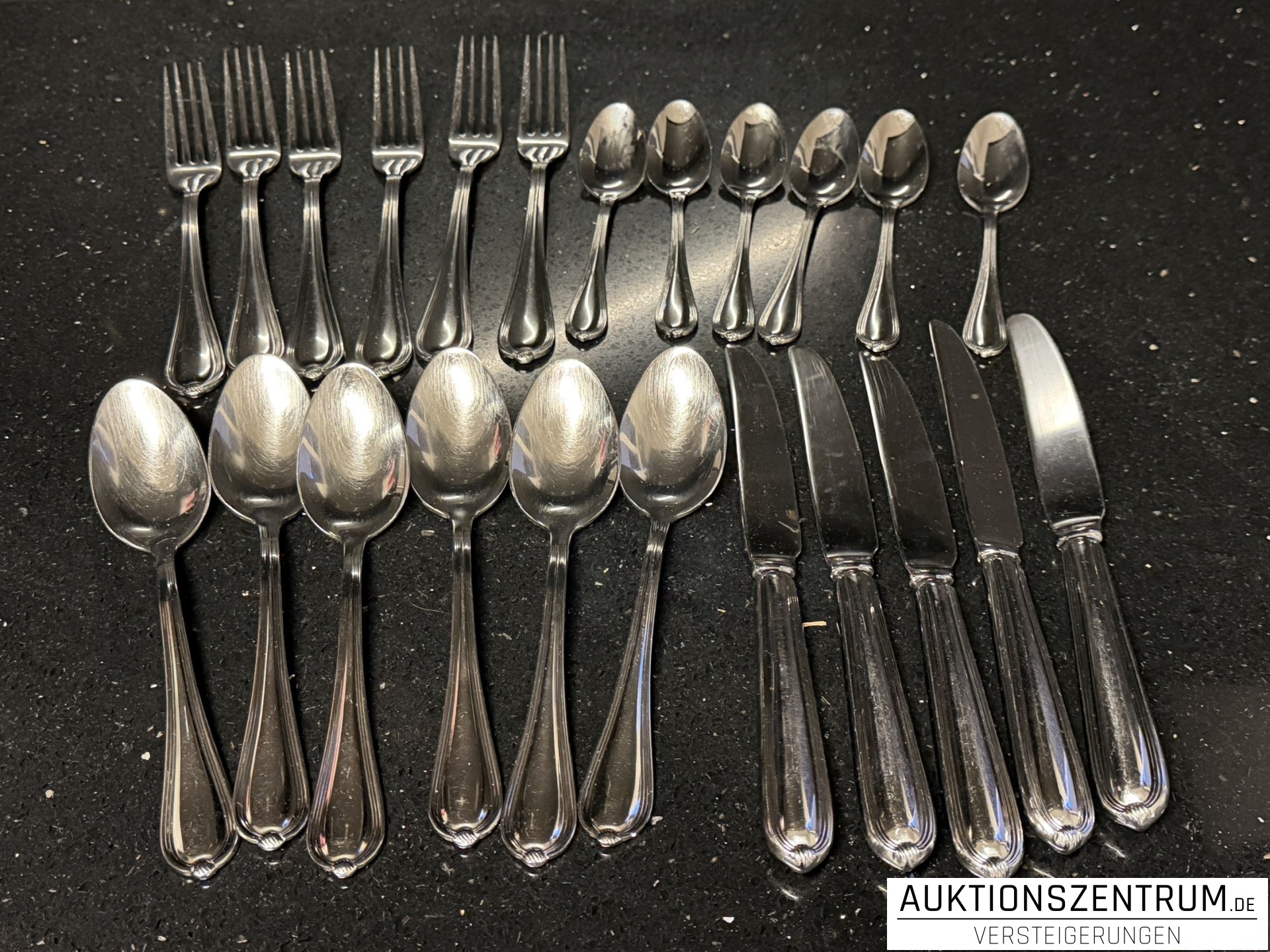Umfang: 5 Messer, sonst jeweils 6 Teile sowie eine Salatgabel. Insgesamt damit ein umfangreiches Set für den täglichen Gebrauch oder die festliche Tafel.