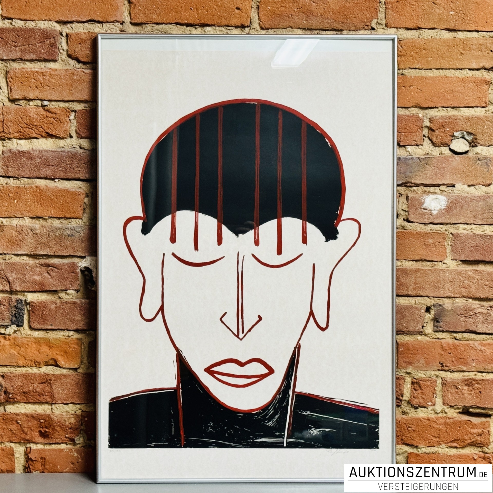 Farbdruck auf Papier, im Aluminiumrahmen gerahmt. Das Werk zeigt ein reduziertes, grafisch gestaltetes Portrait mit klaren Linien und kontrastreicher Farbgebung.