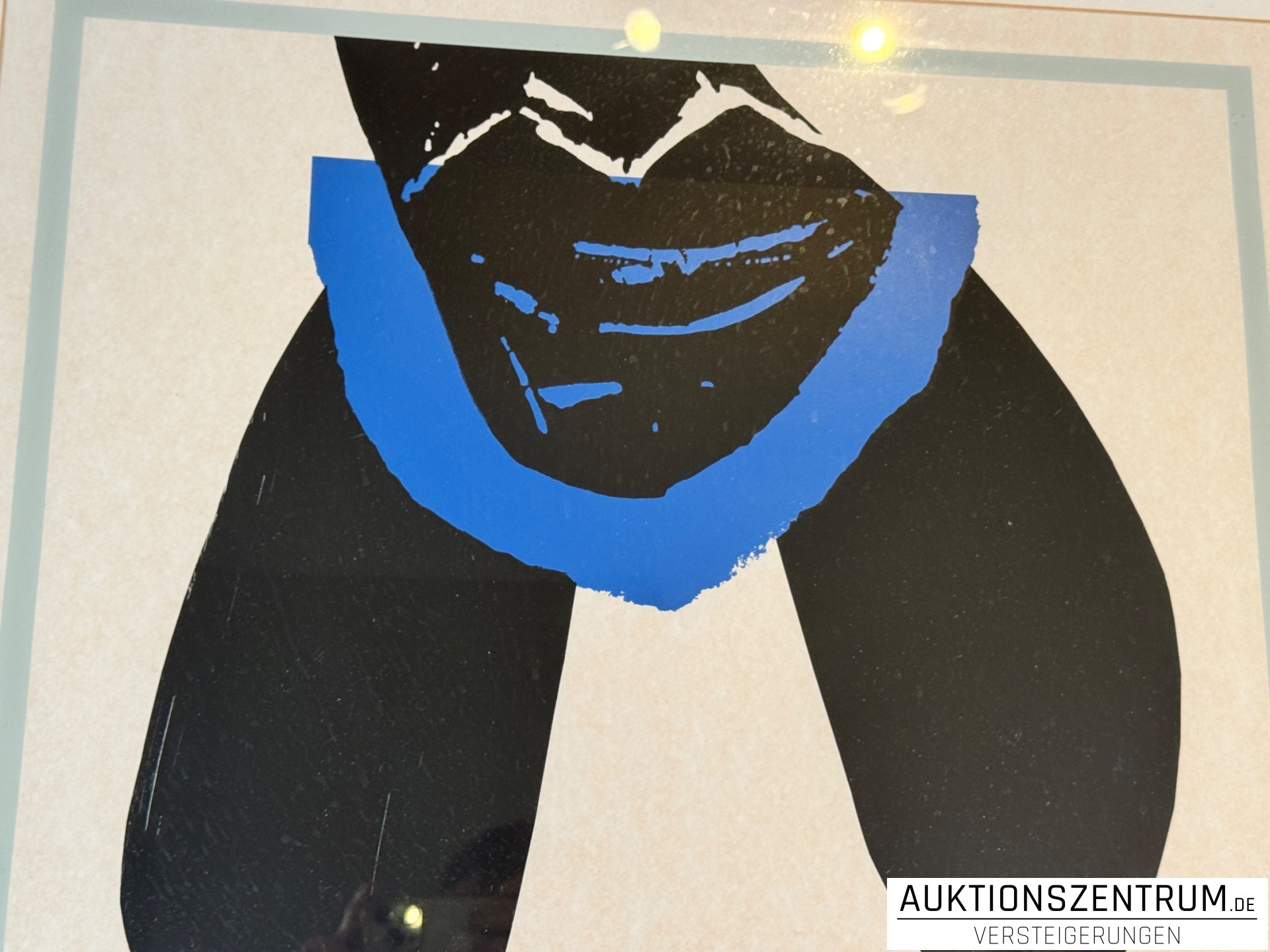 Limitierte Auflage von 70 Exemplaren, hier das letzte Blatt der Edition. Abstrakte, stark kontrastierende Komposition in Schwarz und Blau vor hellem Fond.