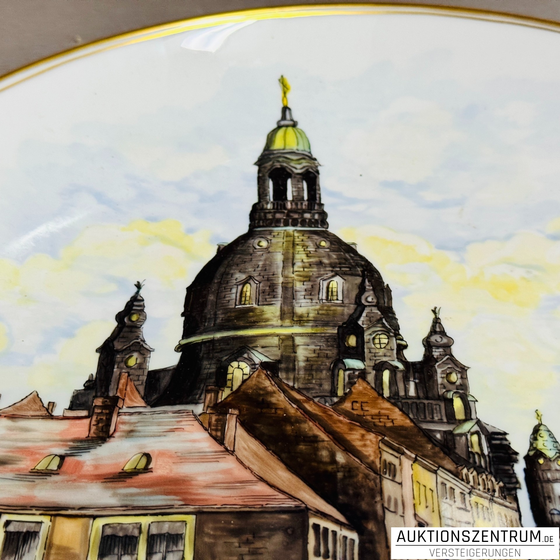 Runder Porzellan-Wandteller mit handgemalter Stadtansicht der Dresdner Frauenkirche und umliegender Bebauung. Feine, detailreiche Ausführung in polychromer Aufglasurmalerei, Rand mit umlaufender Goldlinie akzentuiert. Auf der Rückseite Herstellerzeichen mit Aufschrift „Dresden Handgemalt“ sowie Bezeichnung „Frauenkirche Dresden bis 1945“. Rückseitig mit zwei kleinen Bohrungen und eingezogener Drahtaufhängung zur Wandmontage.