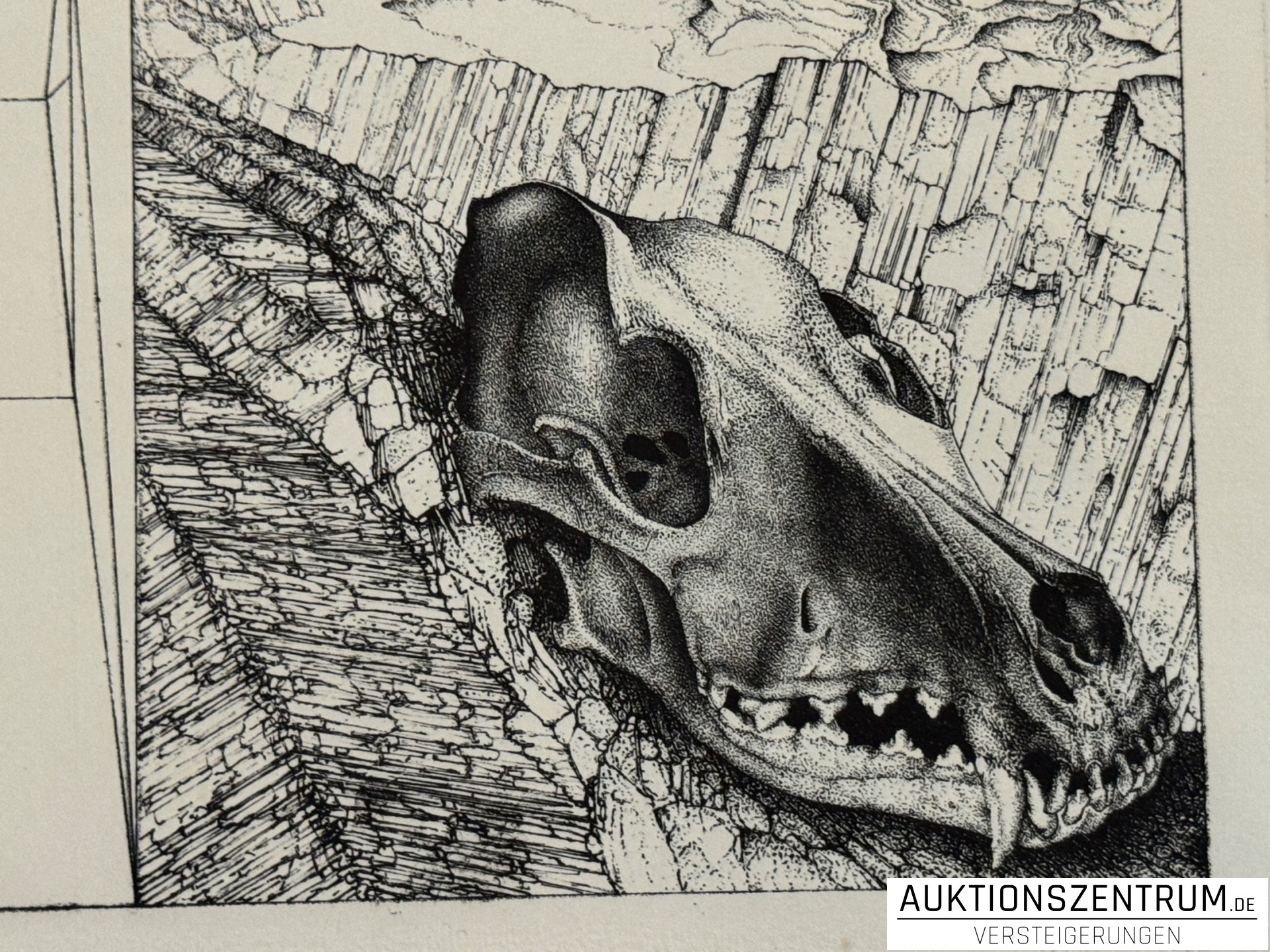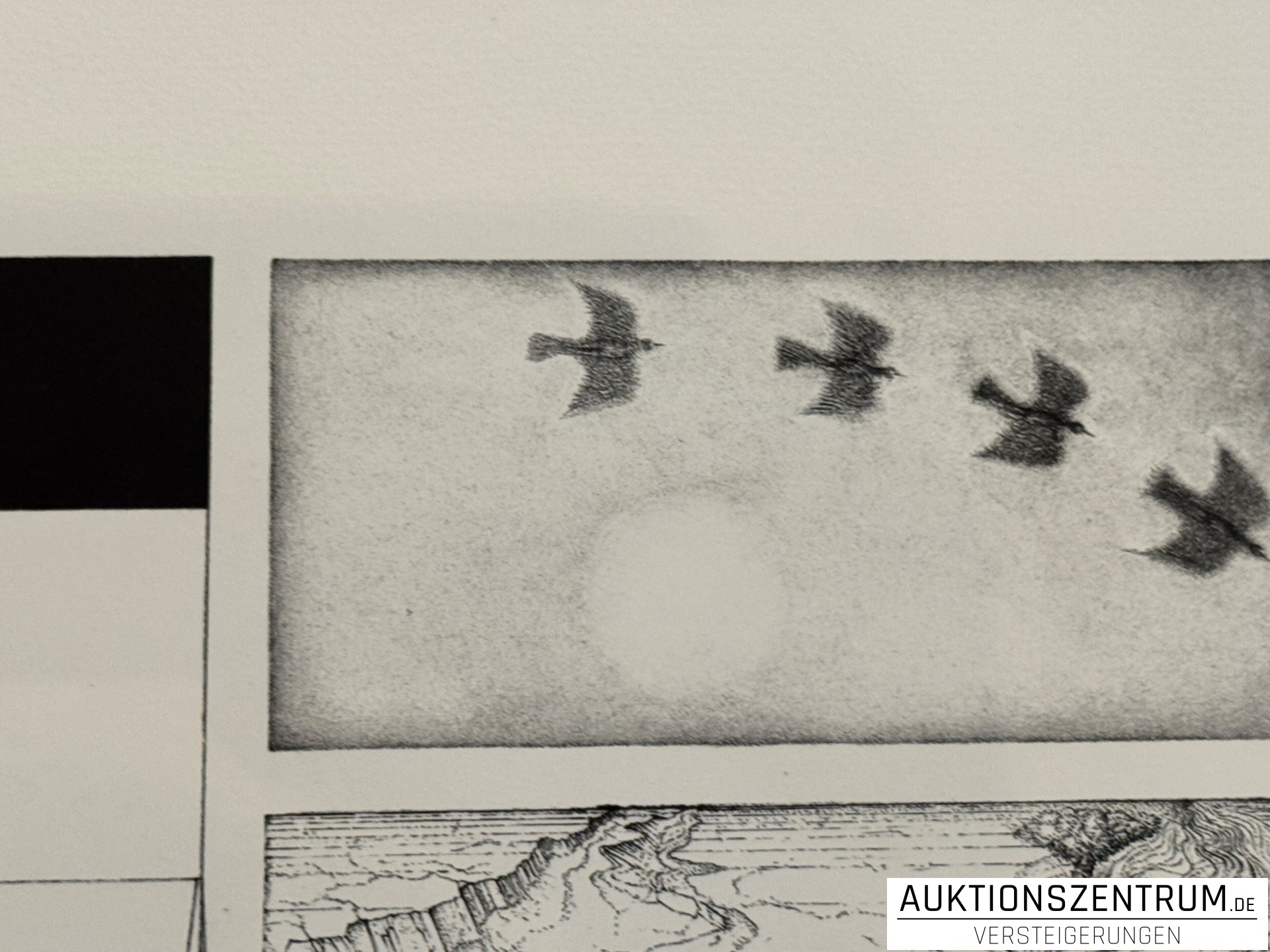 Fein ausgearbeitete Radierung mit mehrteiliger Bildanlage: Links ein geometrisch-abstraktes Motiv mit plastisch modellierter Form, rechts oben eine Vogelflug-Szene, rechts unten ein detailreich dargestellter Tierschädel in landschaftlicher Umgebung. Das Blatt überzeugt durch präzise Punkt- und Linienführung sowie einen spannungsvollen Kontrast zwischen konstruktiven und naturalistischen Partien.