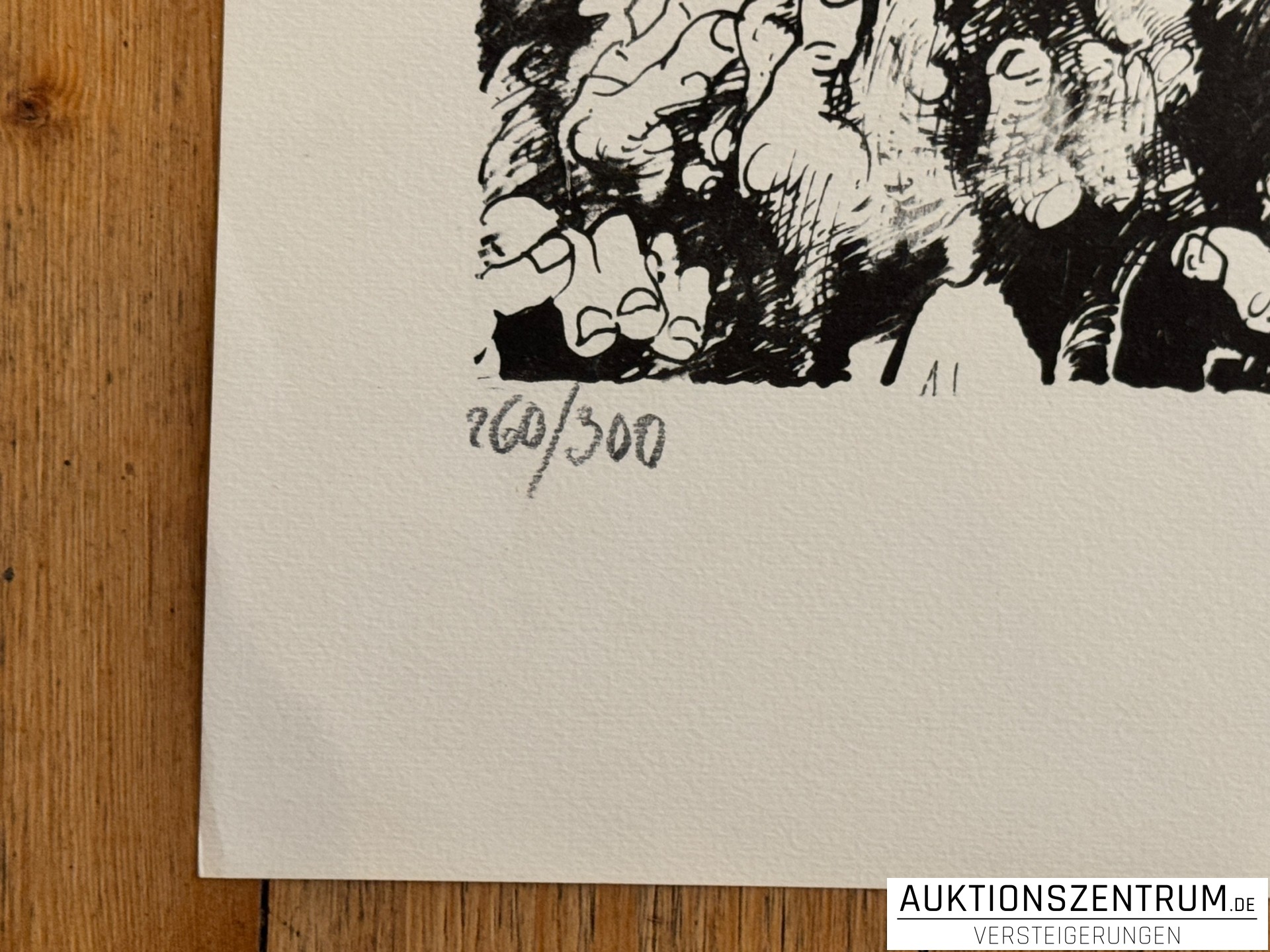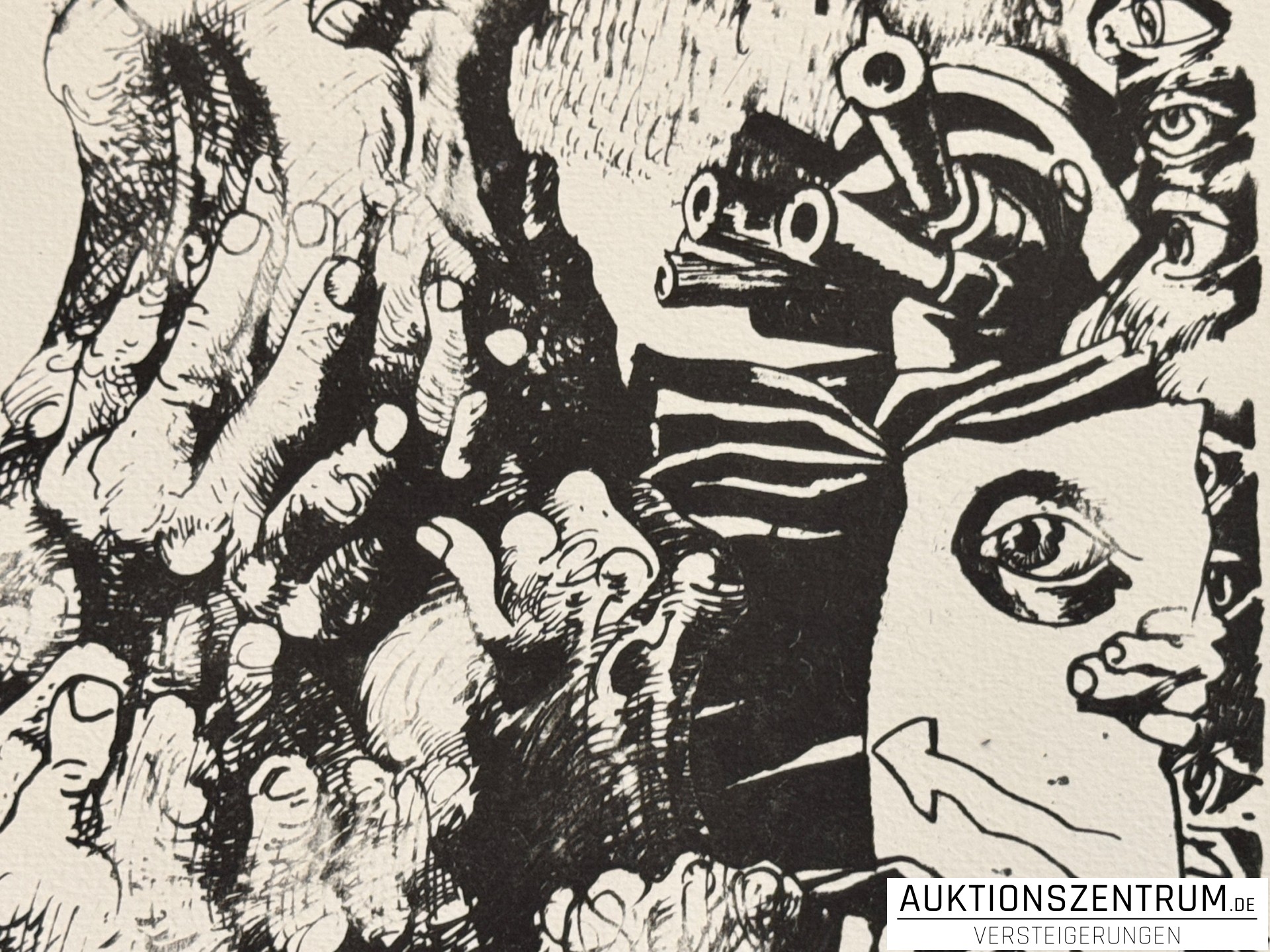 Ausdrucksstarke, in Schwarz-Weiß gehaltene Grafik mit dynamischer Figuren- und Handdarstellung, typisch für das engagierte, politisch geprägte Werk Willi Sittes. Das Blatt entstand anlässlich des 60. Jahrestages der Oktoberrevolution und gehört zu einer thematischen Mappenedition.