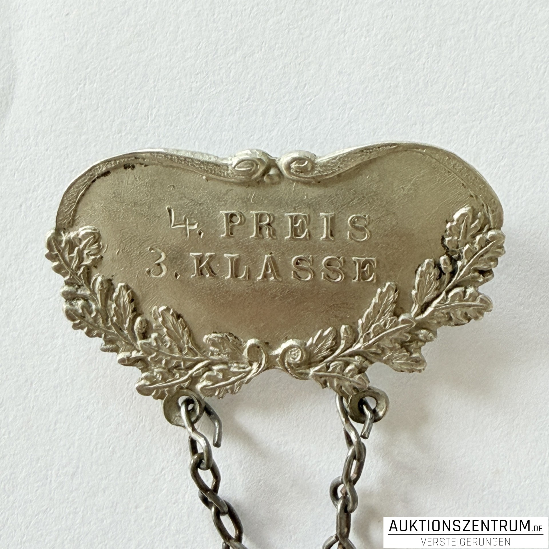 Die Spange ist reich mit Eichenlaub dekoriert und auf der Vorderseite mit „4. Preis 3. Klasse“ graviert.