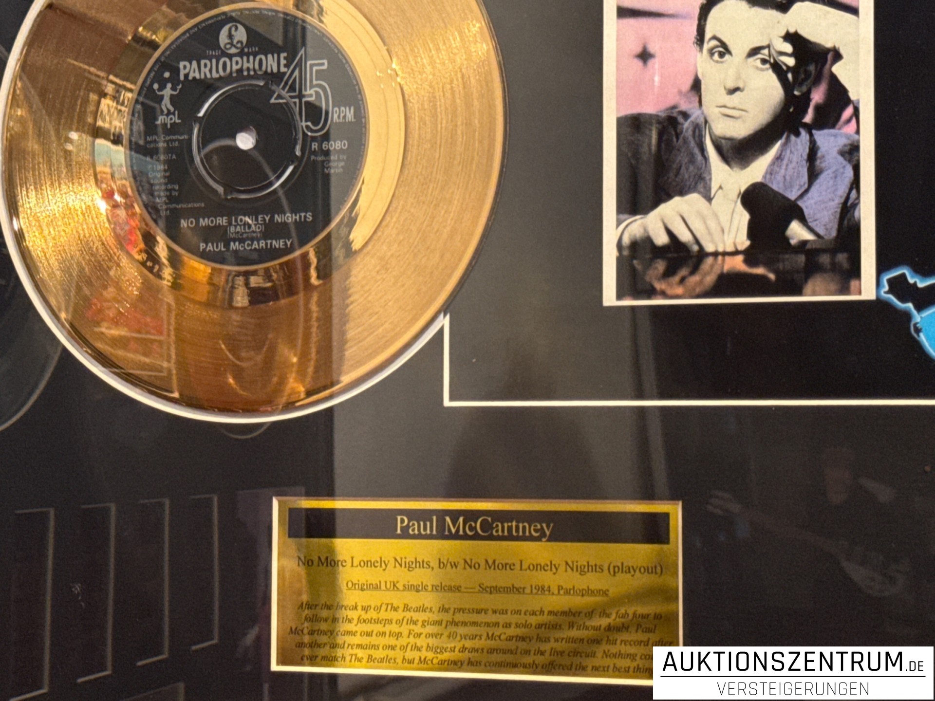 Lot 180 - Paul McCartney Gold Award Display Single: No More Lonely Nights + Playouts, Parlophone Vinyl