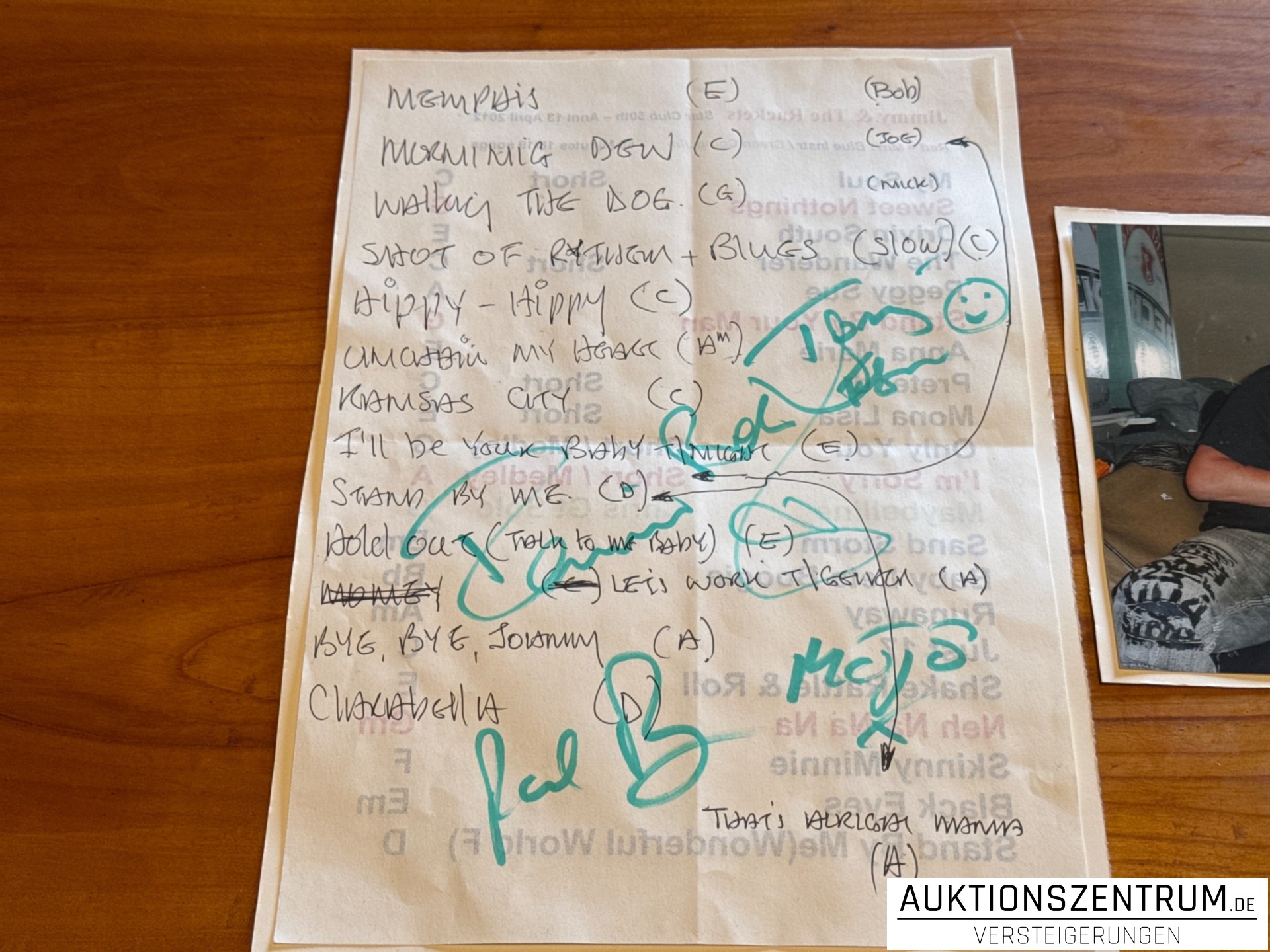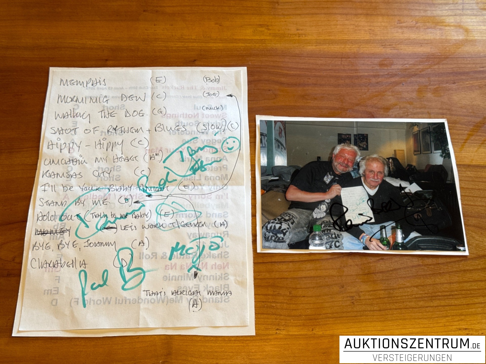 Diese von Pete Best handgeschriebene Setlist vom Konzert 50 Jahre STAR CLUB Hamburg wurde im Anschluss eigenhändig vom Künstler unterzeichnet und verschenkt. Fotos belegen die Provenienz.