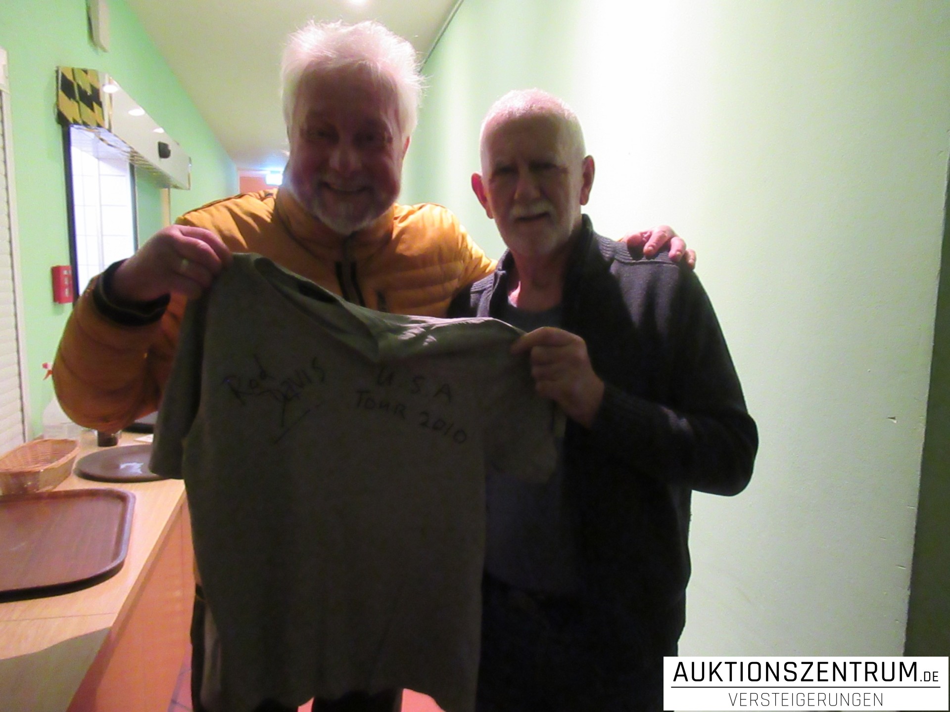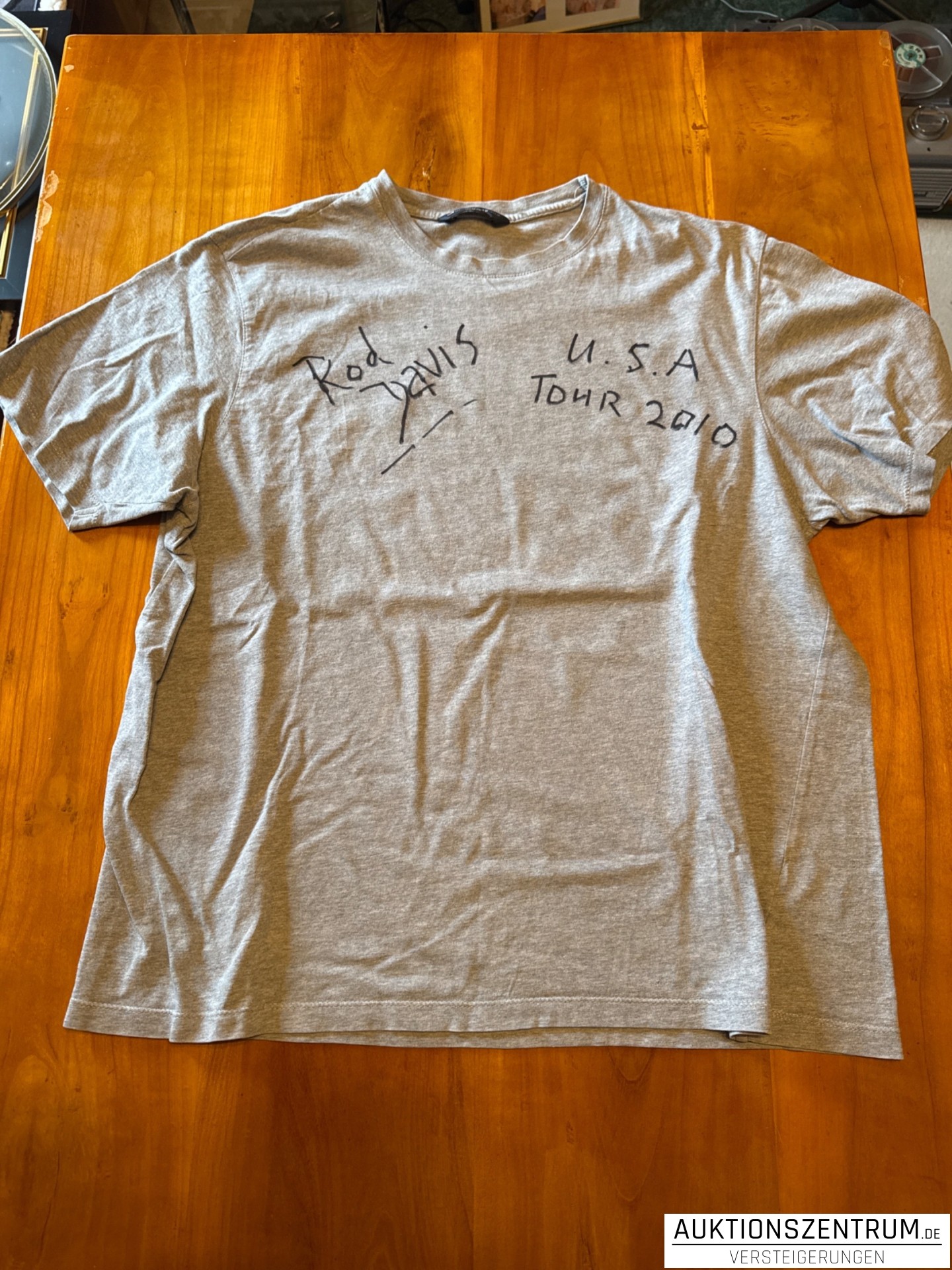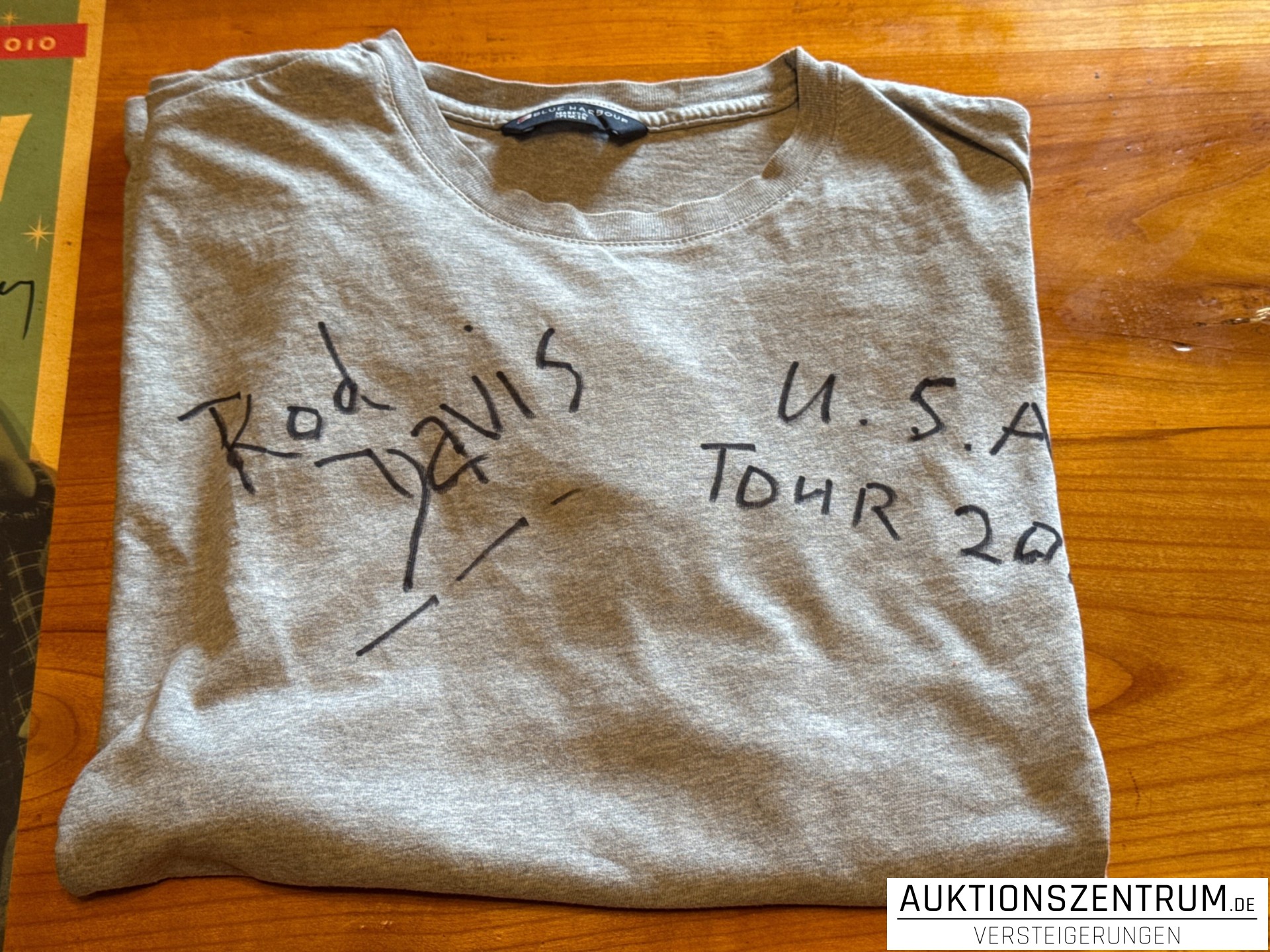 Von Rod Davis getragenes und signiertes T-Shirt aus der USA Tour 2010 und von allen unterzeichnetes Tourplakat. Ein Foto belegt die Provenienz.