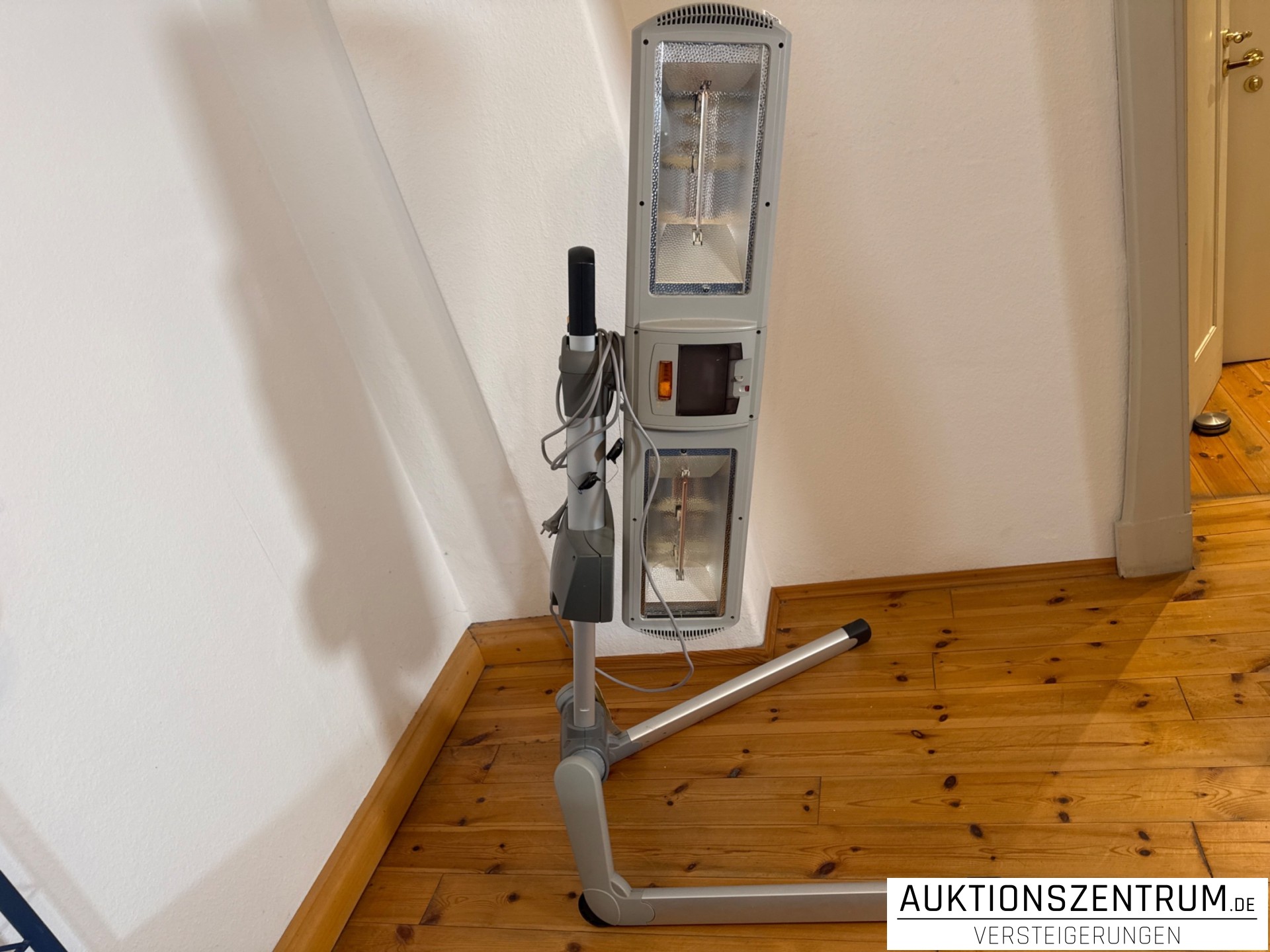 Die Lampen sind in zwei Sektionen untergebracht, um eine gleichmäßige Bestrahlung des Oberkörpers zu gewährleisten. Das Gerät ist als UV type 3 klassifiziert, was die Einhaltung gängiger Sicherheitsstandards bestätigt. Das Solarium steht auf einem stabilen, einklappbaren Stativ mit Gelenken, das eine flexible Ausrichtung des Geräts ermöglicht, während man liegt oder sitzt. Ein integrierter Timer sorgt für die Einhaltung der empfohlenen Bestrahlungsdauer und somit für die Sicherheit beim Bräunen.
