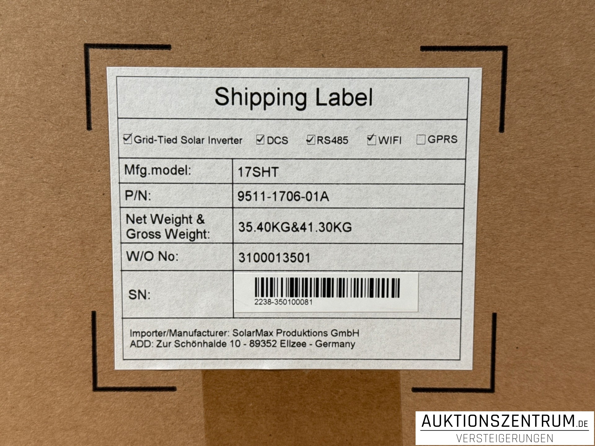 Lot 50 - 4 x SolarMax 17SMT 17 kW PV-Wechselrichter (4 Stück auf Palette)