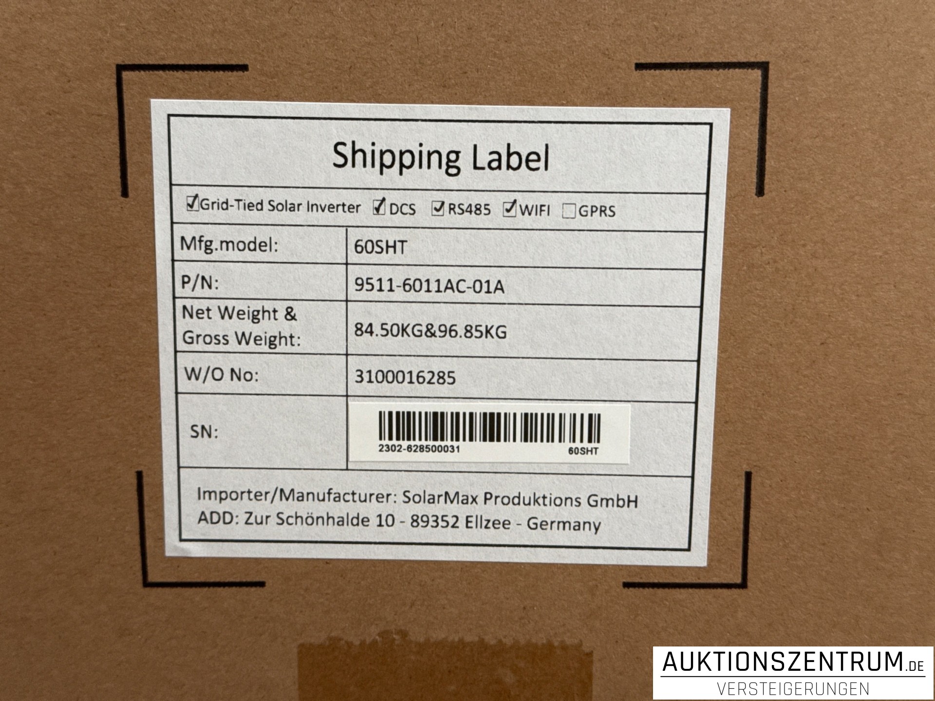 - Versandgewicht je Gerät: ca. 96,85 kg
