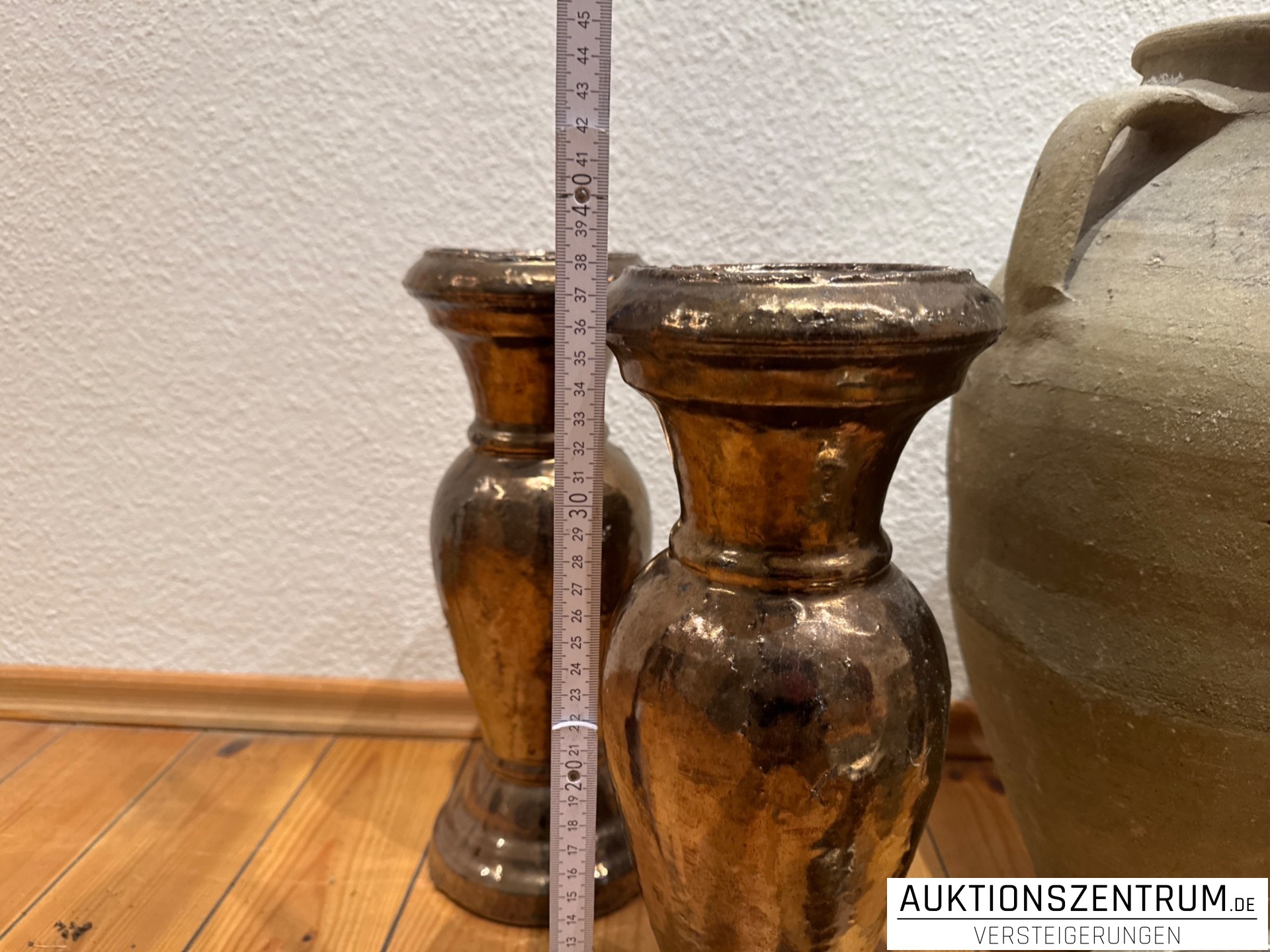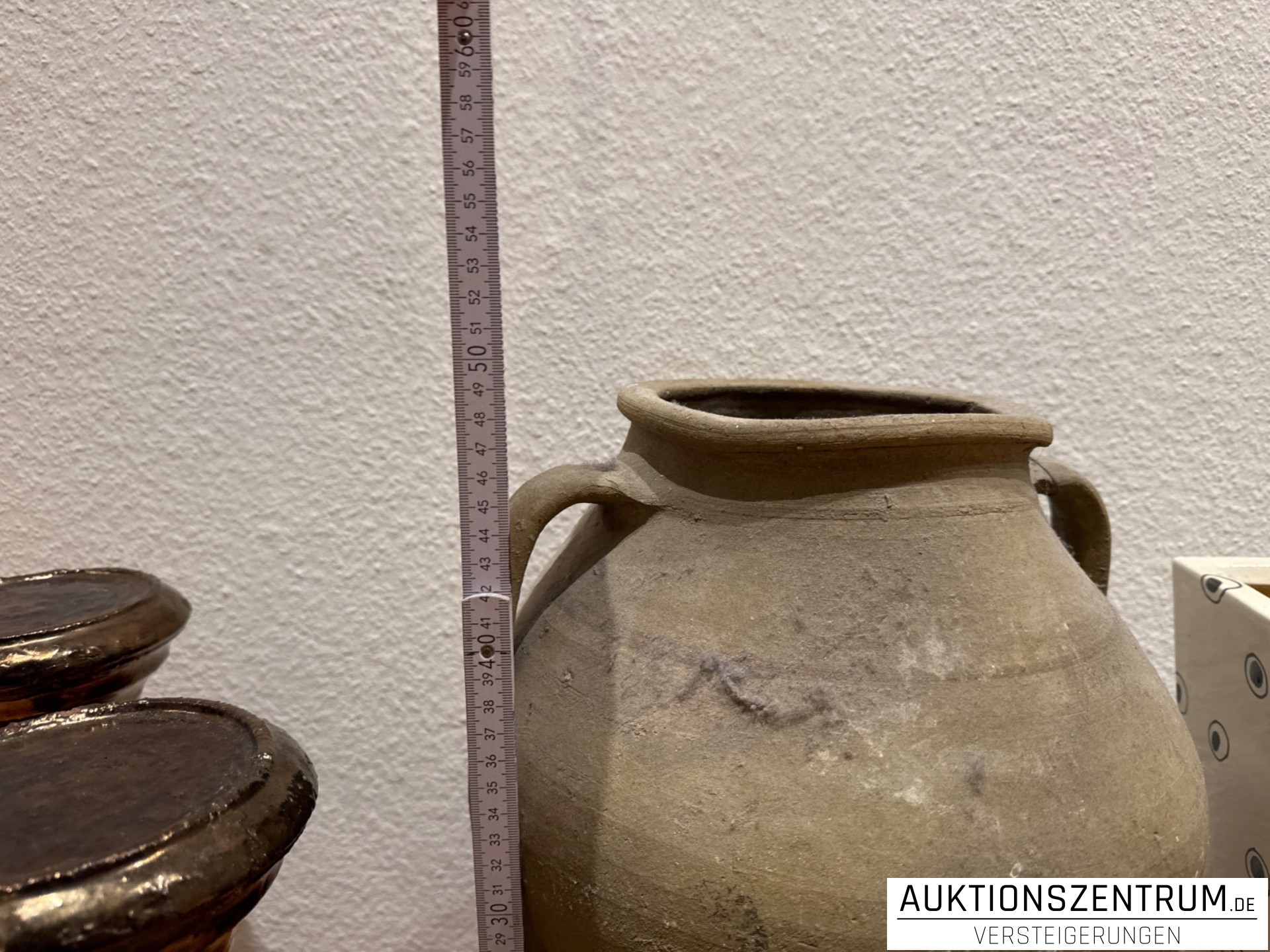 - 1 großer Terrakotta-Krug mit zwei seitlichen Henkeln, naturbelassene, matte Oberfläche, Höhe ca. 50 cm. Rustikale Ausstrahlung, gut als Bodenvasen- oder Pflanzgefäß nutzbar.