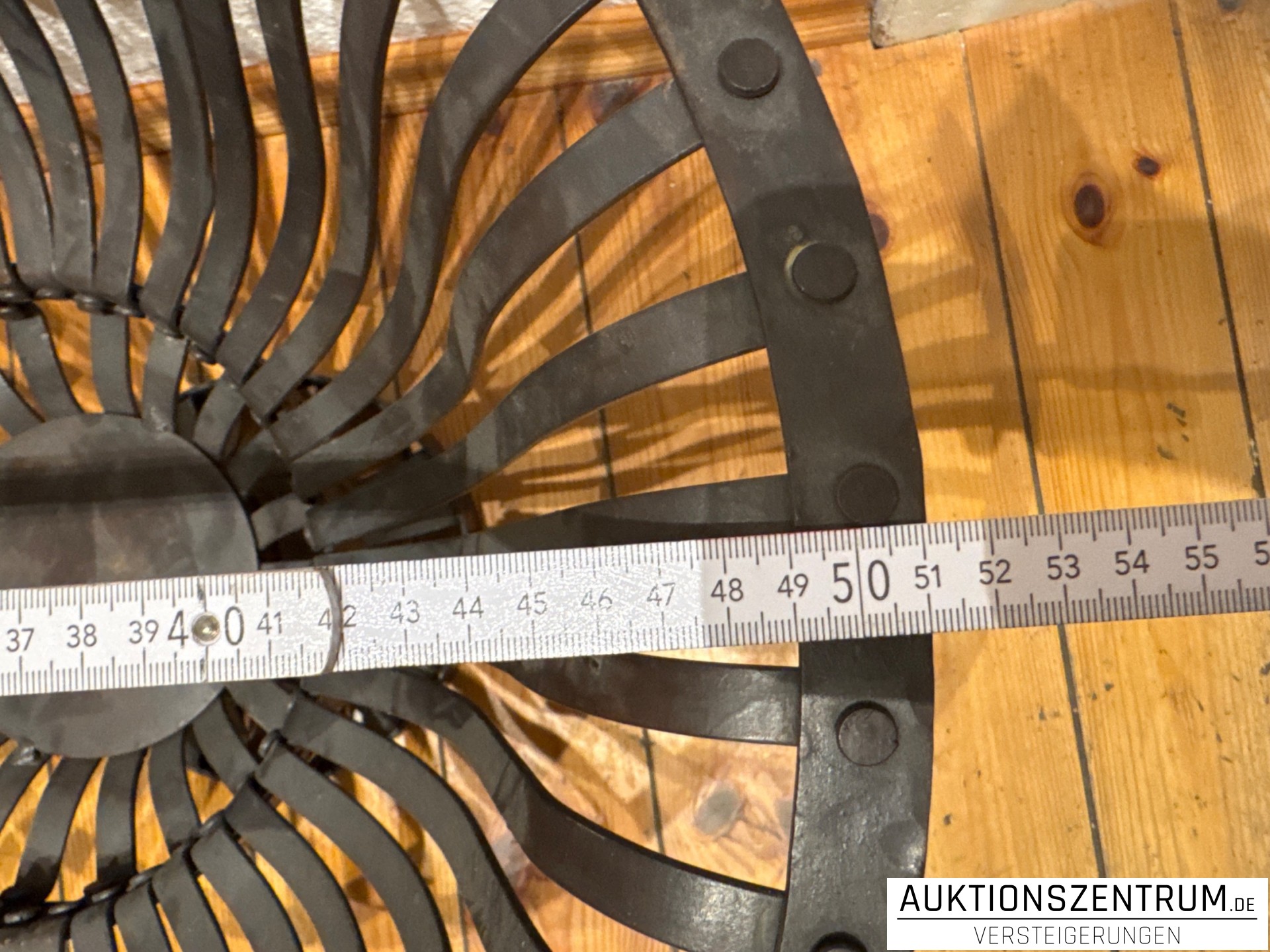 - 1 großer, runder Drahtkorb / Schale aus dunkel patiniertem Metall, aus strahlenförmig angeordneten Flachstäben gefertigt.