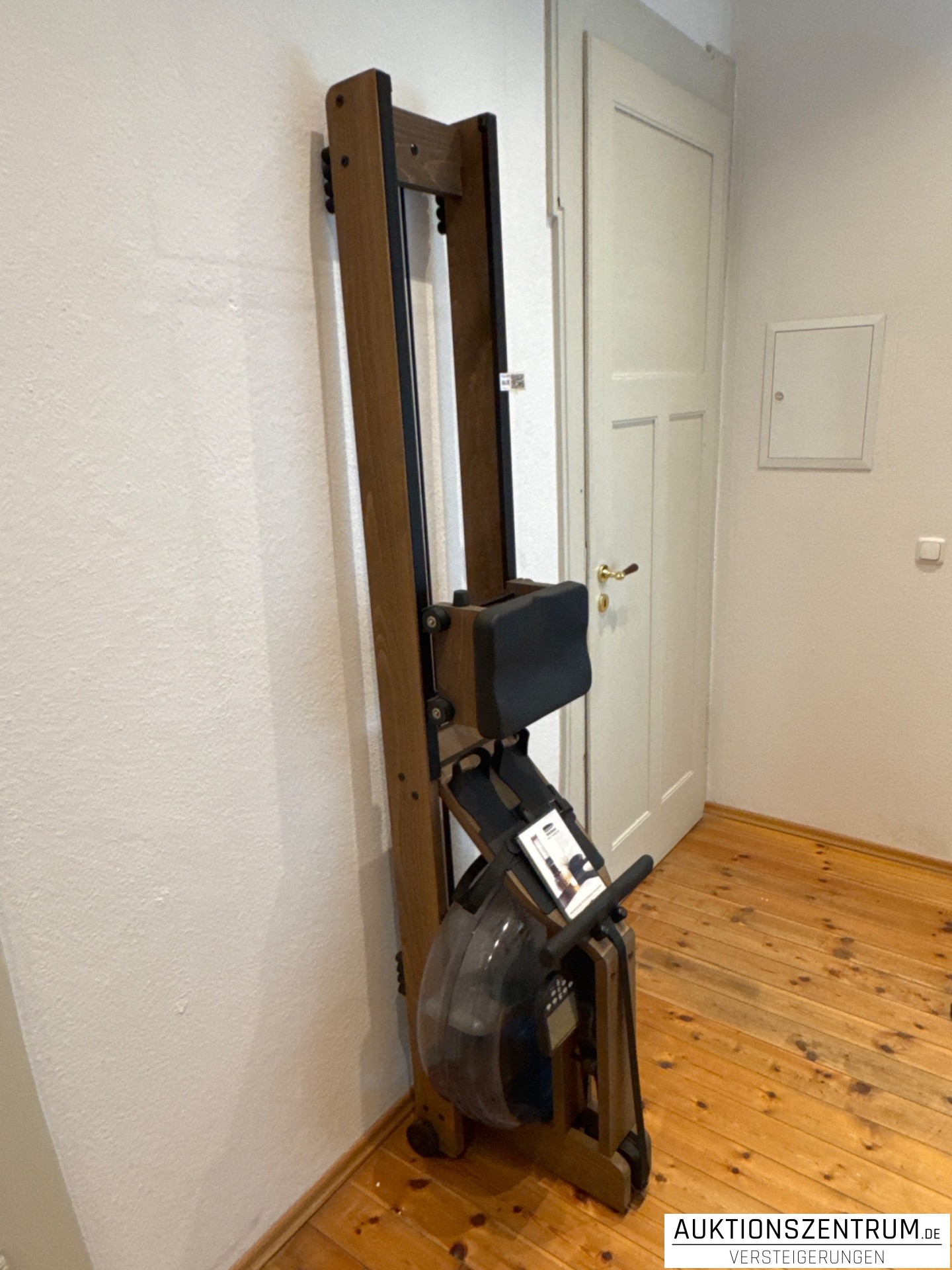 Das abgebildete Rudergerät ist ein Modell des renommierten Herstellers WaterRower, erkennbar an der charakteristischen Bauweise und dem markanten Wassertank. Es kombiniert ästhetisches Design mit realistischer Trainingsfunktion.