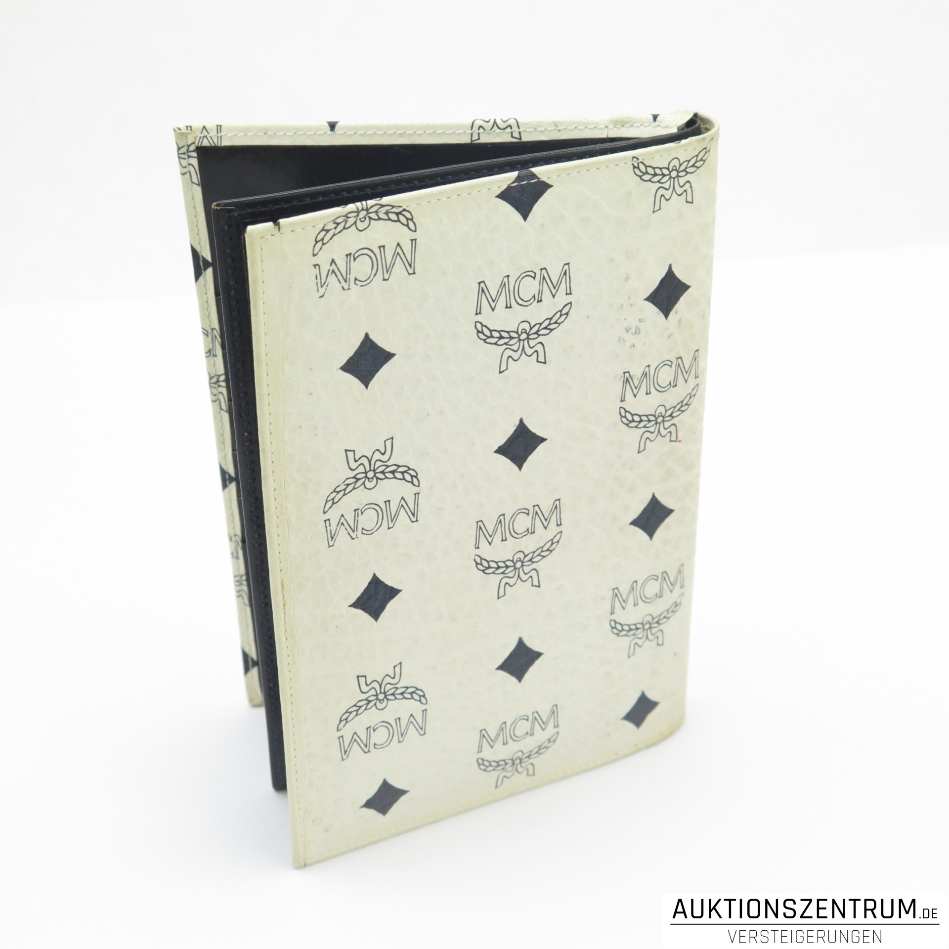 Elegante Dokumentenmappe der Luxusmarke MCM mit charakteristischem Allover-Logo-Druck auf der Außenseite. Die Mappe ist hochformatig ausgeführt und innen vollständig mit glattem, dunklem Leder ausgestattet.