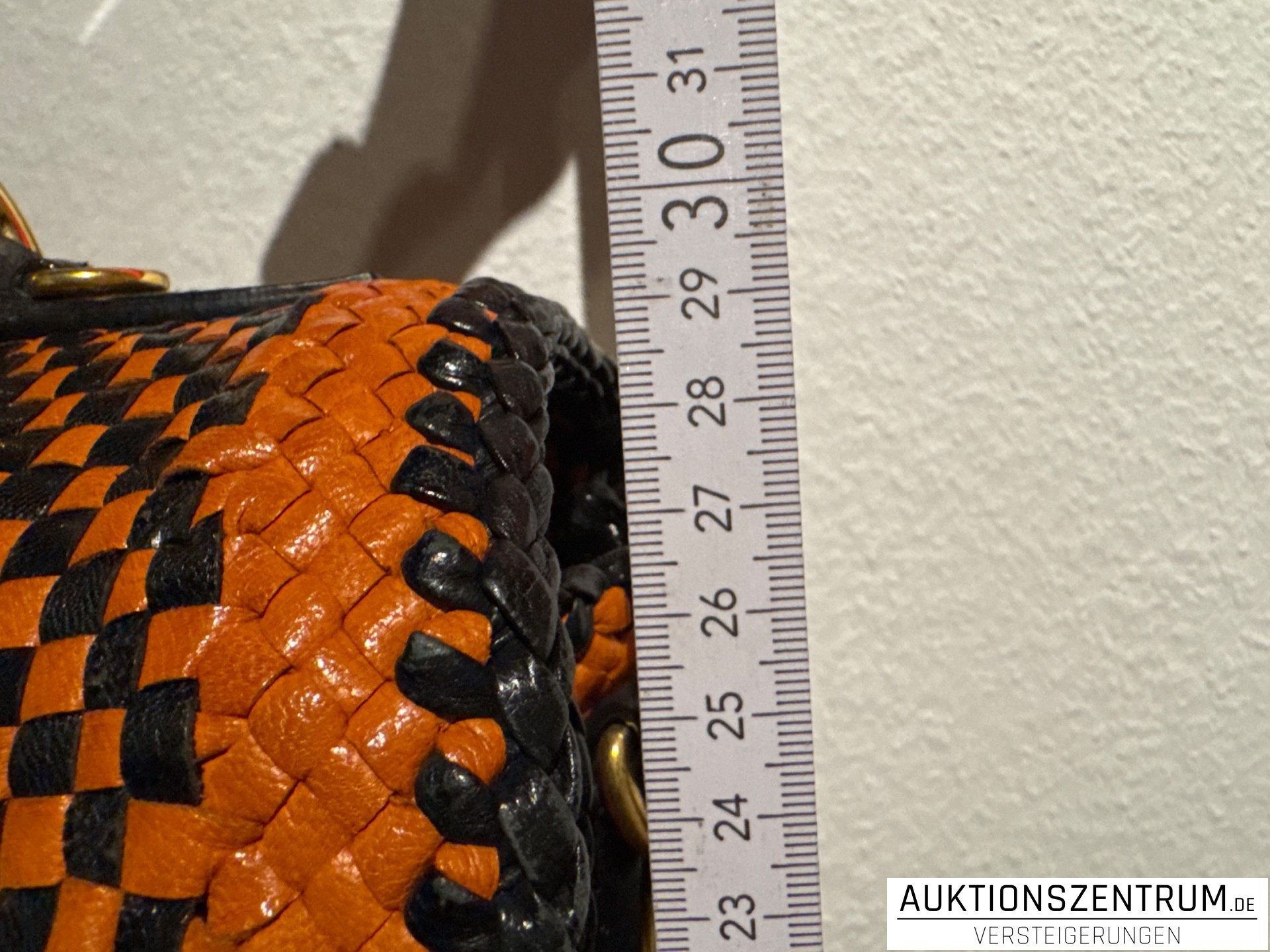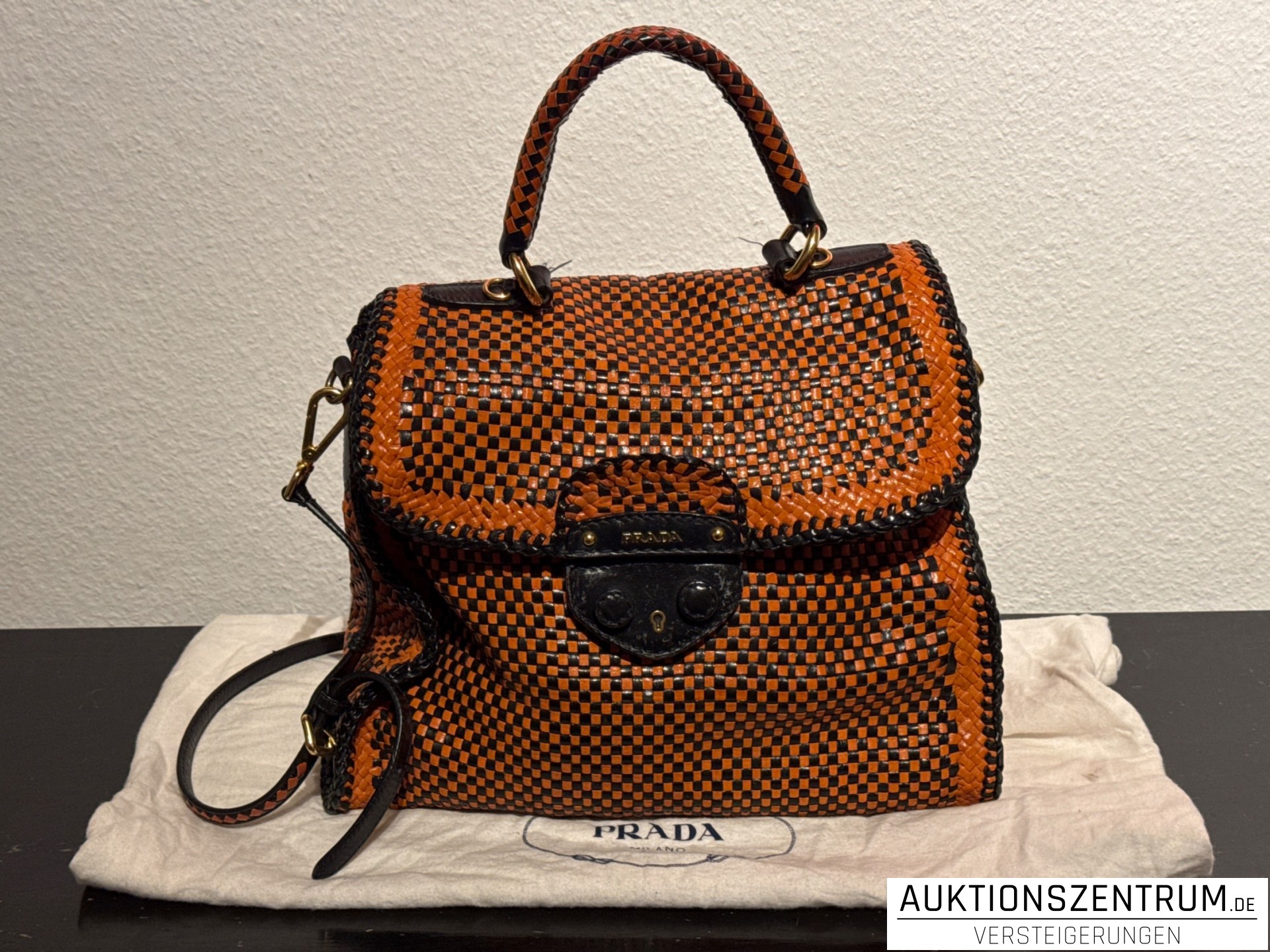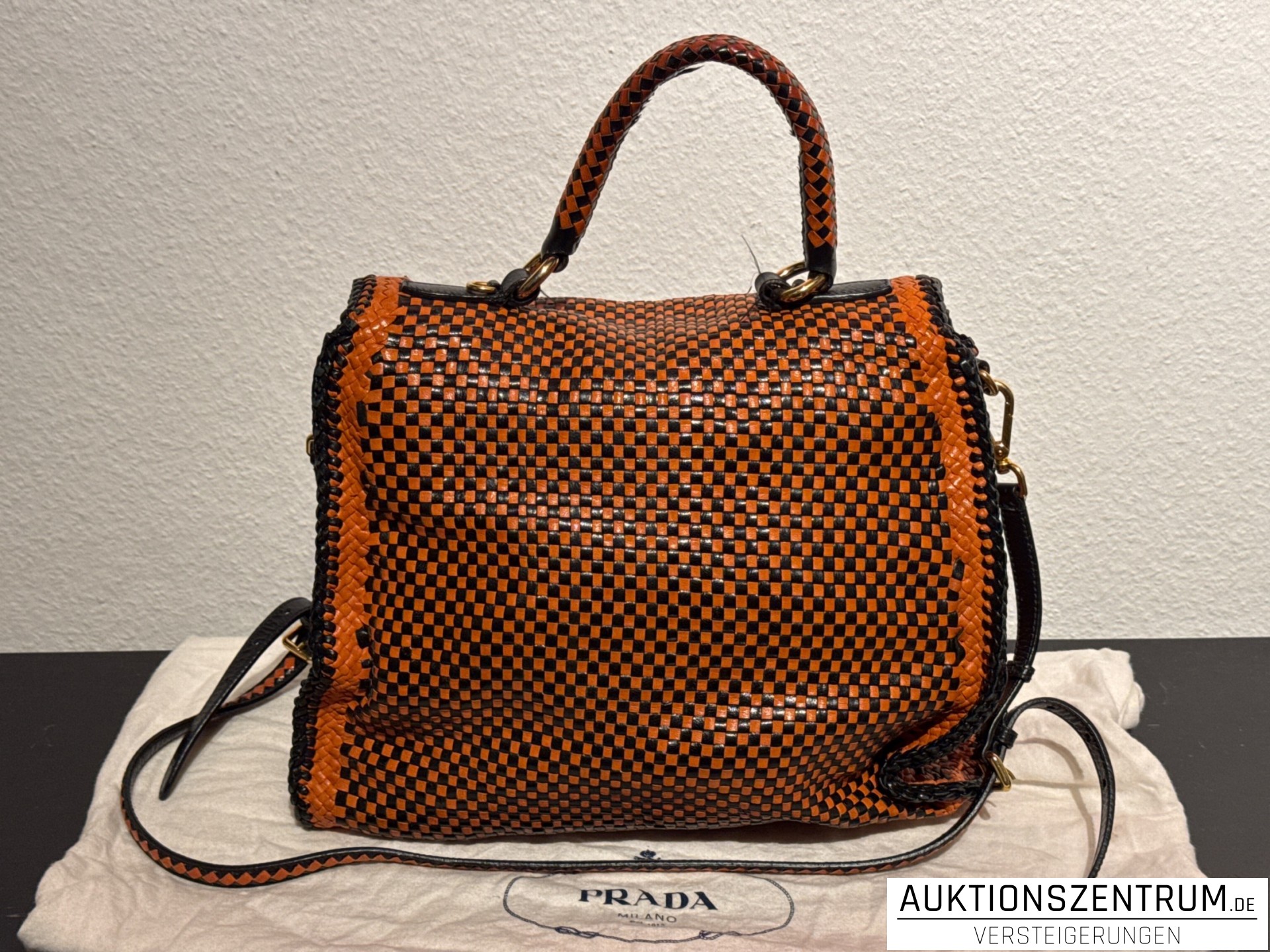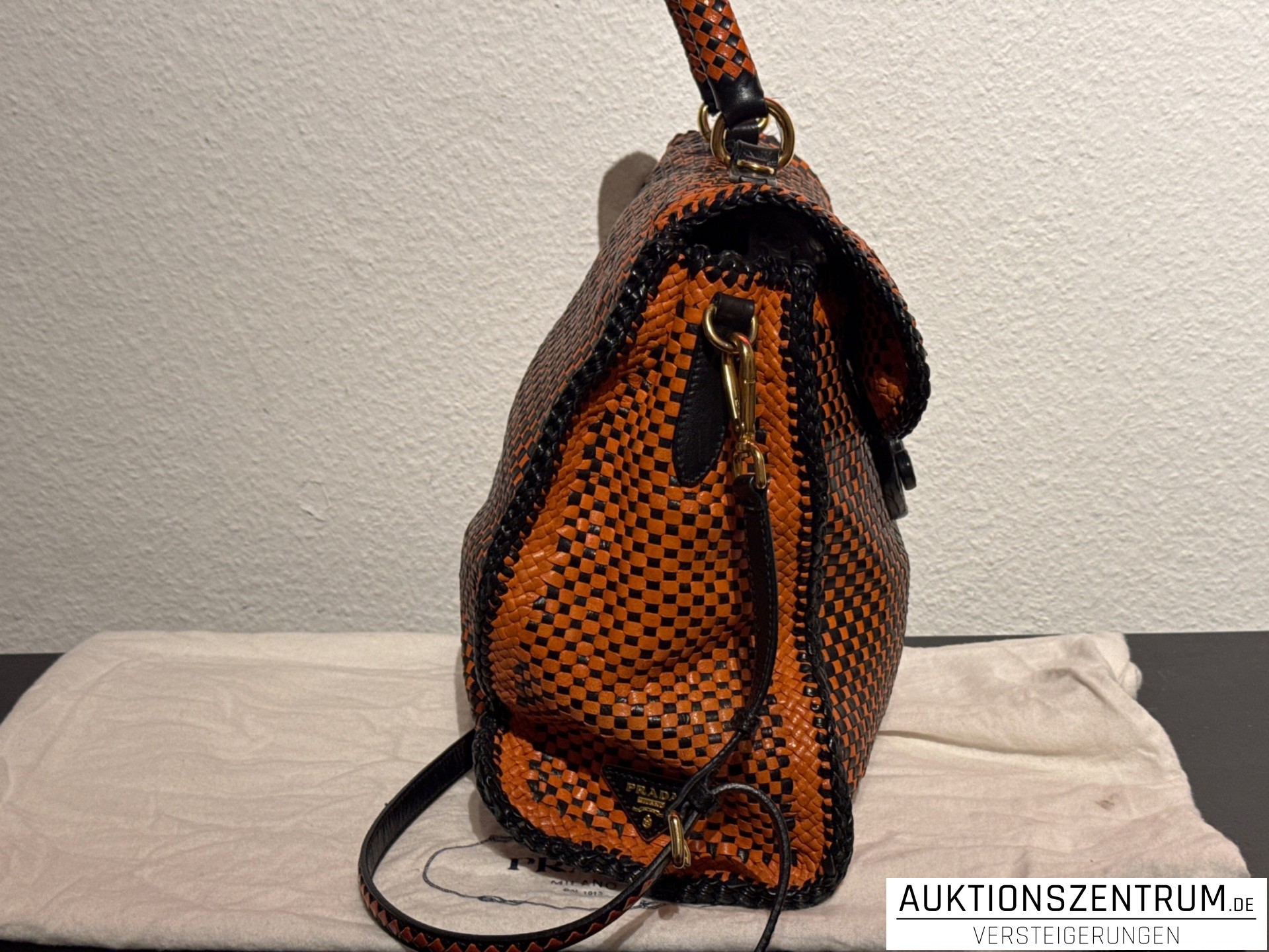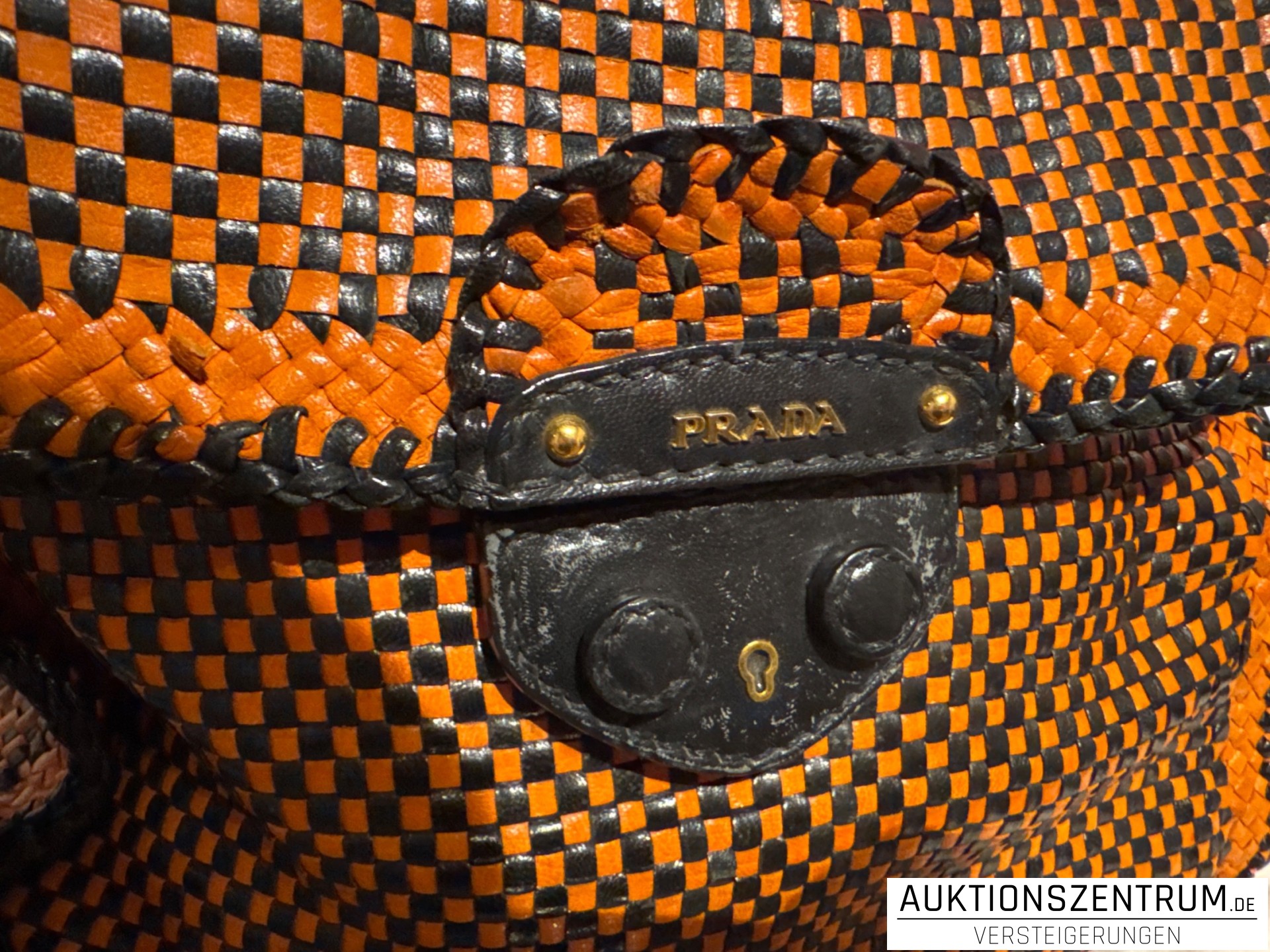 Exklusive Designer-Handtasche von Prada, Modell Madras, in markantem zweifarbigem Flechtmuster. Die Tasche ist aus geflochtenem Leder gearbeitet und zeigt ein kontrastreiches Karomuster in Orange und Schwarz mit umlaufenden, betont breiten Lederkanten.