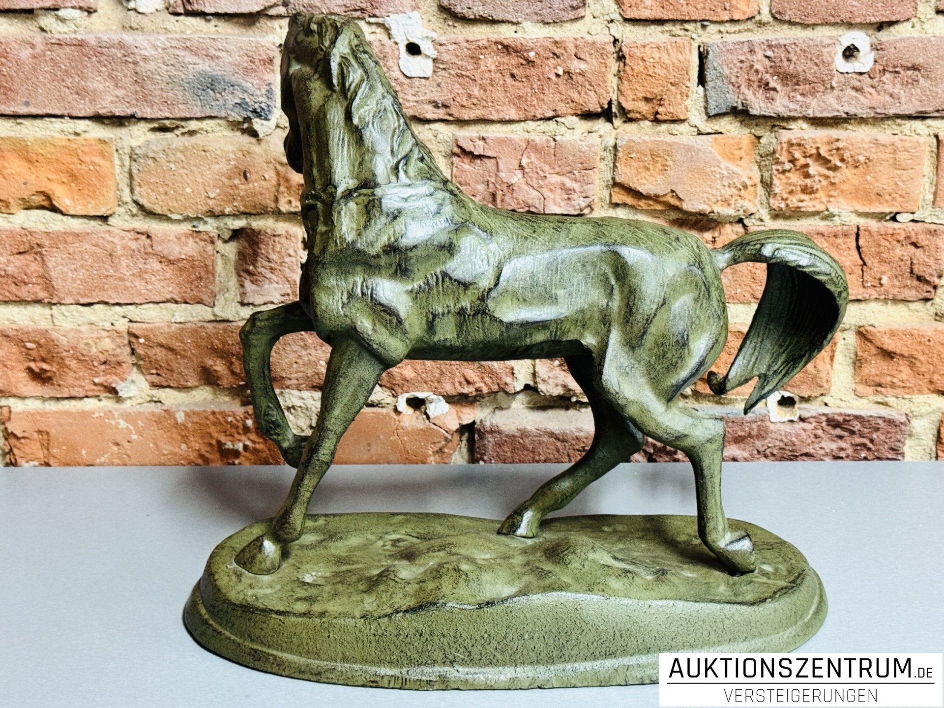 Ausdrucksstarke Bronzeplastik eines schreitenden Pferdes auf ovaler Plinthe.