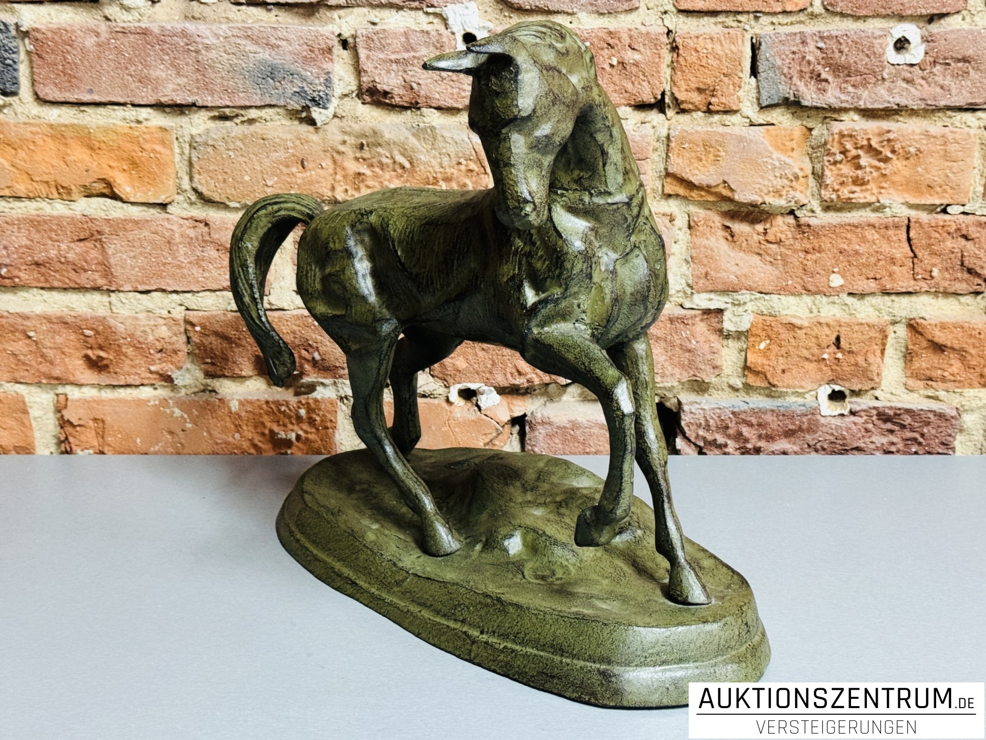 Die muskulöse Anatomie des Tieres ist plastisch herausgearbeitet, der Schweif elegant geschwungen, der Kopf leicht gesenkt.