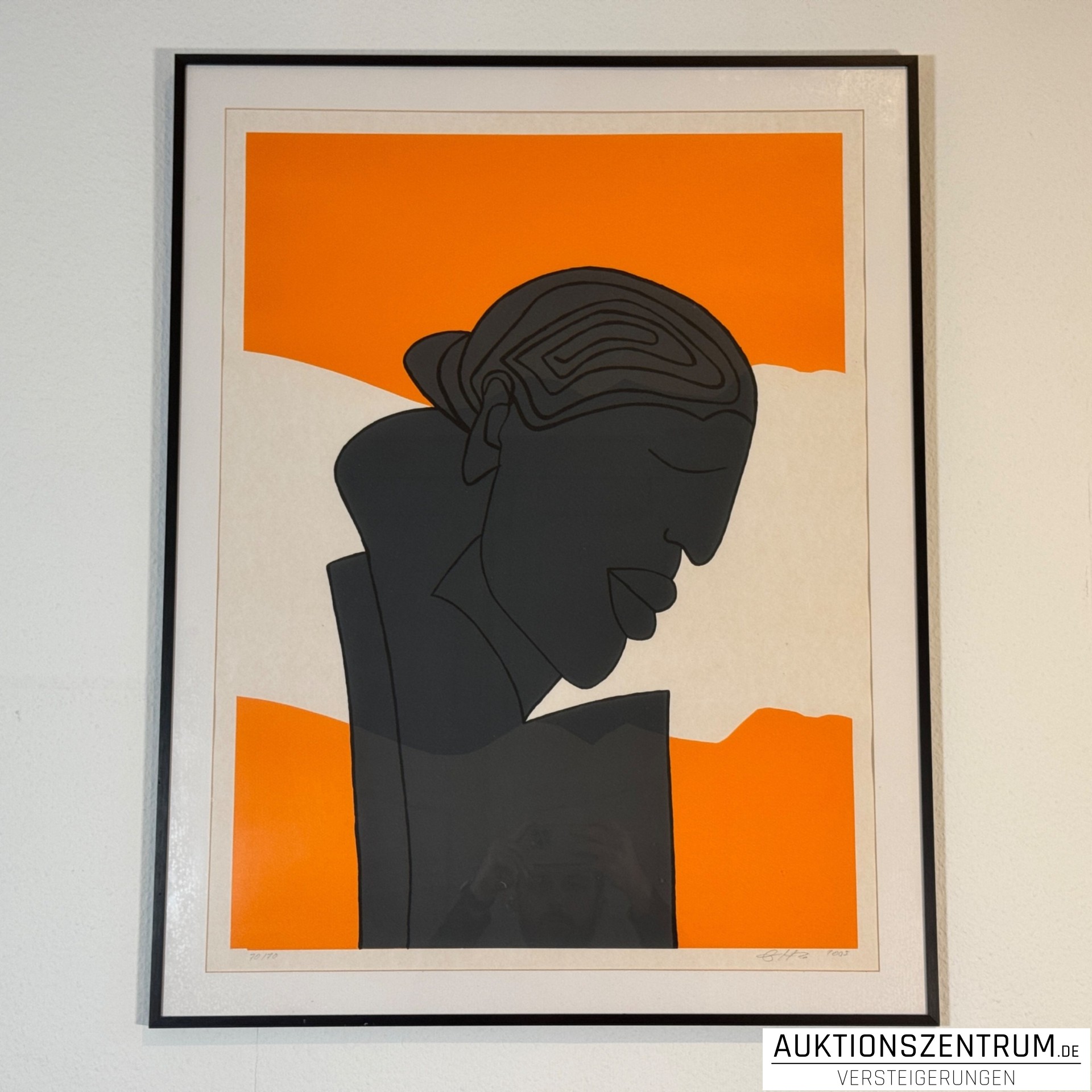 Farbdruck in kräftiger, flächiger Farbigkeit mit stilisiertem Profilkopf vor leuchtendem Hintergrund. Unten rechts im Druckfeld mit Bleistift signiert „C. Hinze 2005“, links unten mit der Auflagenbezeichnung „70/70“ versehen.