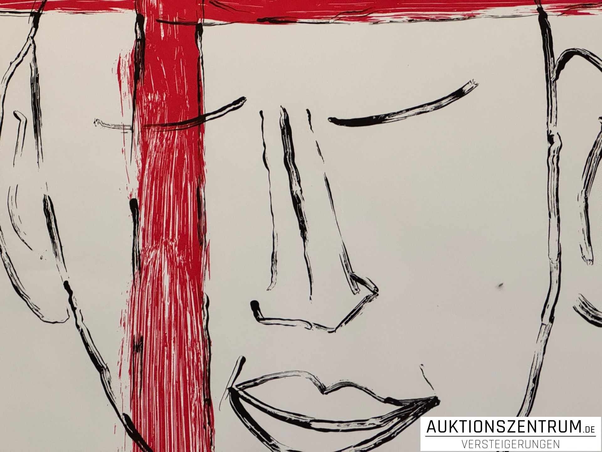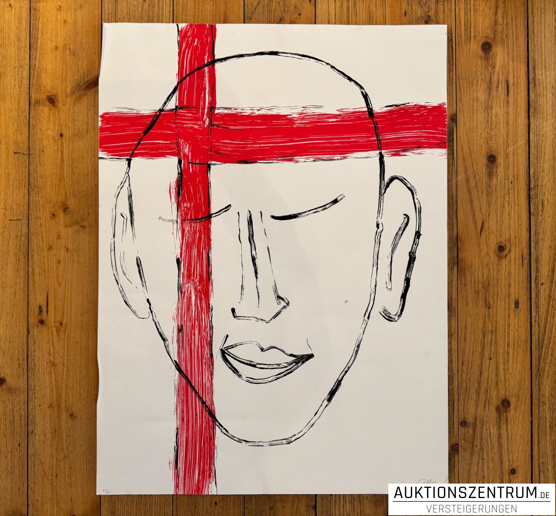 Ausdrucksstarke, reduzierte Komposition mit frontalem Gesicht, das von einem kräftigen roten Kreuz überlagert wird. Der Druck überzeugt durch klare Linienführung und einen markanten Farbkontrast zwischen Schwarz und Rot.