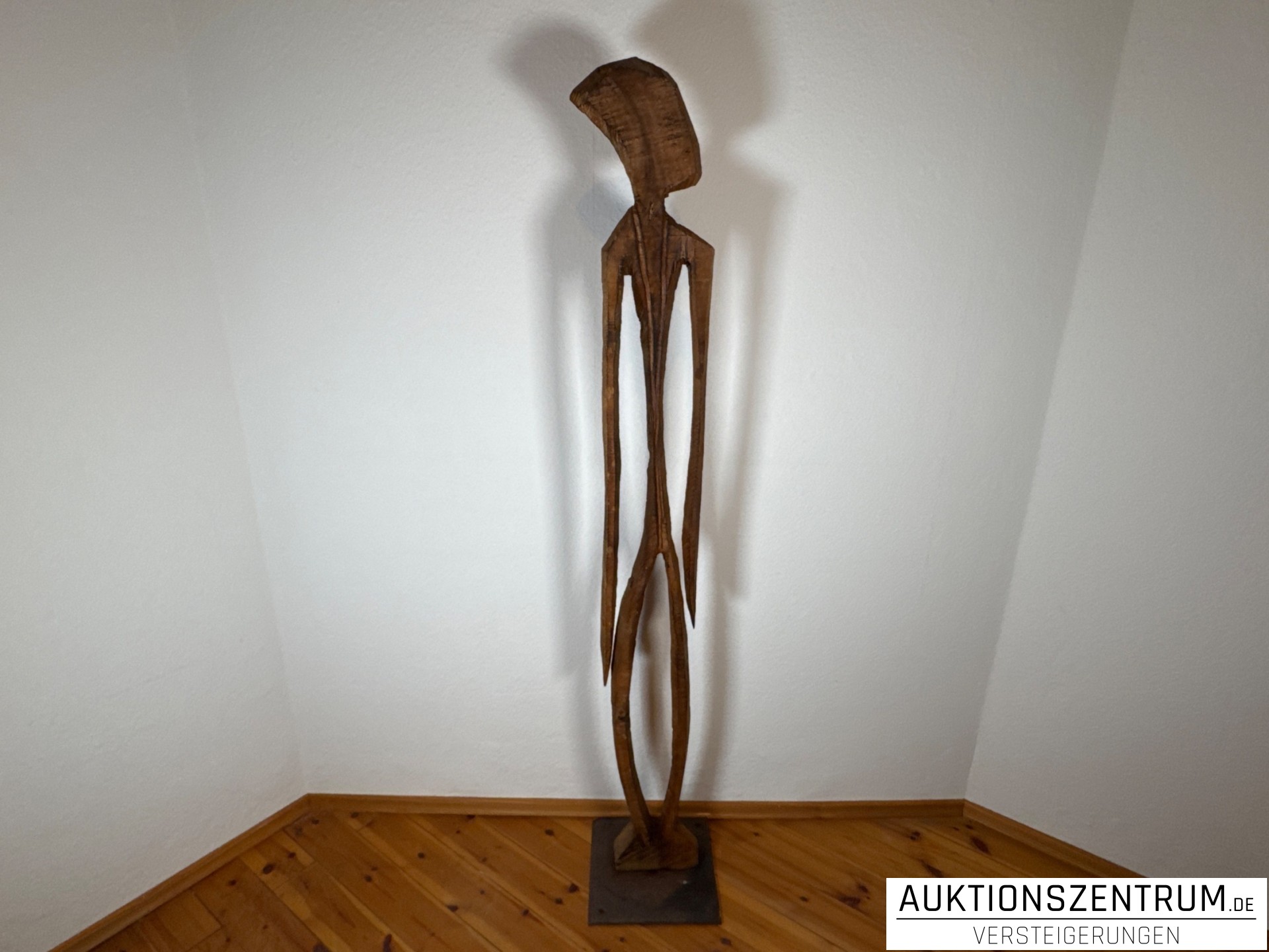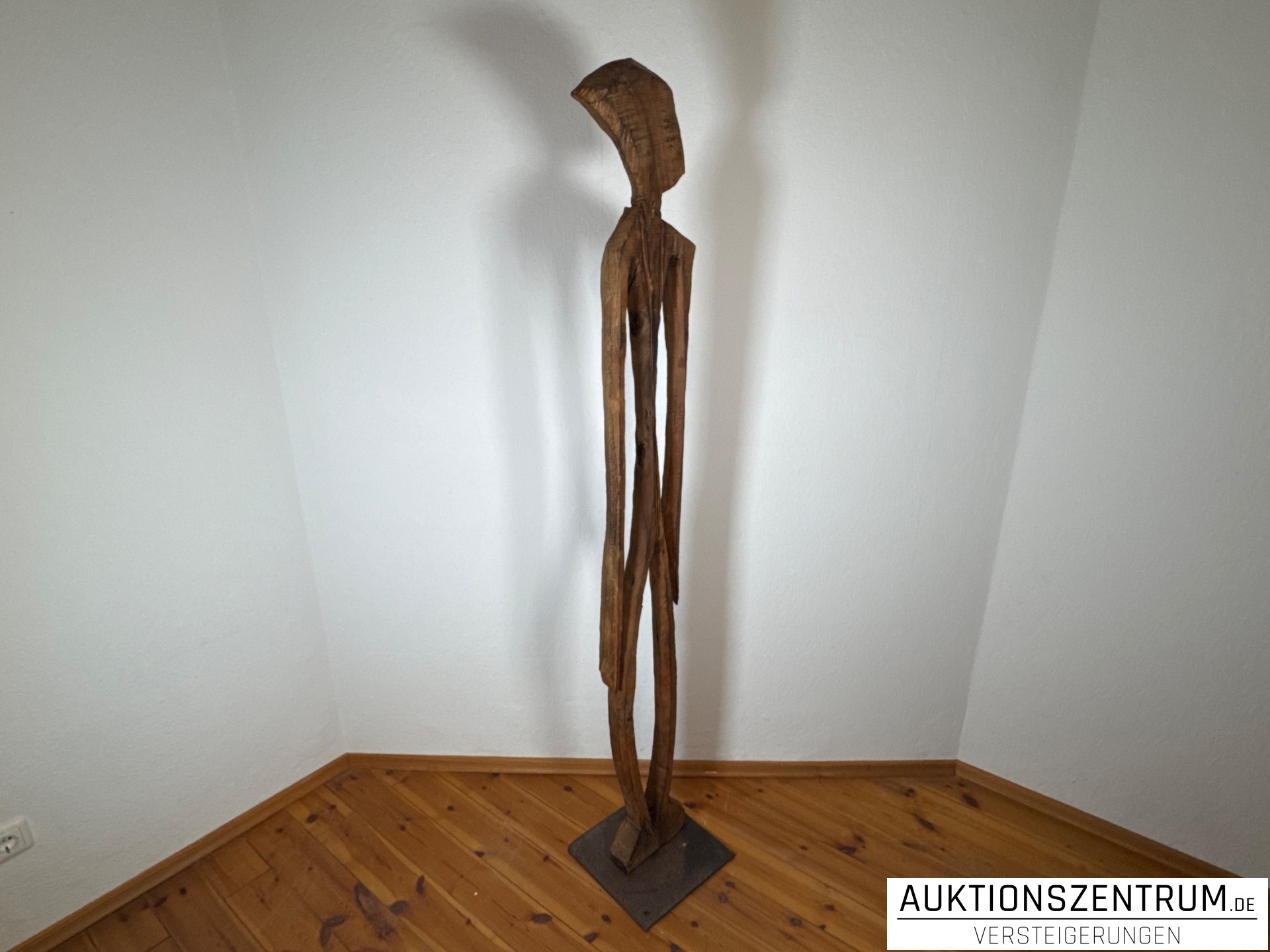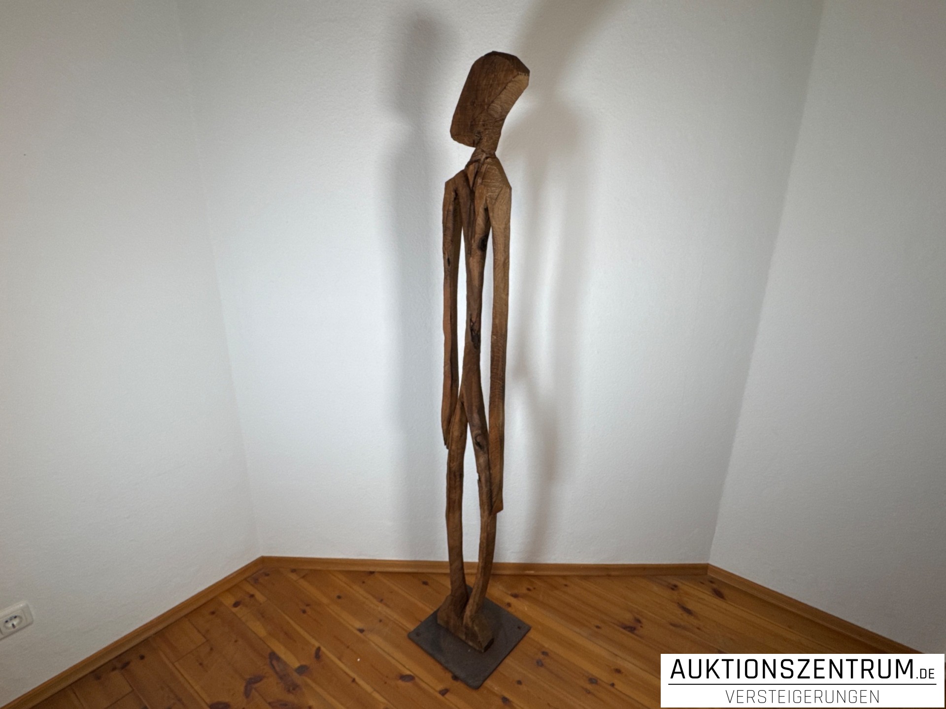 Expressive, hochaufragende Figurenskulptur aus Holz mit stark reduzierter, langgestreckter Silhouette. Die Oberfläche ist bewusst roh belassen, mit deutlich sichtbaren Spuren des Hackens und Sägens, wodurch ein lebhaftes Licht- und Schattenspiel entsteht. Die abstrahierte Gestalt steht auf einer Basisplatte und wirkt trotz der schlanken Proportionen äußerst präsent im Raum.