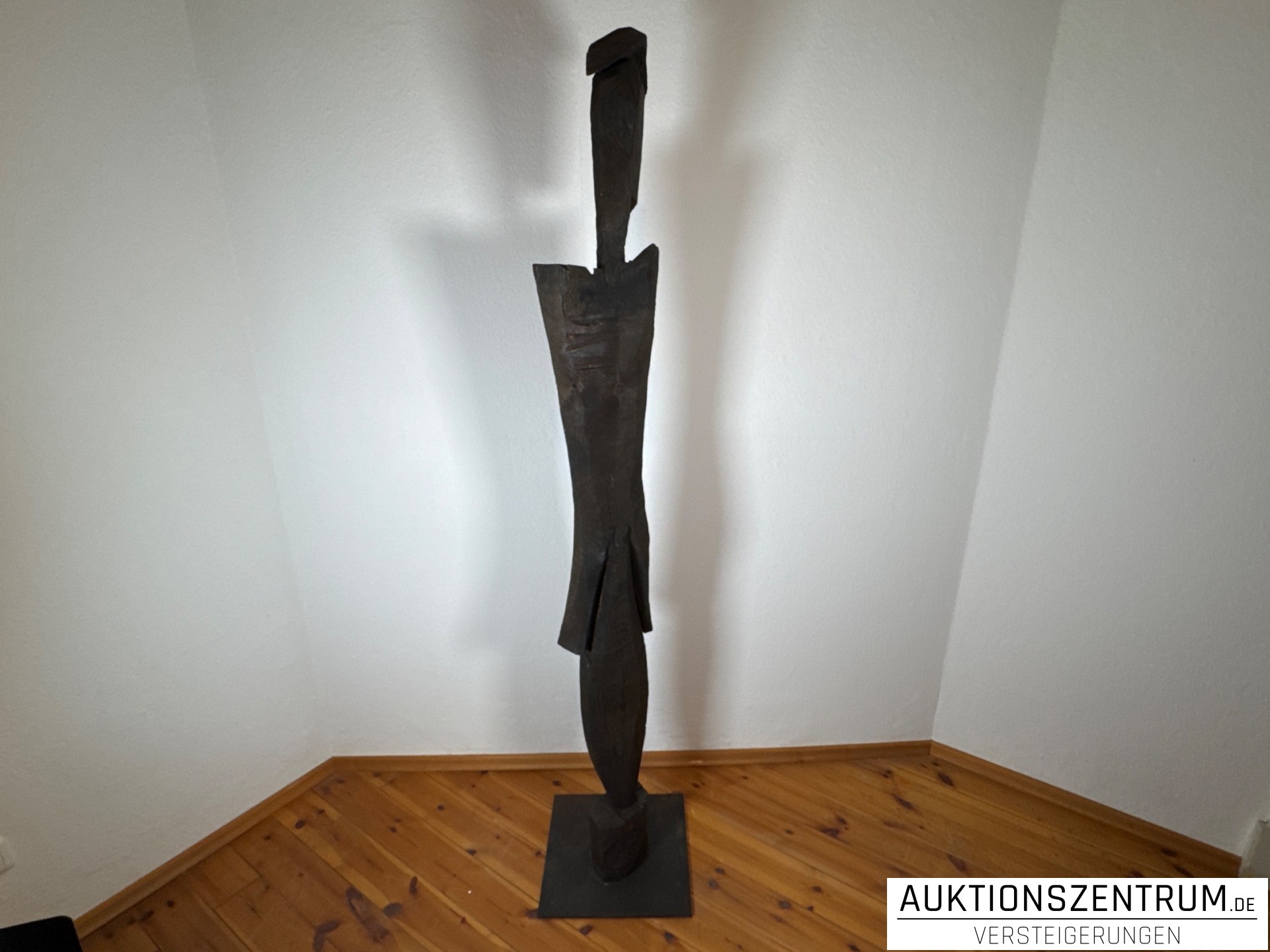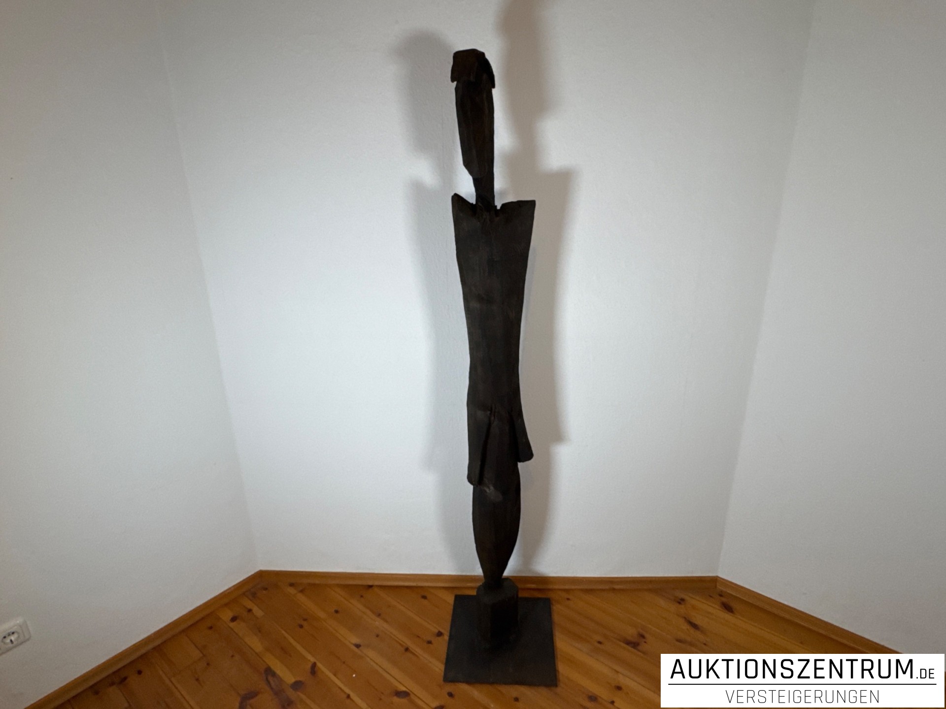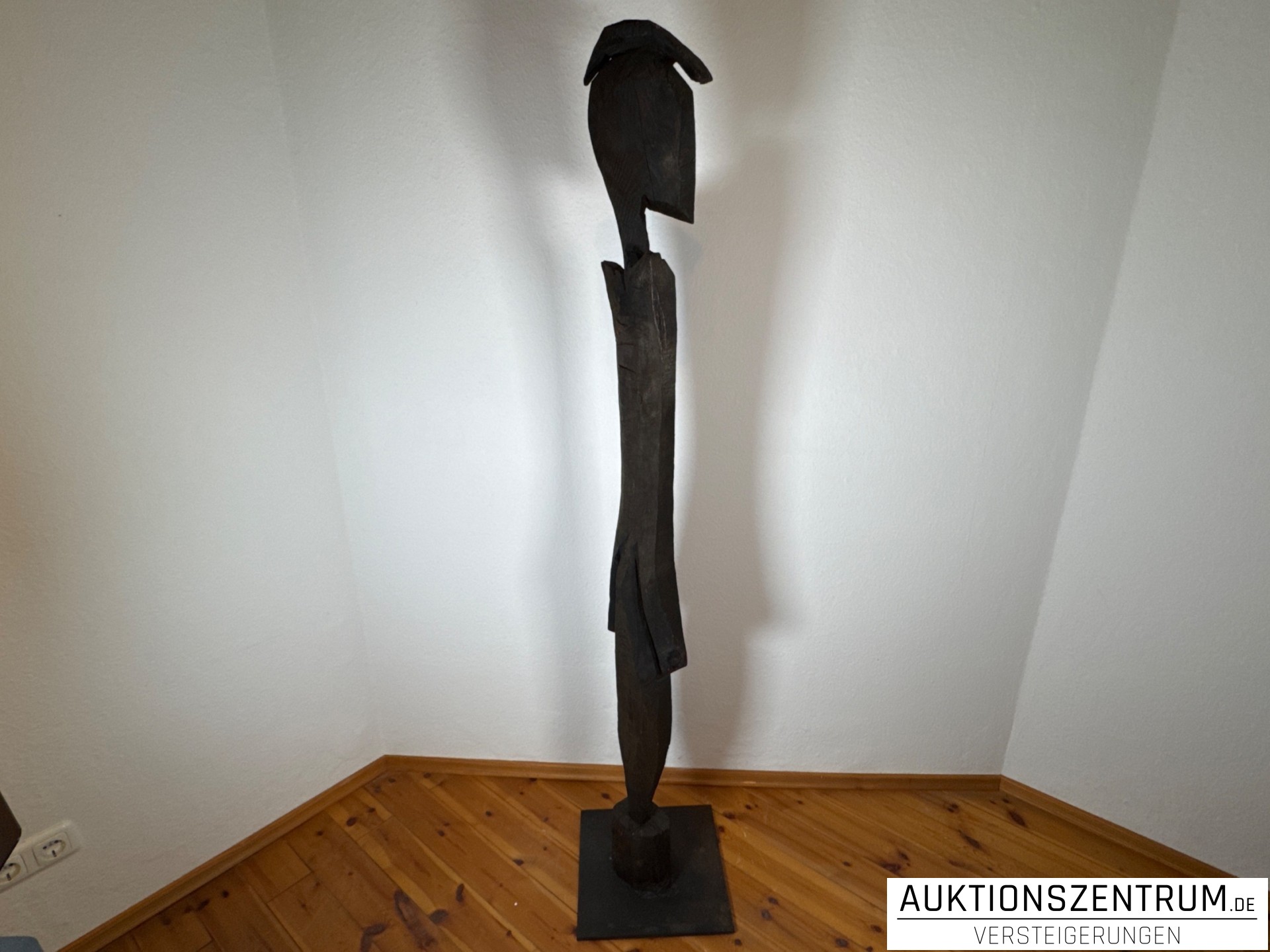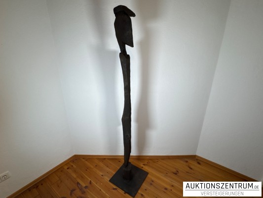 Chris Hinzes aAusdrucksstarke, hochaufragende Holzskulptur, in grob gehackter und angesägter Technik gearbeitet. Die abstrahierte, vertikal betonte Figur steht auf einer rechteckigen Basis und überzeugt durch ihre klare Silhouette und die lebendige Oberflächenstruktur des Holzes.