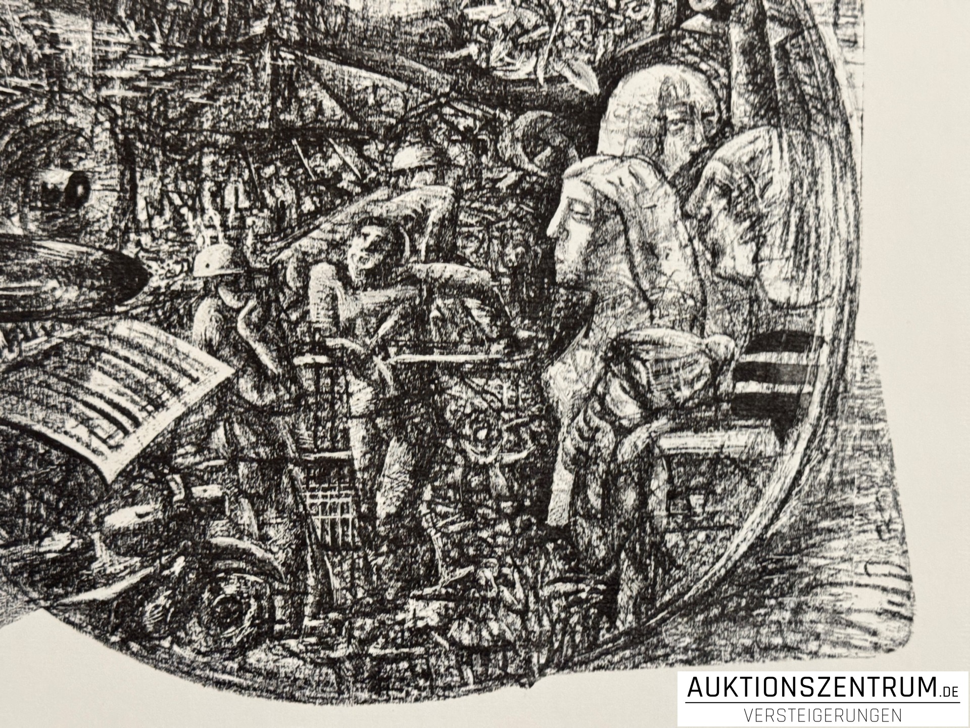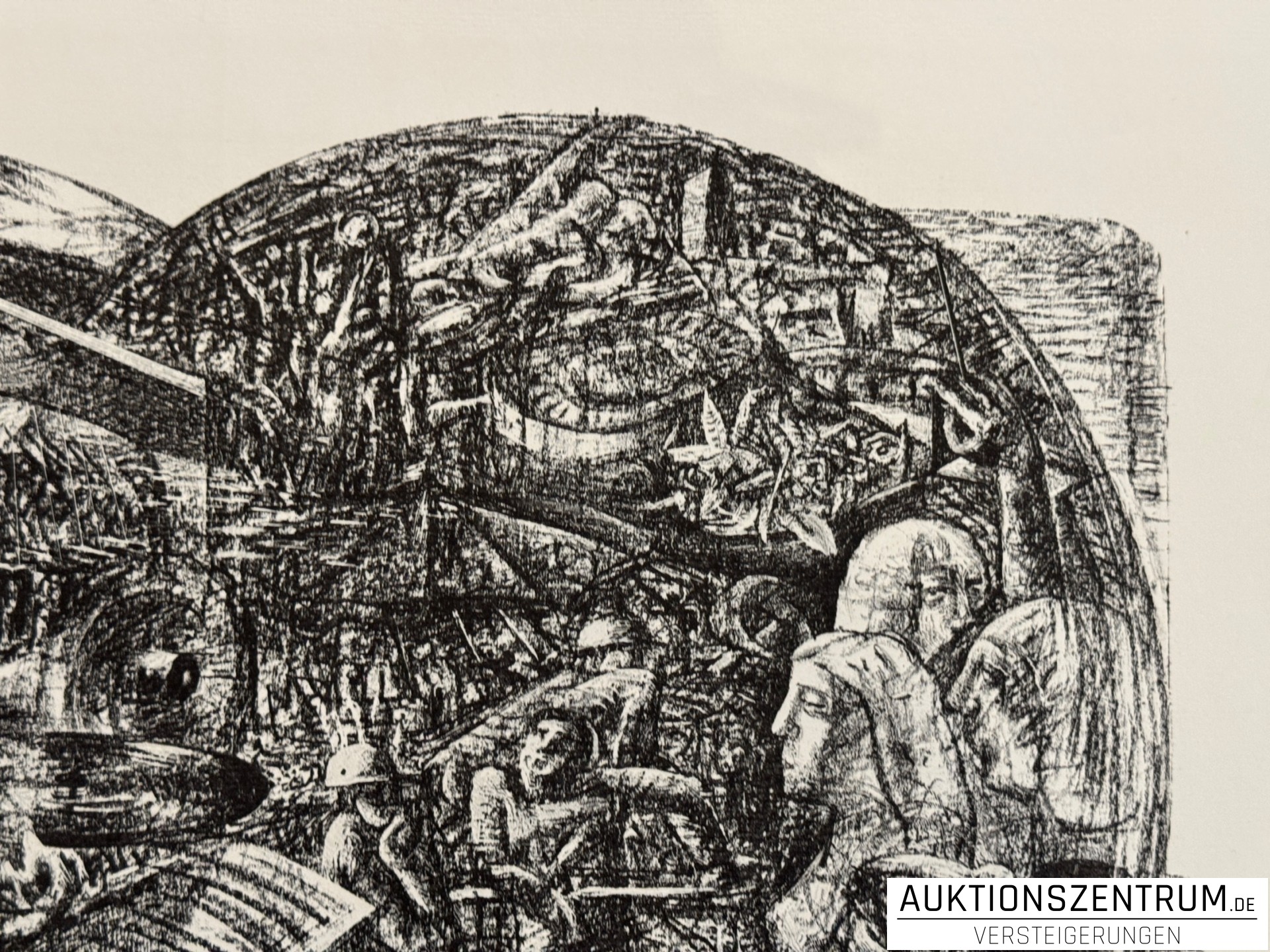 Detailreich ausgearbeitete, schwarzweiße Komposition mit vielschichtiger Figuren- und Architekturdarstellung. Sammlerblatt aus einer limitierten Auflage, geeignet zur Rahmung und als markanter Blickfang in Wohn- oder Arbeitsräumen.