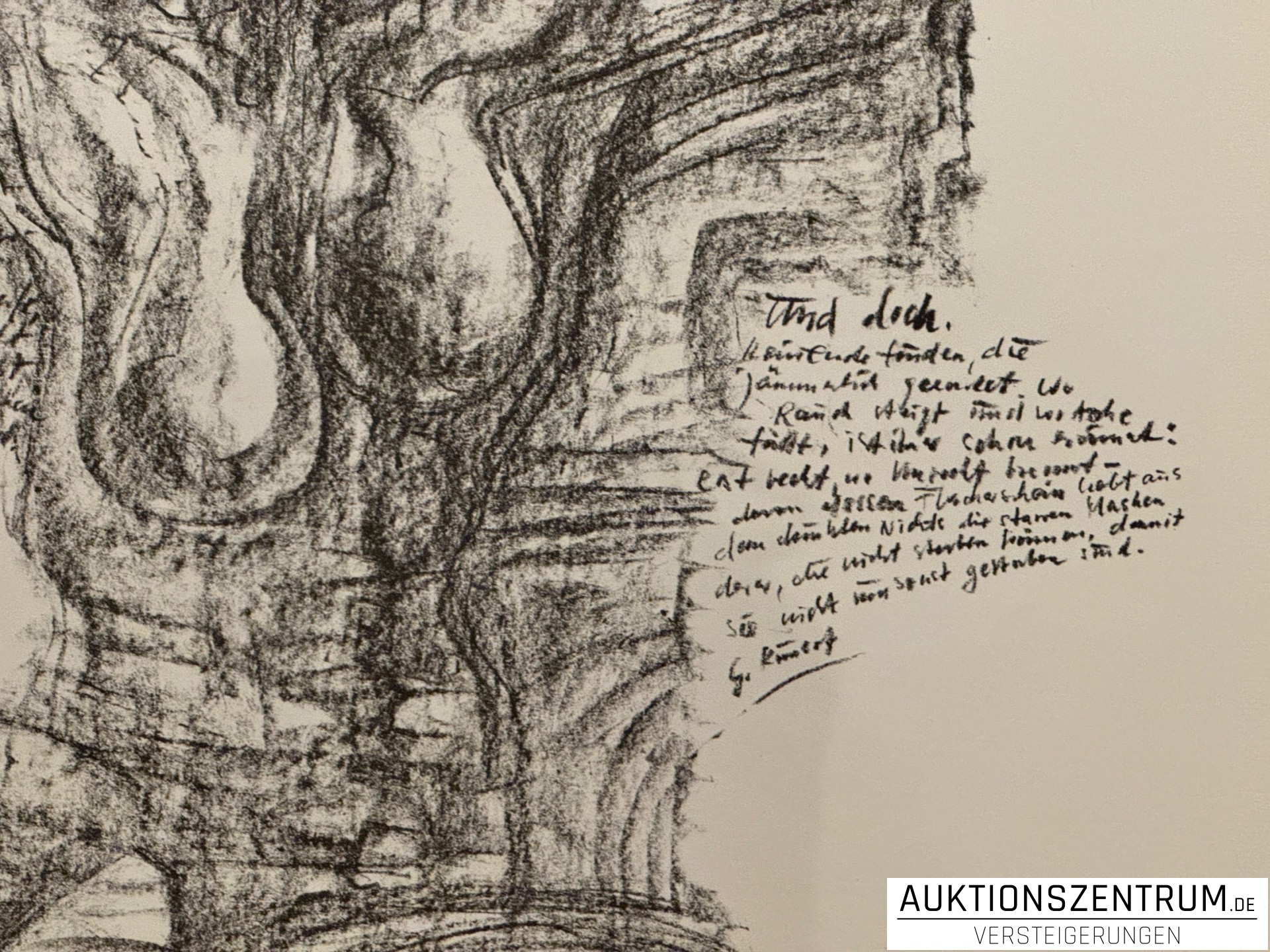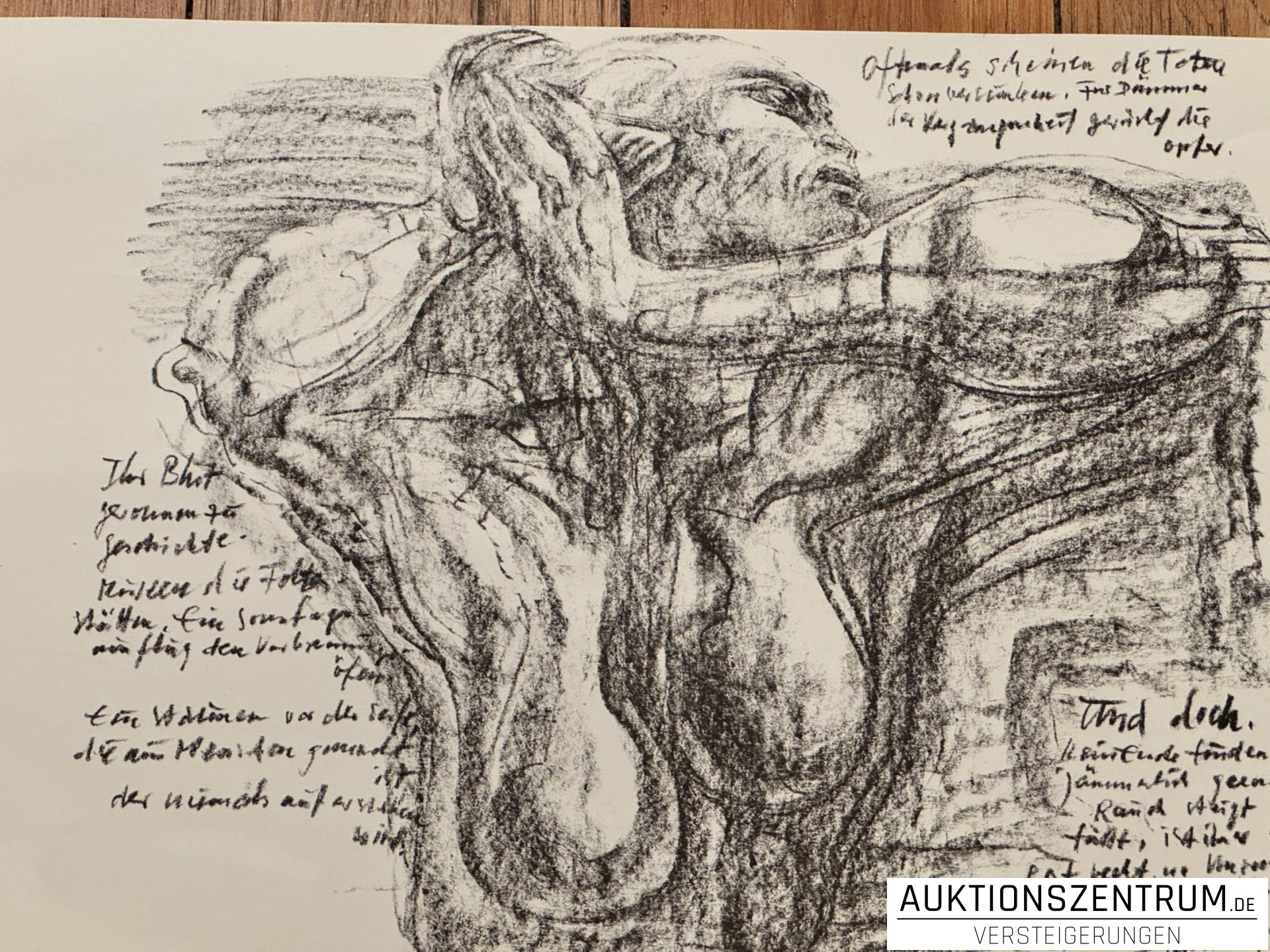 Ausdrucksstarke, figürlich-abstrakte Komposition in Schwarz, ausgeführt als Lithografie auf Papier. Die vertikal angelegte Darstellung zeigt einen monumentalen, plastisch modellierten Körper mit dynamisch verschlungenen Formen und handschriftlichen Textpassagen von Günter Kunert im Bildfeld.