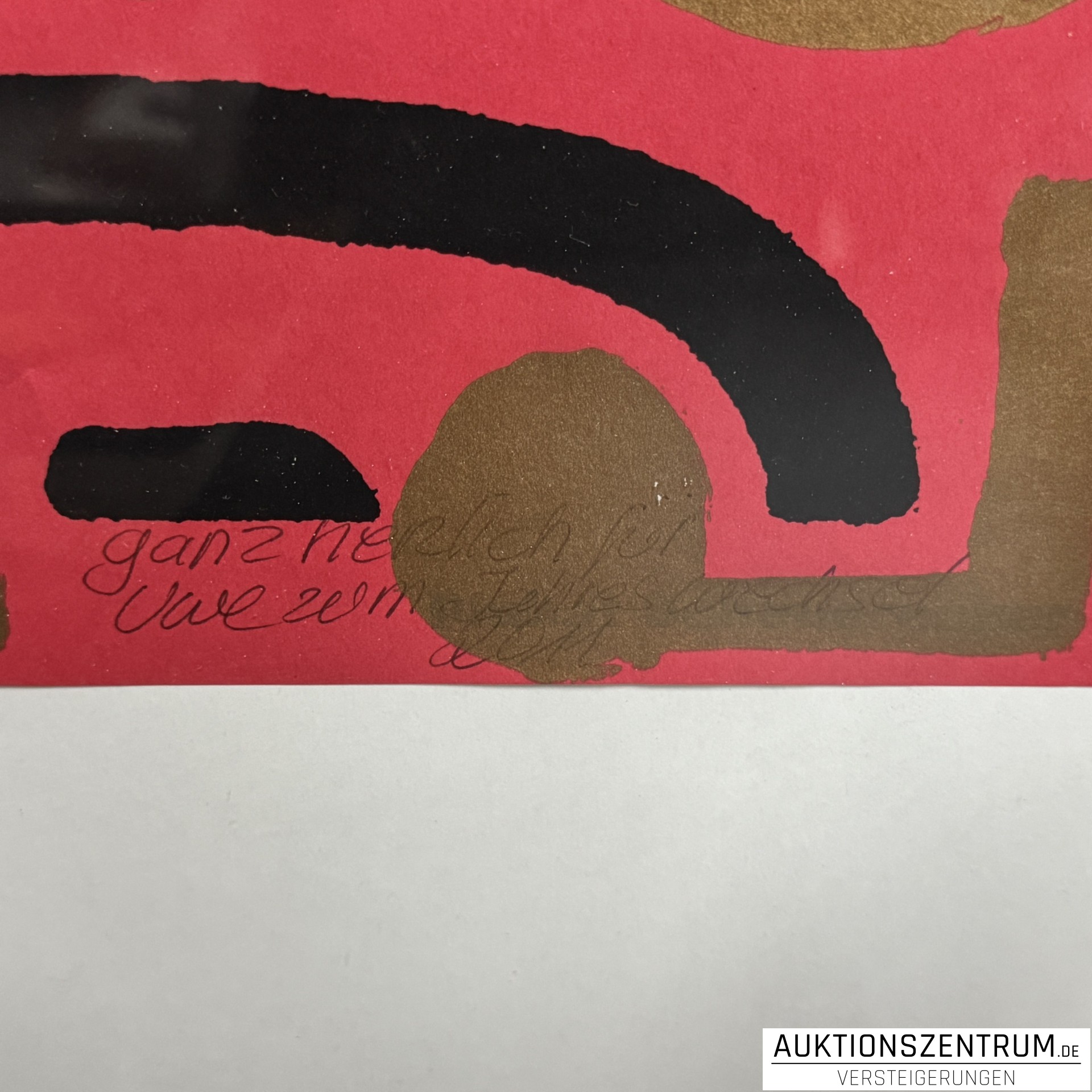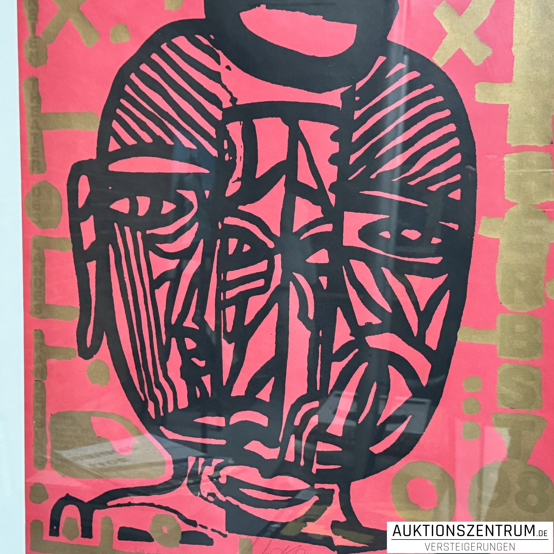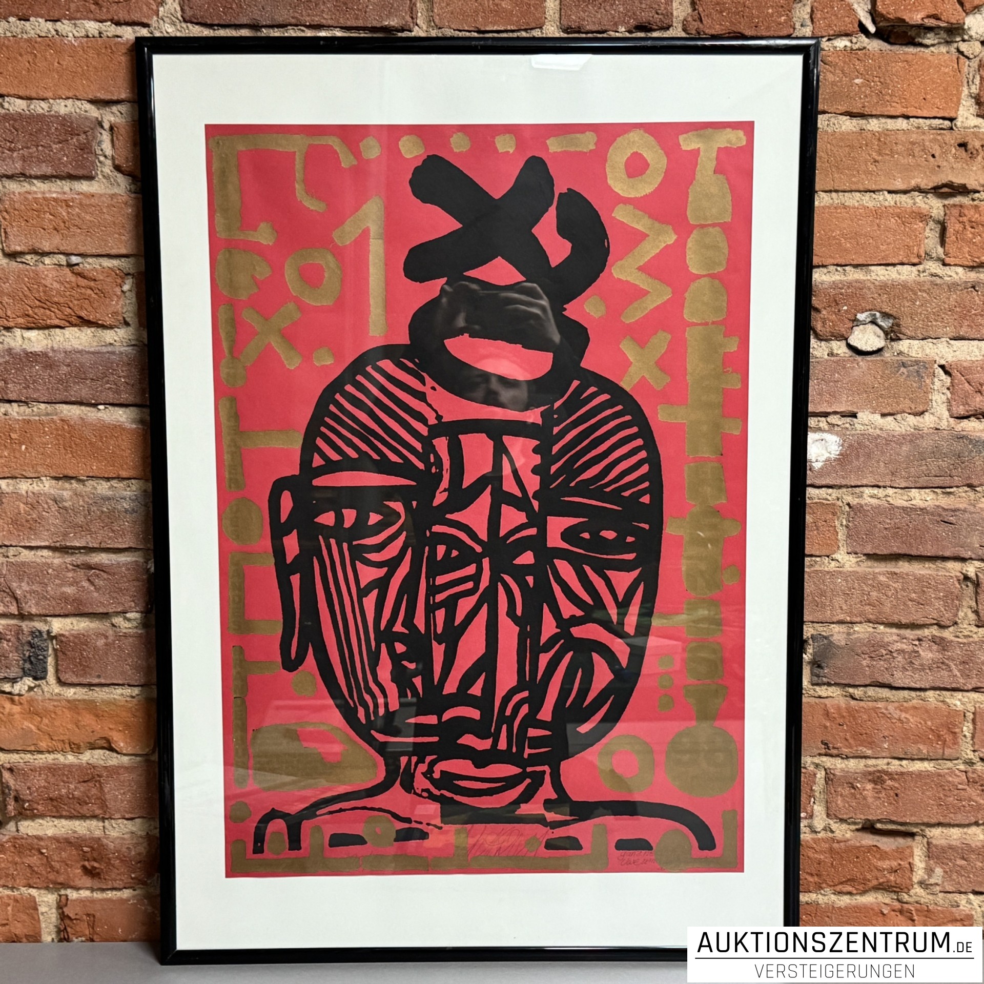 Farbsiebdruck in kräftiger Rot-, Schwarz- und Goldfarbigkeit mit abstrahiertem Kopfmotiv, gerahmt.