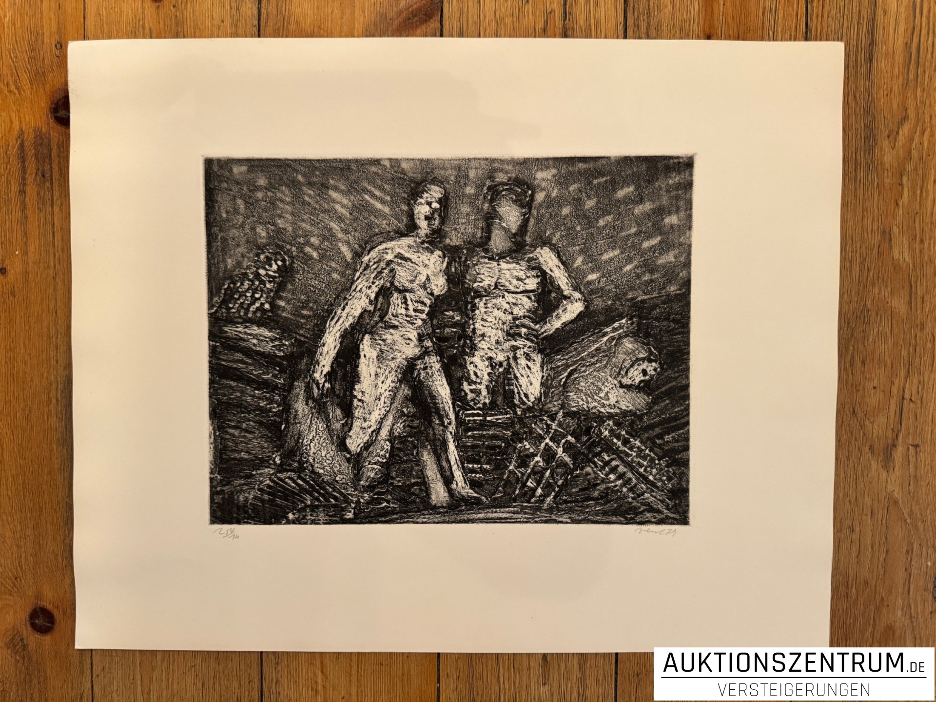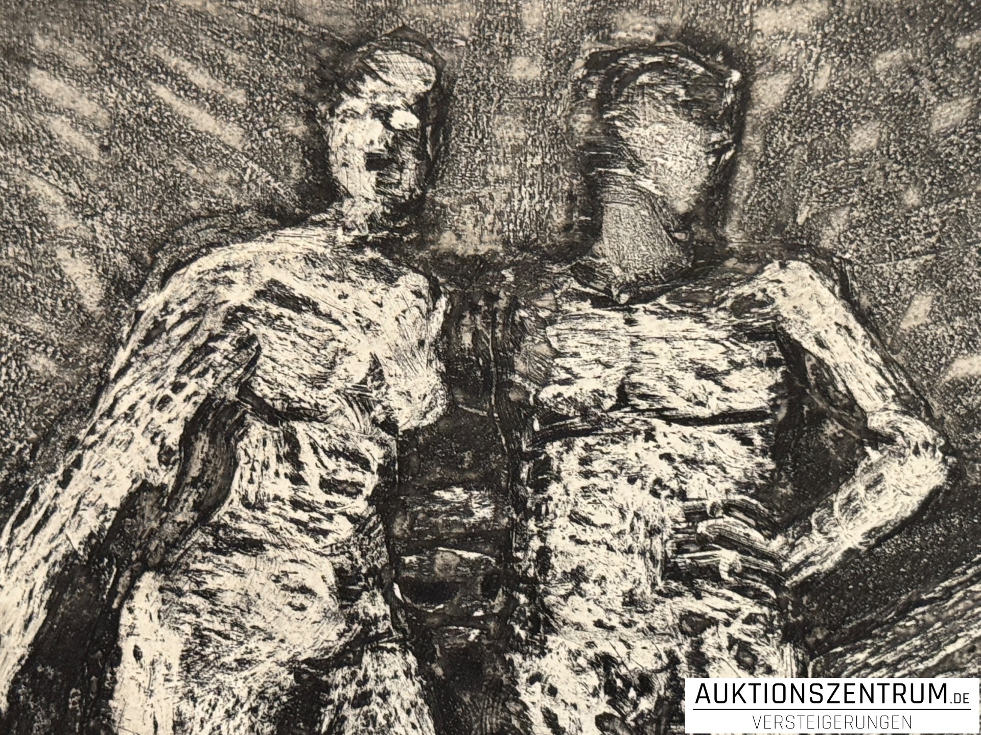 Die Arbeit zeigt ein figürliches Motiv mit zwei stehenden Gestalten in kraftvoller, expressiver Schwarz-Weiß-Gestaltung. Charakteristisch ist die pastose, strukturreiche Strichführung, die den Figuren eine plastische Wirkung verleiht.