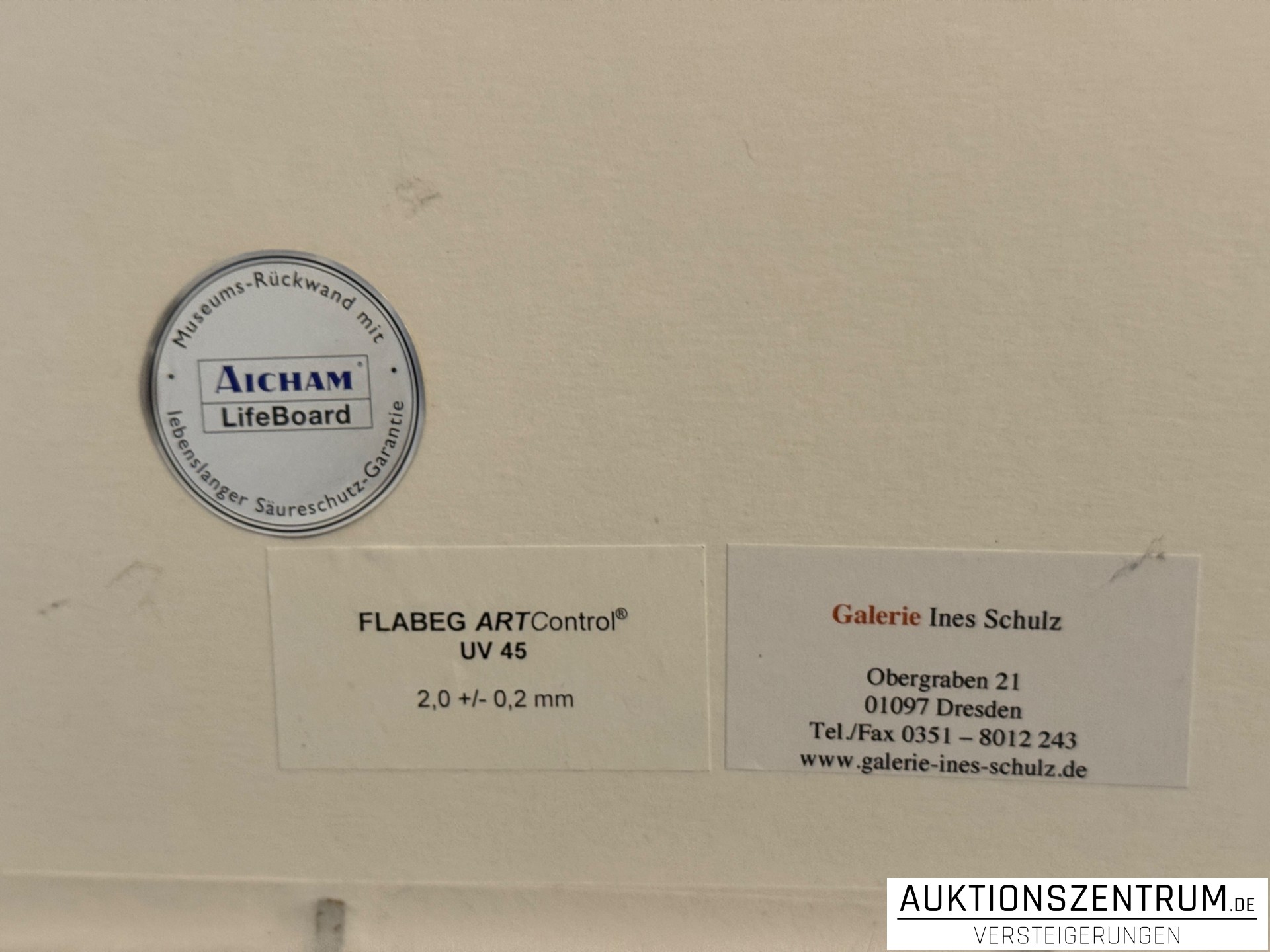 Metallrahmen mit Passepartout, Museums-Rückwand „Aicham LifeBoard“ mit säurehemmendem Schutz, Verglasung FLABEG ARTControl UV 45.