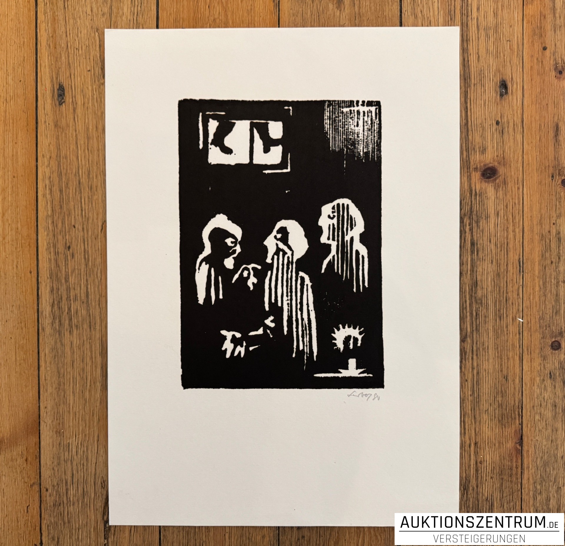 Ausdrucksstarker Schwarz-Weiß-Holzschnitt mit figürlicher Szene in einem Innenraum, typisch für Sandbergs engagierte, politisch geprägte Grafik. Das Werk überzeugt durch den starken Hell-Dunkel-Kontrast und die klare formale Reduktion.