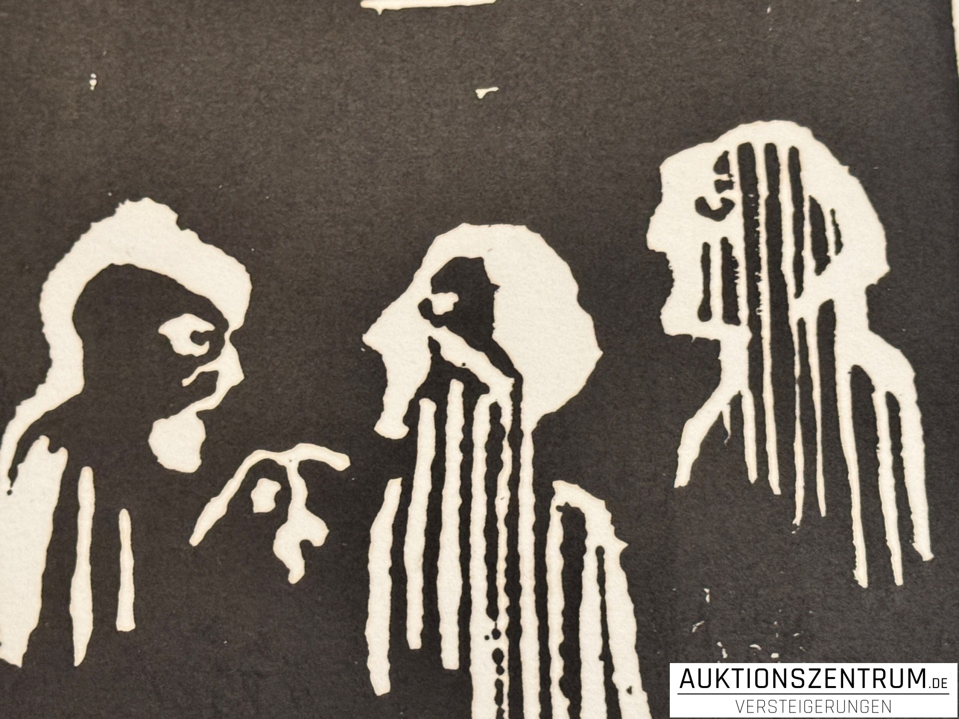 Holzschnitt auf wolkigem Papier.