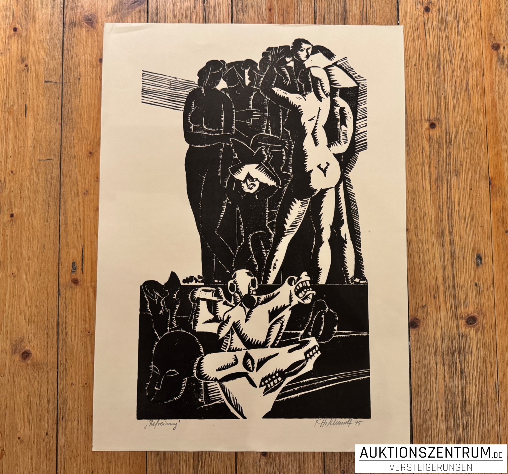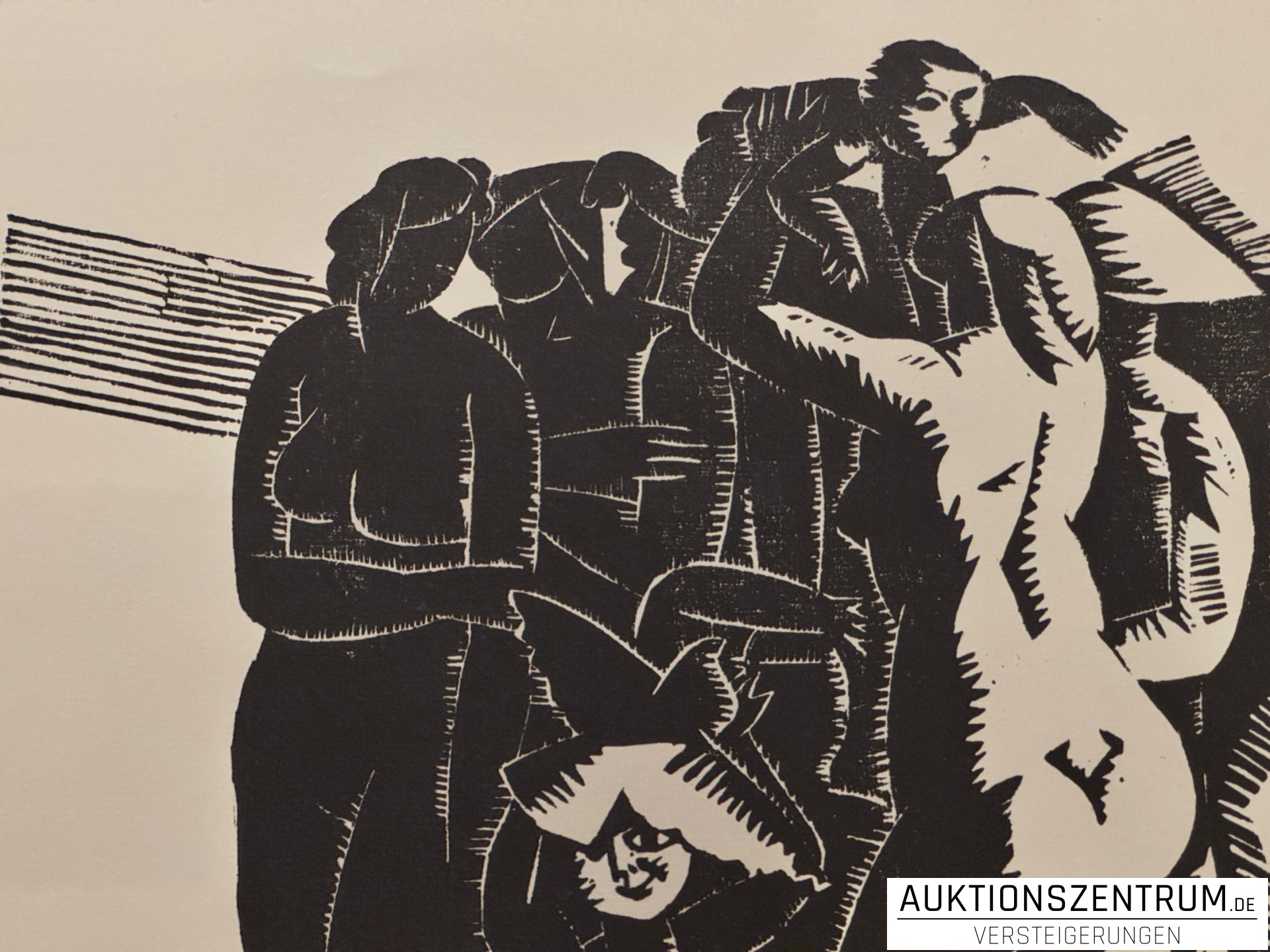 Ausdrucksstarker, großformatiger Linolschnitt auf Papier mit figürlicher Komposition. In kräftigem Schwarz-Weiß-Kontrast ausgeführte Darstellung mehrerer stehender und sitzender Figuren.