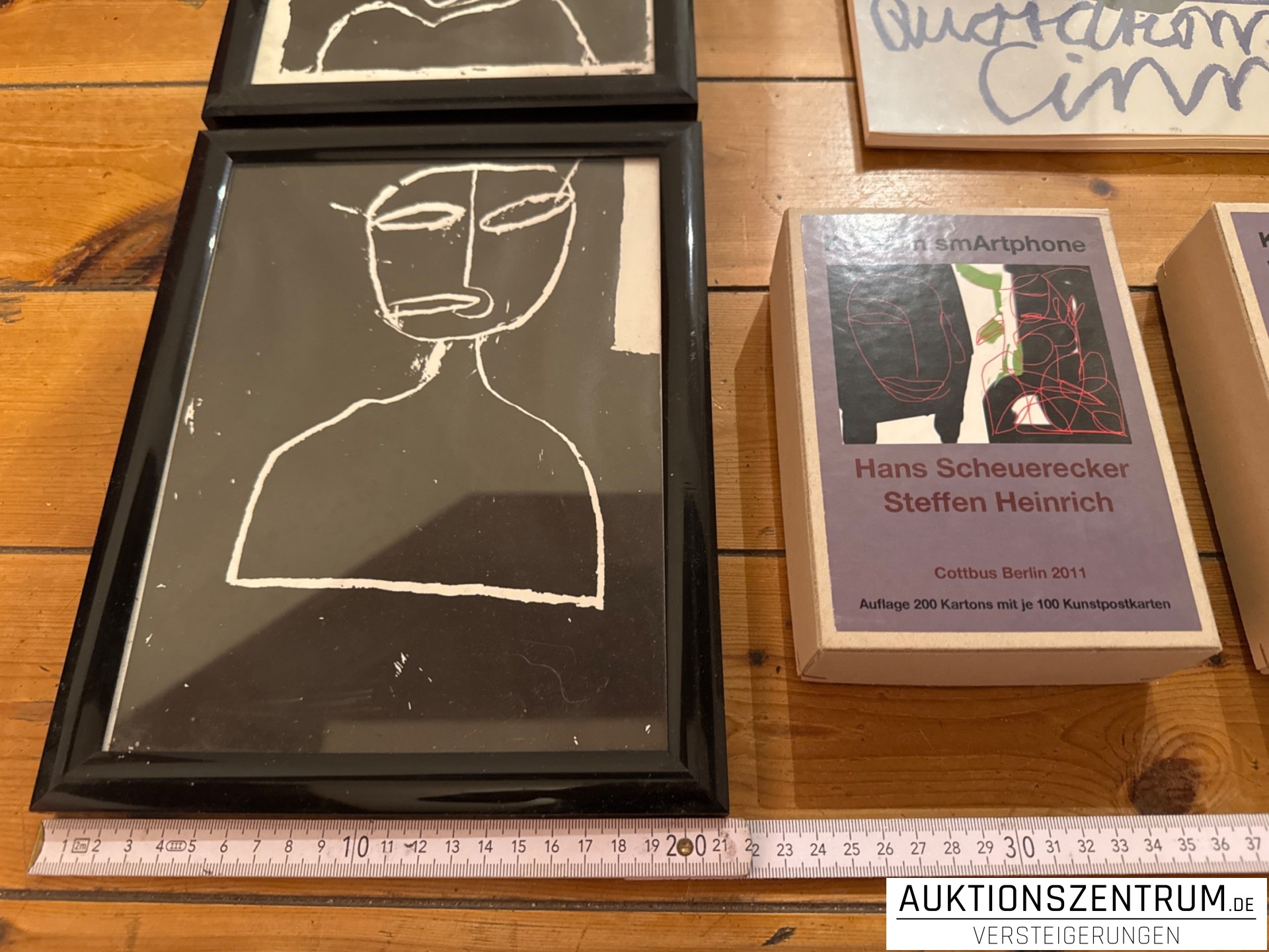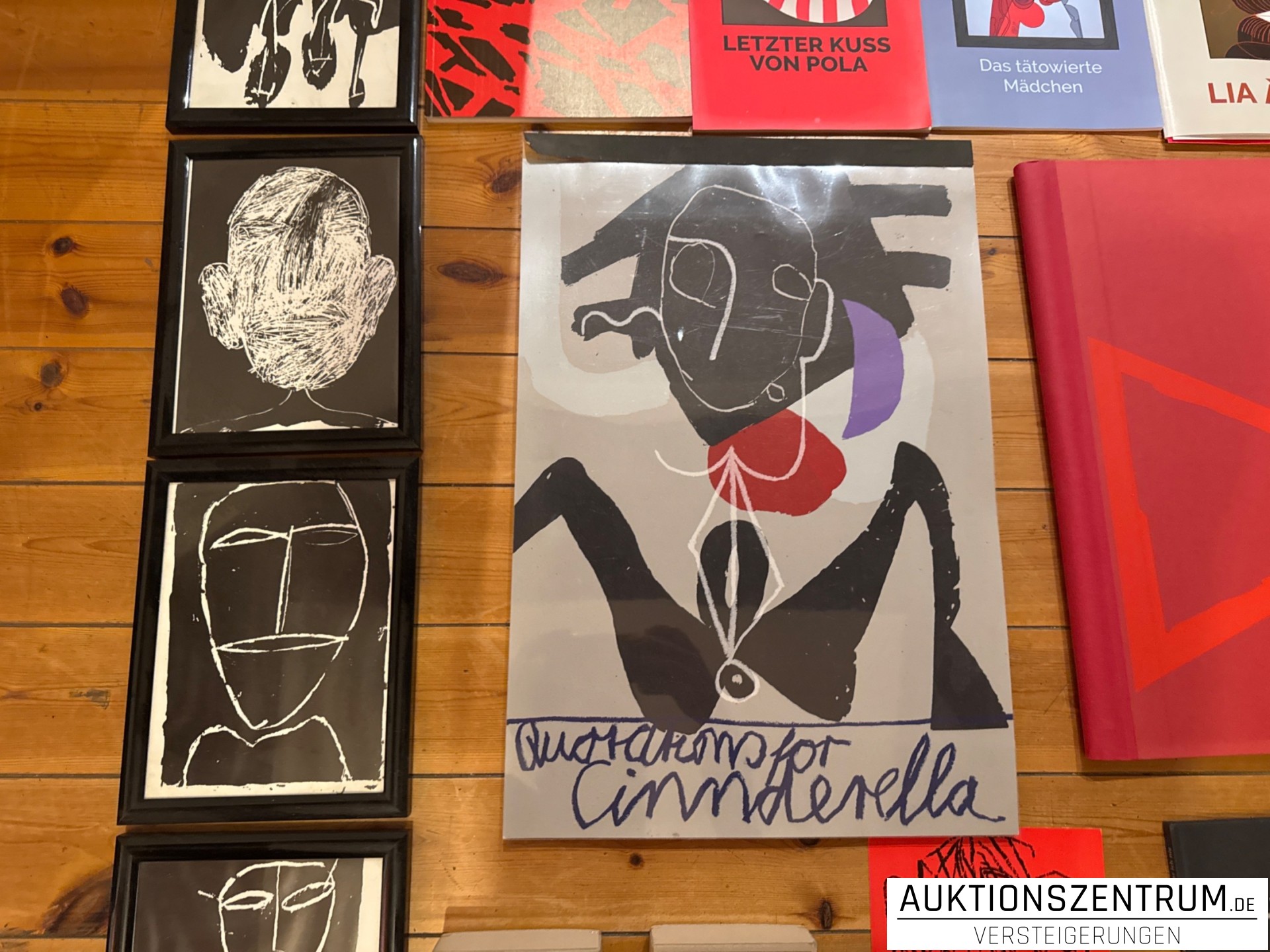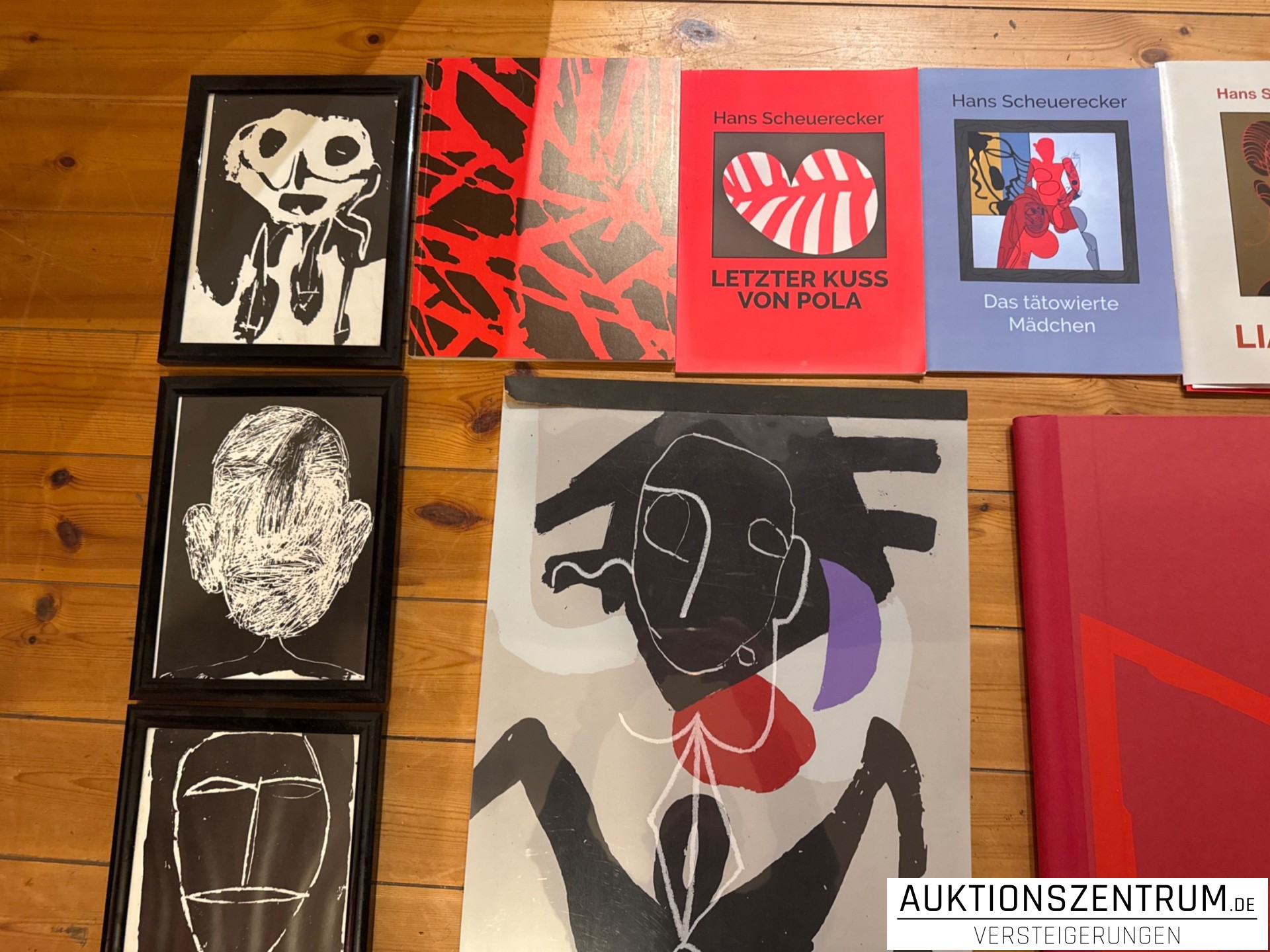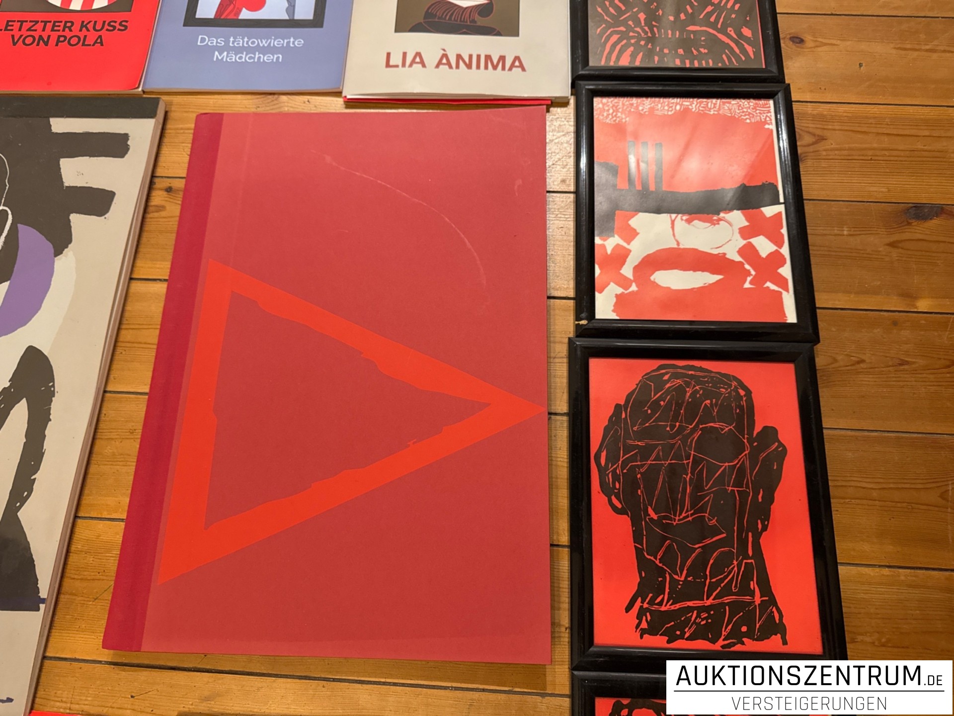 Enthalten sind mehrere gebundene und broschierte Bücher sowie Kataloge auf Papier, ergänzt um zahlreiche auf Papier ausgeführte Drucke und Blätter, teils in Passepartouts bzw. einfachen Rahmen präsentiert. Die Arbeiten zeigen charakteristische, expressiv-abstrakte Figuren- und Kopfstudien sowie grafische Kompositionen in überwiegend kontrastreicher Schwarz-Weiß- und Rot-Schwarz-Gestaltung.