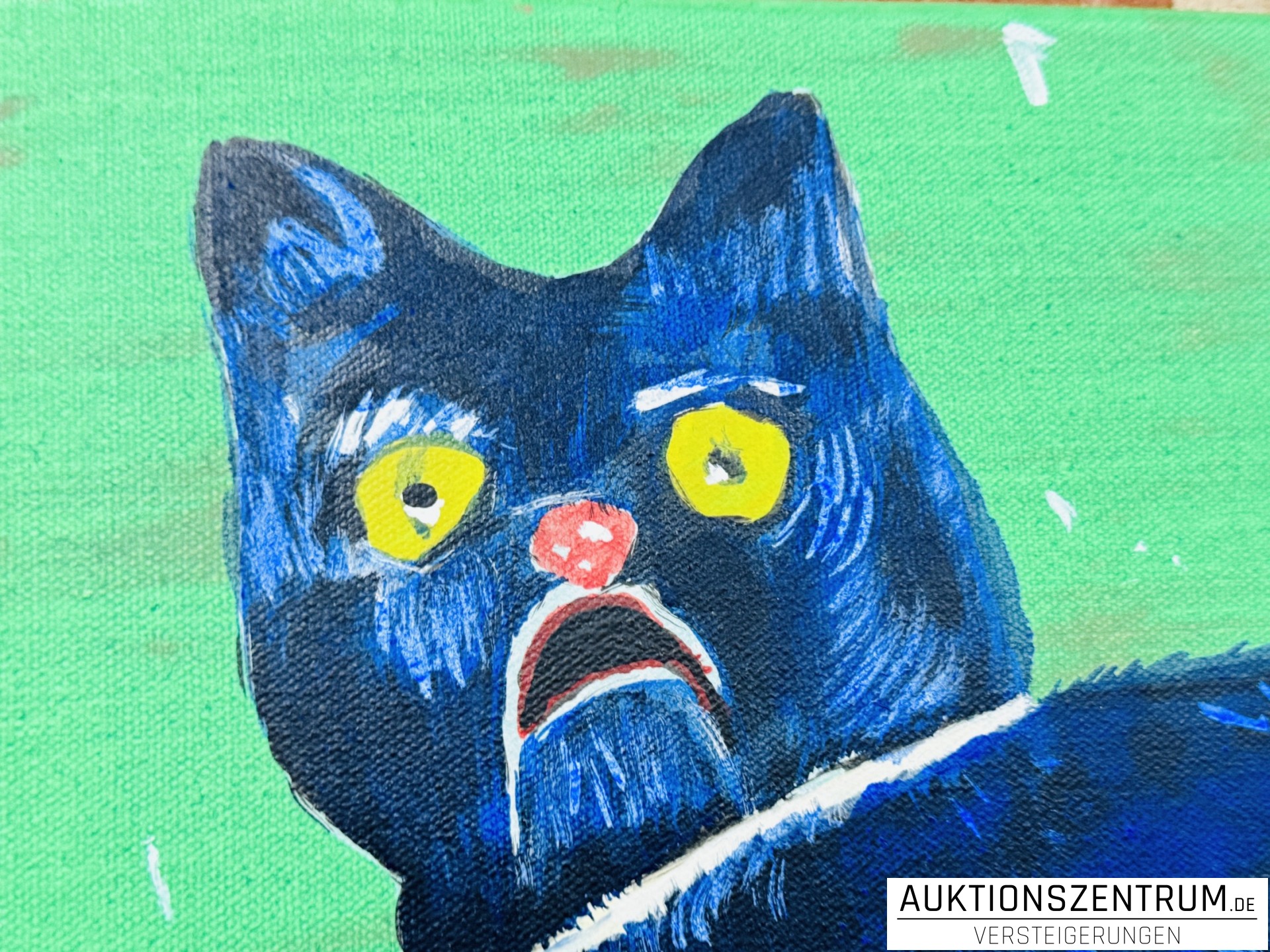 Ausdrucksstarkes, farbintensives Gemälde mit einer stilisierten Katze vor grünem Hintergrund. Die Arbeit überzeugt durch ihre klare Konturführung und den kontrastreichen Farbeinsatz.