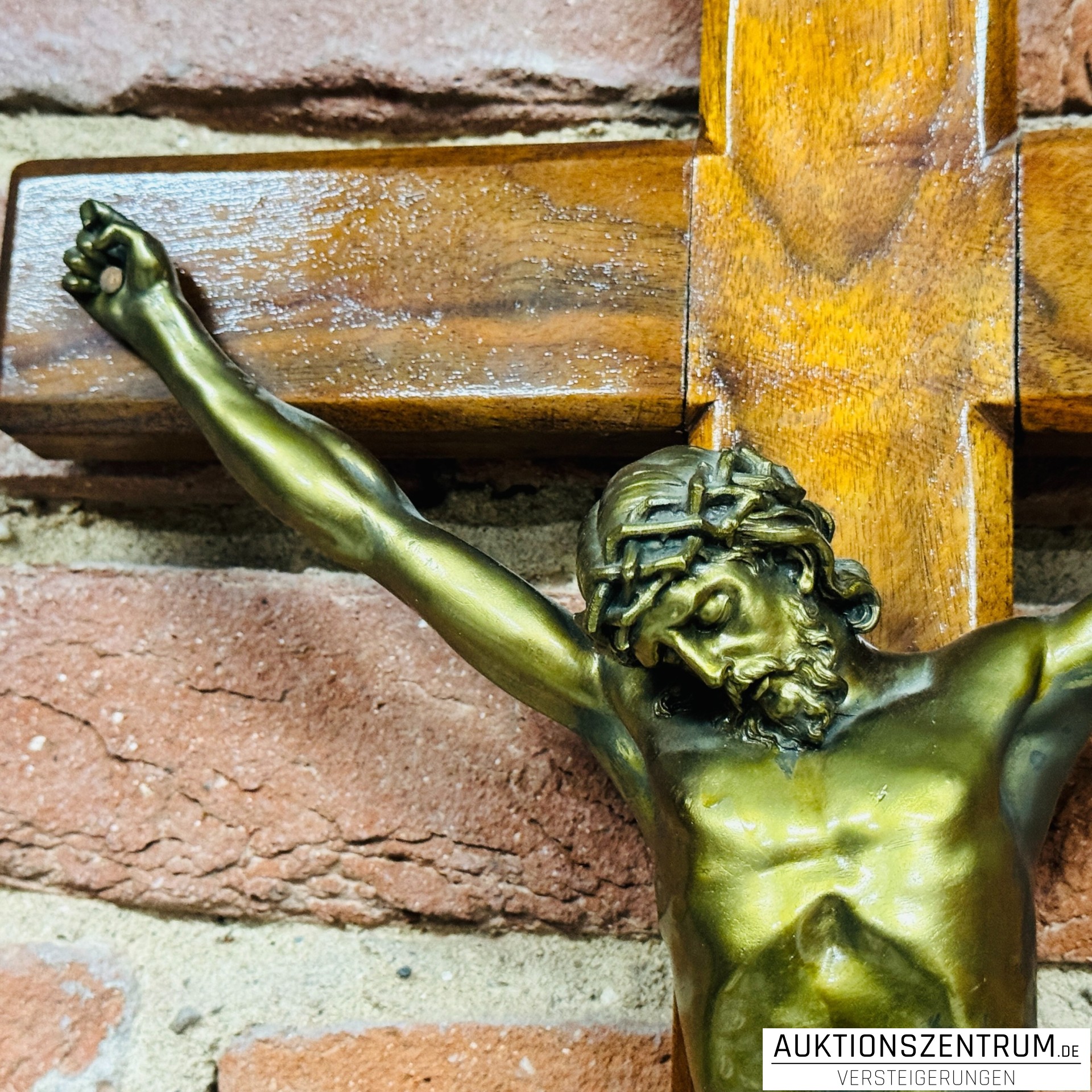 Der Korpus ist aus metallischem Material mit messingfarbener Oberfläche gearbeitet und zeigt eine fein ausgearbeitete Anatomie mit Dornenkrone und Lendentuch.
