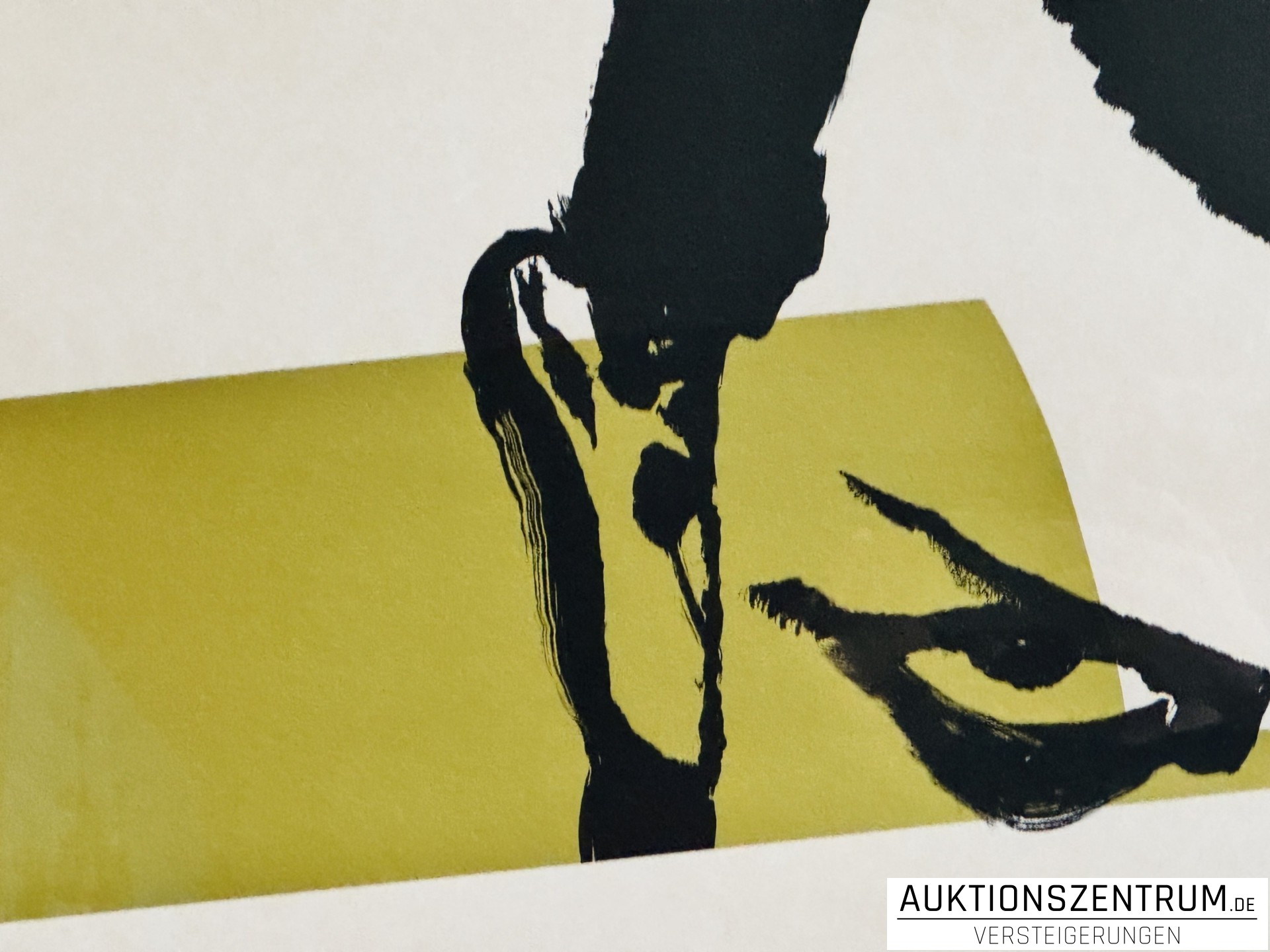 Abstrakt-figurative Komposition in kontrastreicher Farbigkeit mit dominierenden Schwarz- und Gelbtönen, von einem breiten, farbigen Rand eingefasst. Das Blatt befindet sich in einem schlichten Rahmen mit Passepartout.