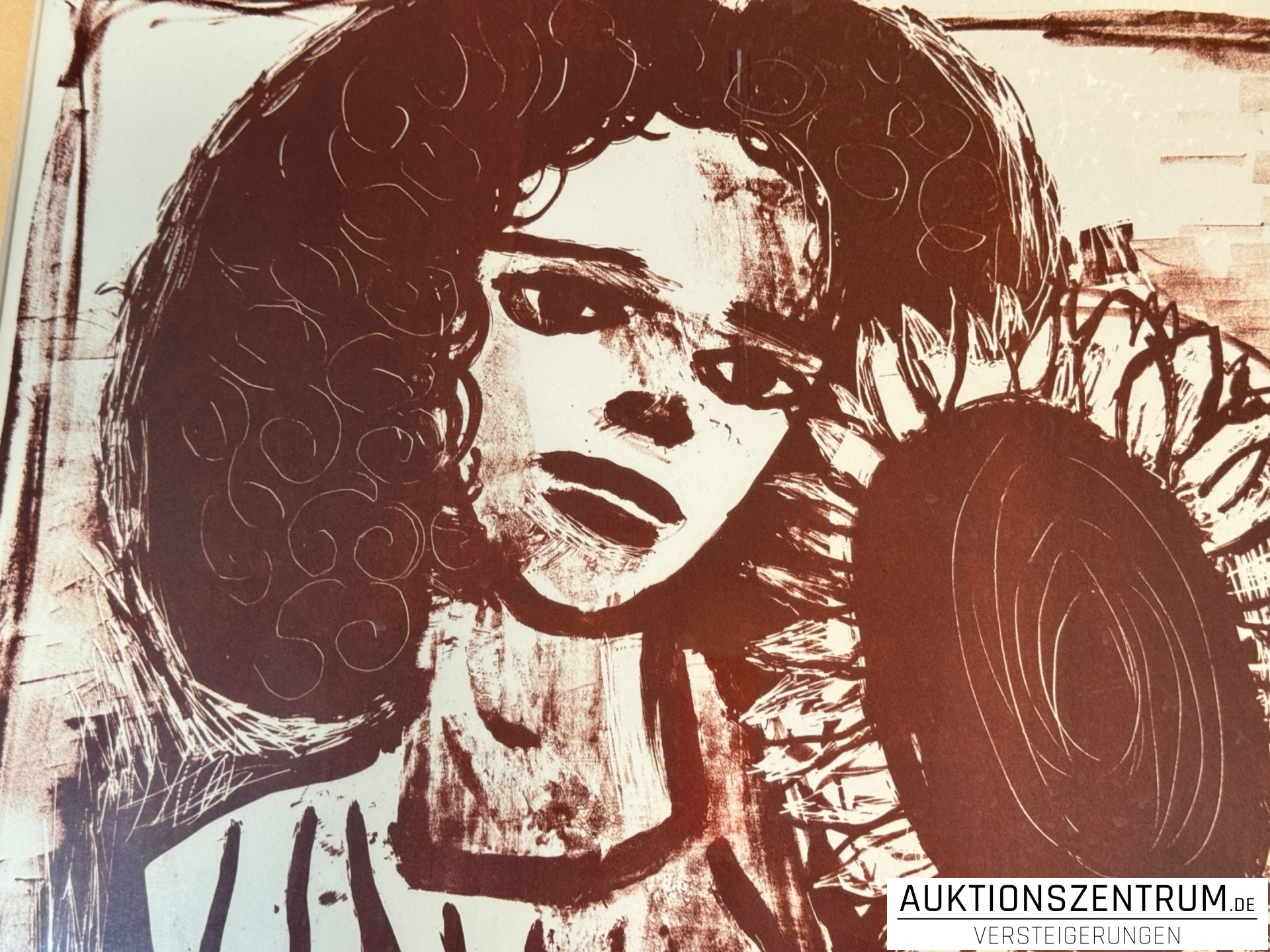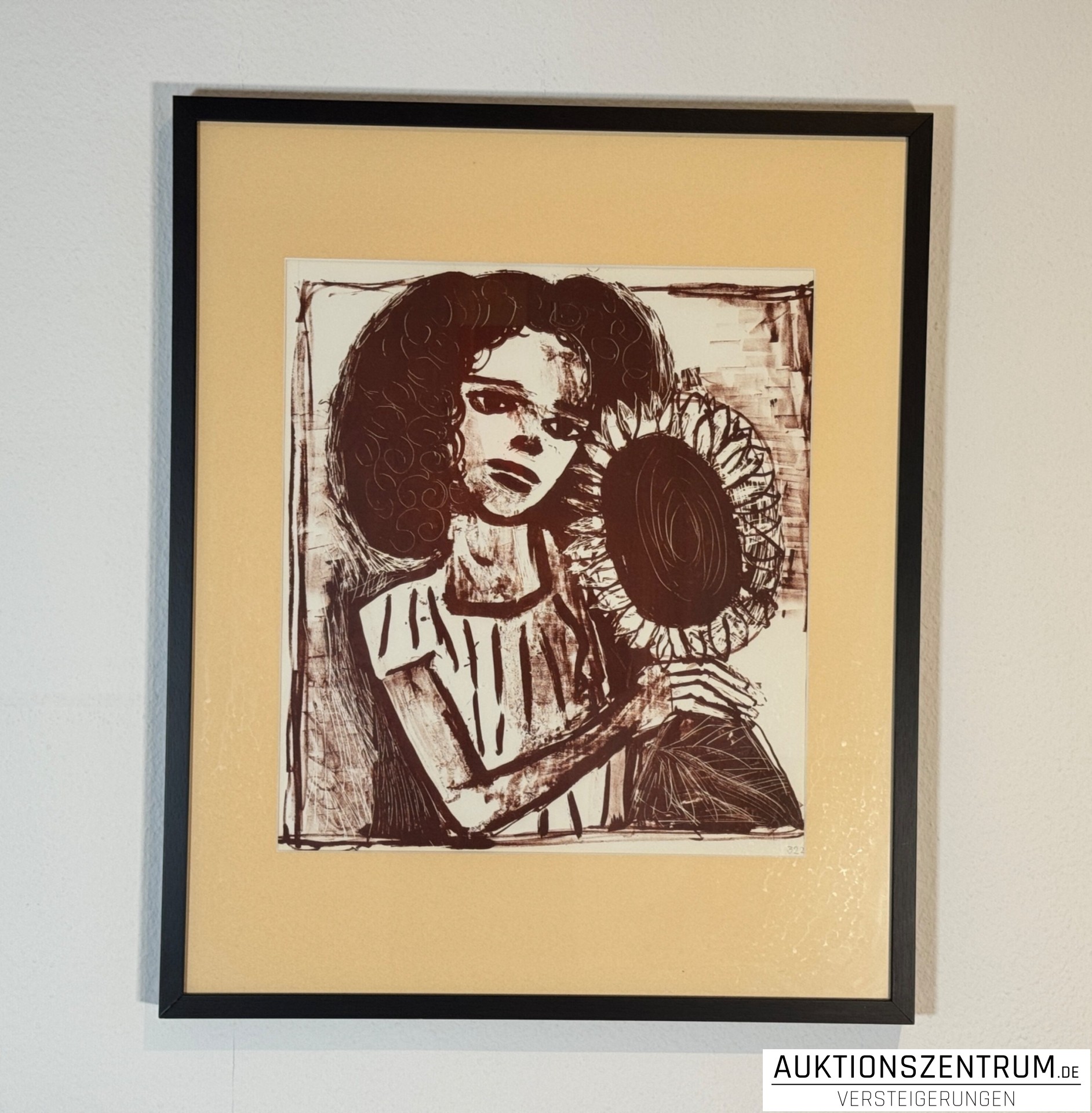Rotbraune Lithografie auf Velin, passepartouriert und in einem schlichten schwarzen Rahmen präsentiert. Ausdrucksstarke Darstellung eines Mädchens mit großer Sonnenblume, charakteristisch für die späte Grafik des Künstlers.