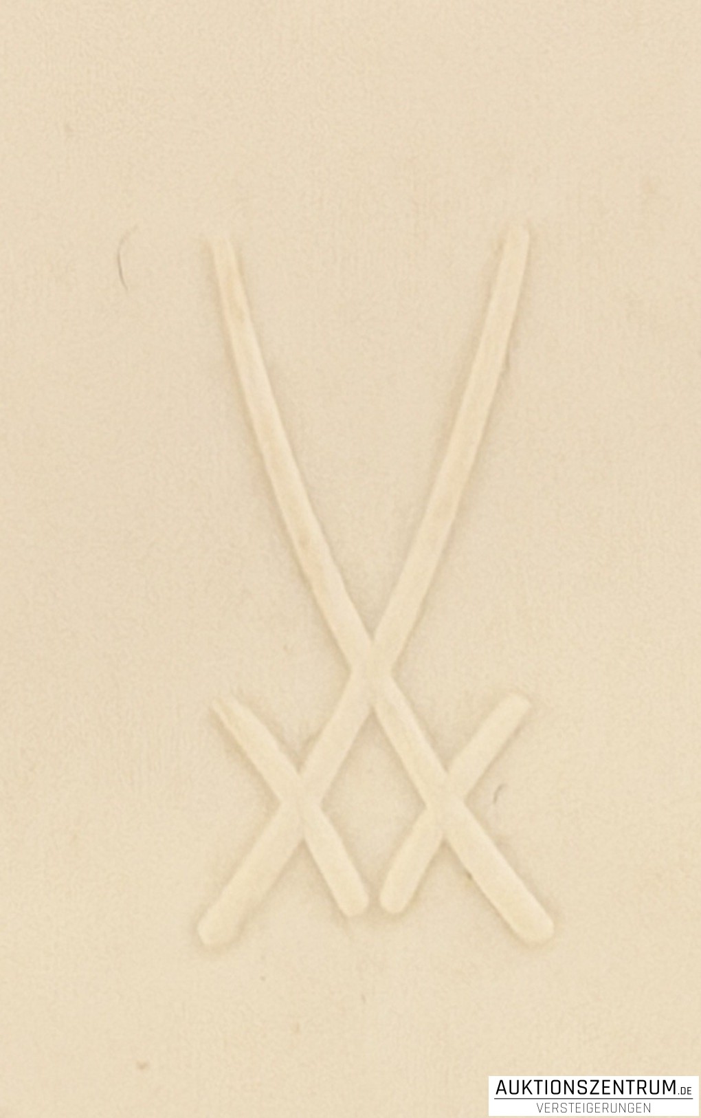 Runde Porzellanplakette mit Pferdekopf-Relief und der Bezeichnung „ESCARDO“.