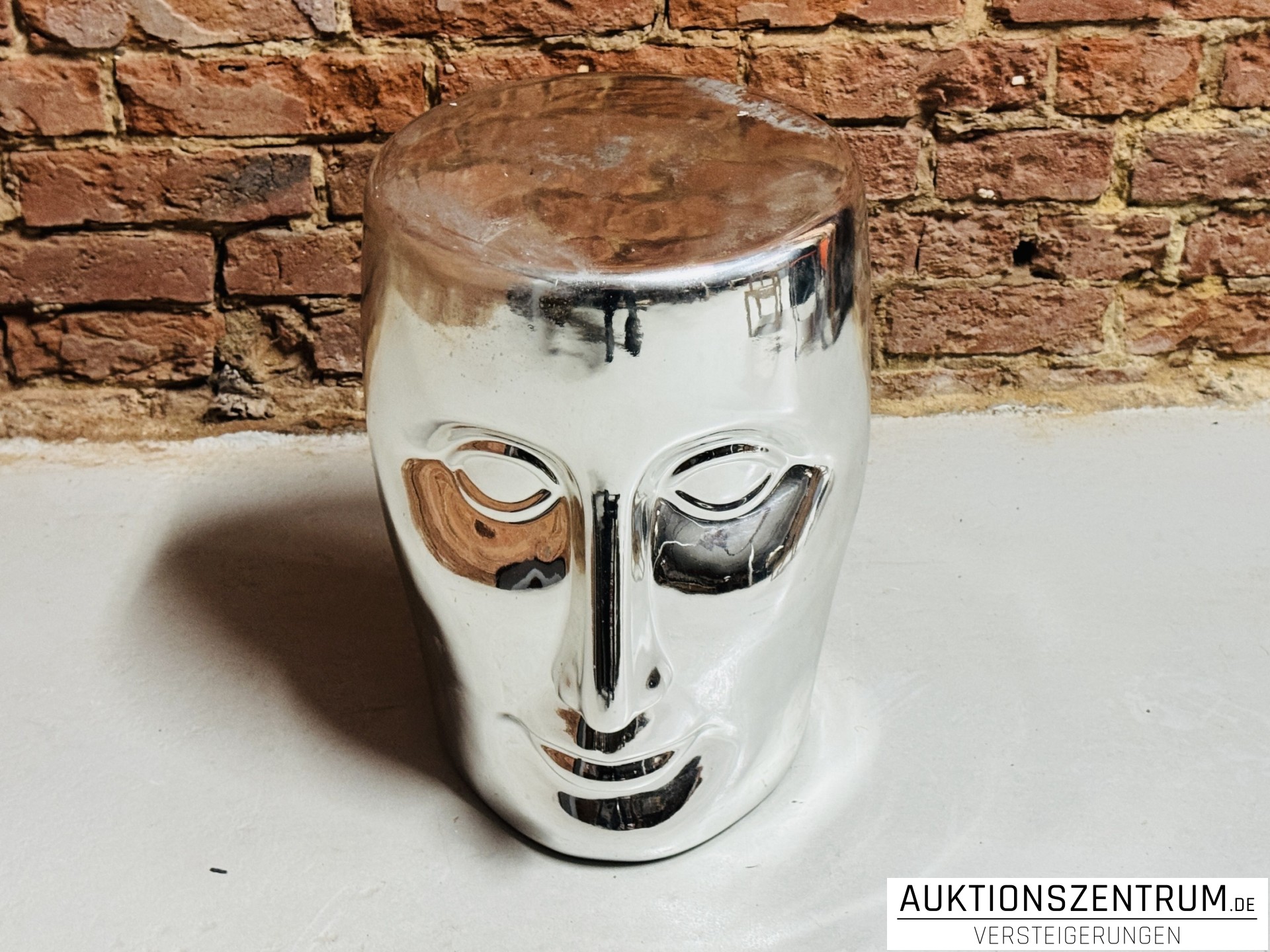 Die vollplastische Skulptur ist zugleich als Hocker oder Beistelltisch nutzbar und besticht durch ihre spiegelnde Metalloptik und die charakteristische, grafisch ausgearbeitete Gesichtspartie.