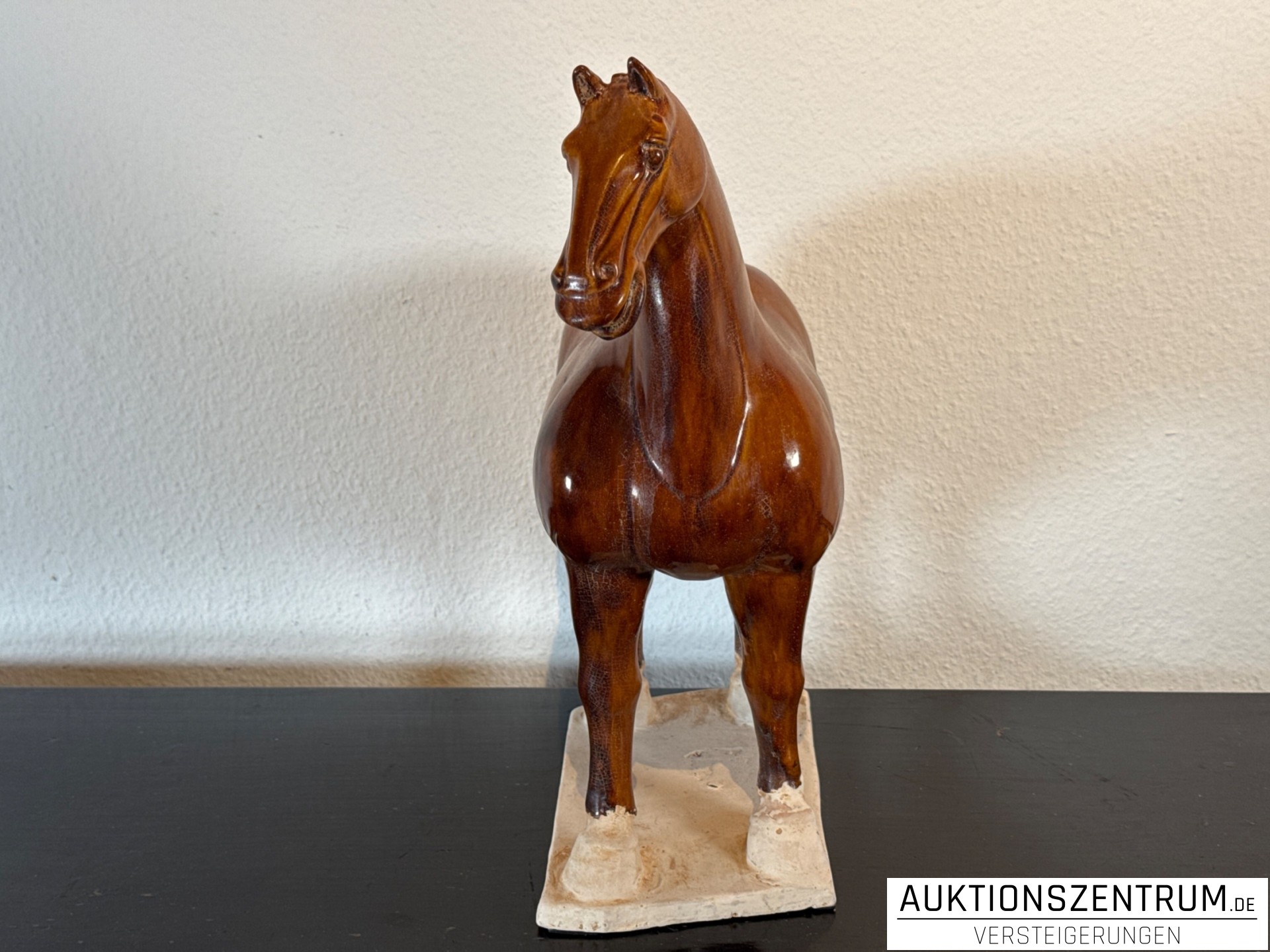 Ausdrucksvolle Keramikplastik eines Tang-Pferdes auf rechteckigem Sockel. Die vollplastische Darstellung zeigt ein kräftig proportioniertes Pferd in ruhigem Stand, mit elegant geschwungenem Hals und fein modelliertem Kopf.