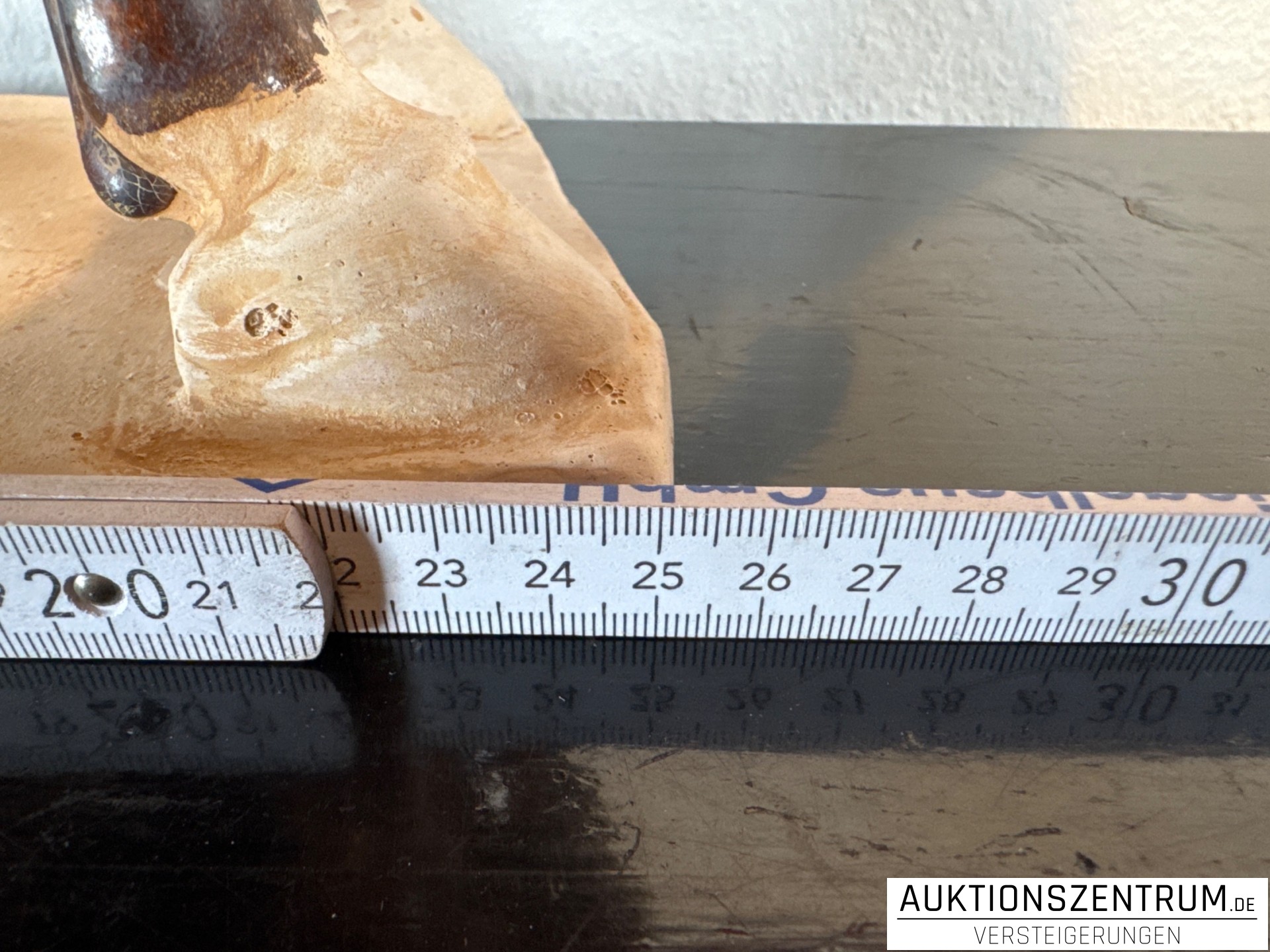 Die Oberfläche ist mit einer warm braunen Glasur versehen, die einen dekorativen Craquelé-Effekt aufweist und die plastische Modellierung wirkungsvoll betont. Der Sockel ist in hellerem Ton gehalten und bildet einen harmonischen Kontrast zur Figur.