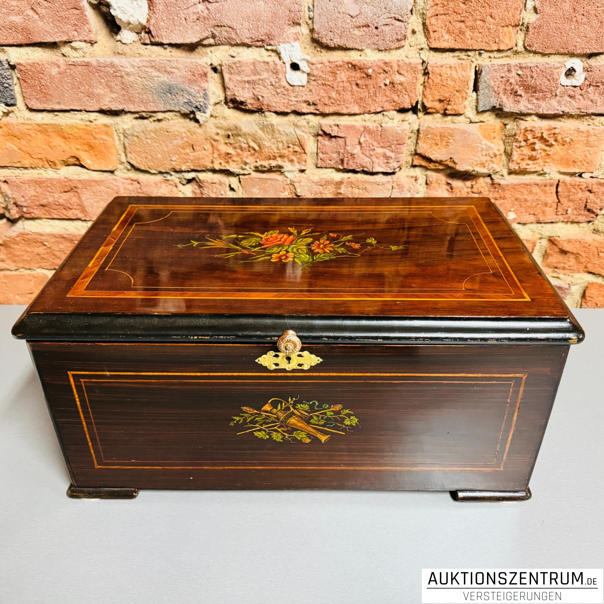 Aufwendig gearbeitete Schweizer Zylindermusikdose in rechteckiger Holzkassette mit dekorativer Intarsien- und Blumenmalerei.