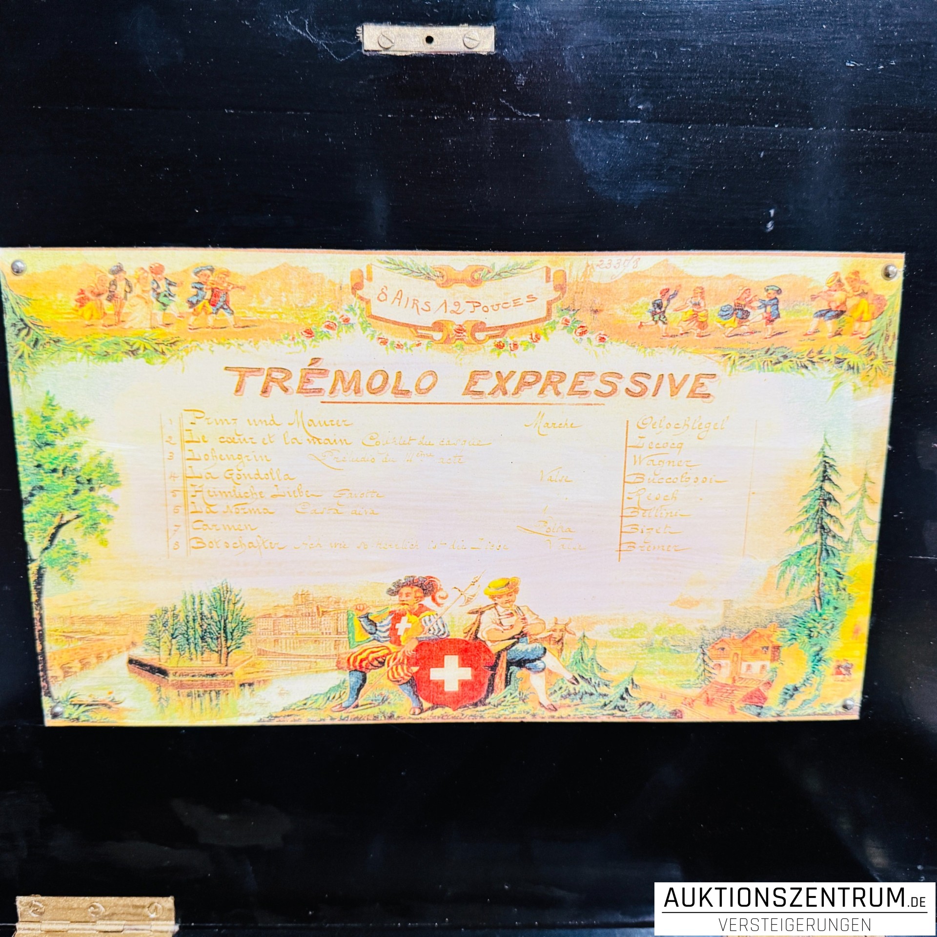 Im Inneren befindet sich ein Zylinderwerk mit Kamm, Federwerk und Regler, ausgeführt als Trémolo Expressive. Auf der Innenseite des Deckels ist ein farbig lithografiertes Spielwerkschild mit Schweizer Wappen, Landschaftsdarstellungen und der Bezeichnung „Trémolo Expressive“ angebracht; dort sind mehrere Musikstücke (Airs) aufgeführt.