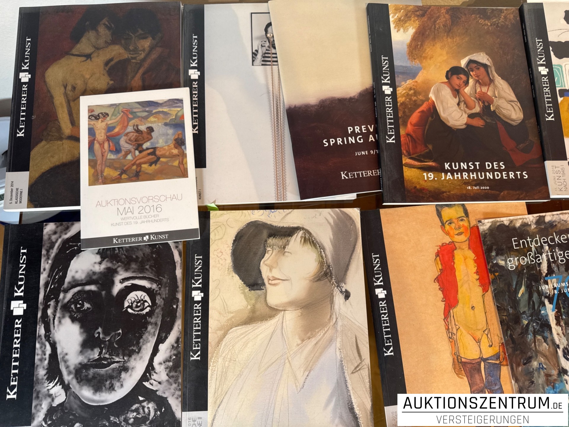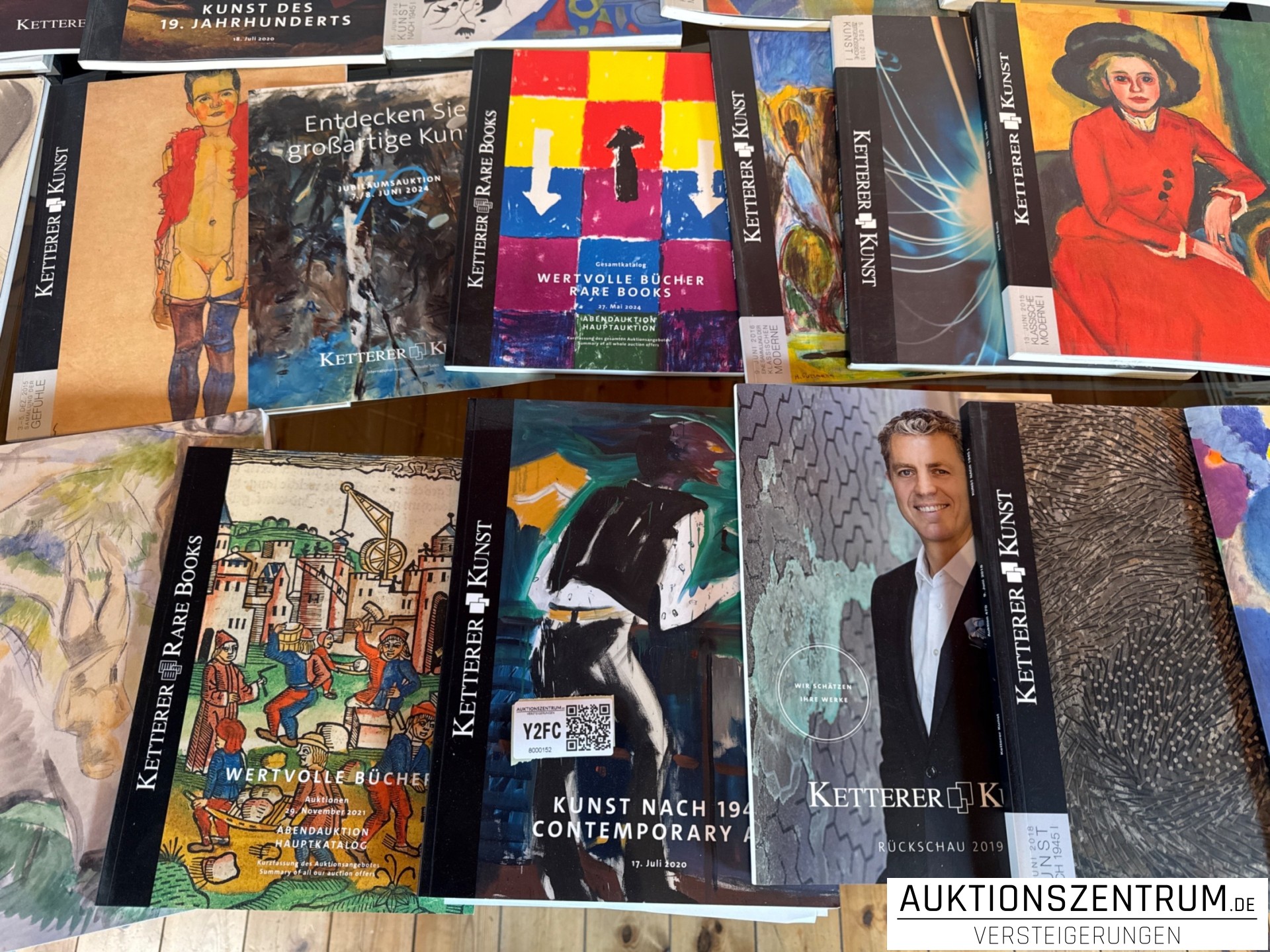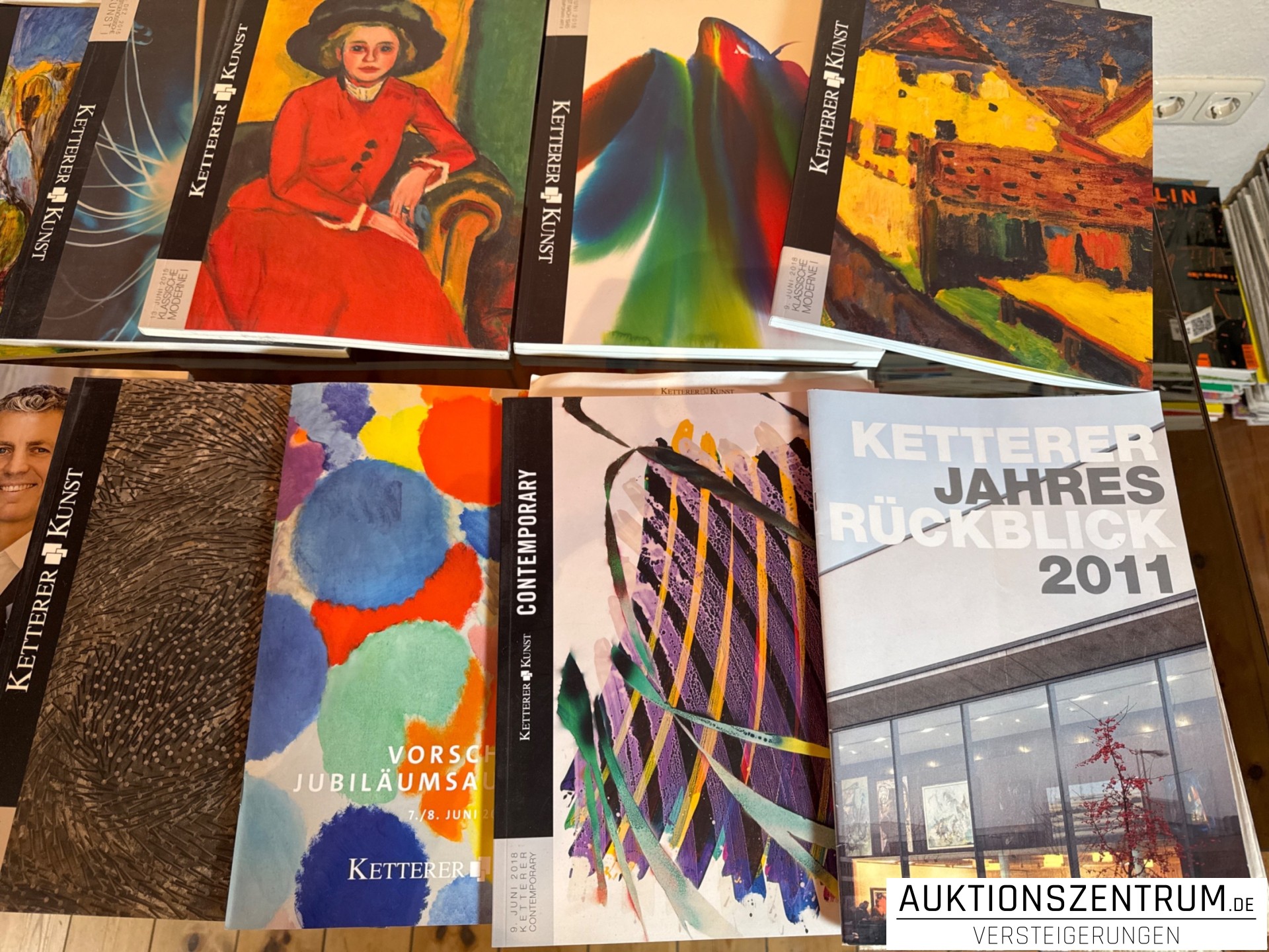 Dieses umfangreiche Konvolut umfasst etwa 30 Auktionskataloge des renommierten deutschen Auktionshauses KETTERER KUNST. Die Sammlung deckt verschiedene Bereiche der Kunstgeschichte ab, darunter "Kunst des 19. Jahrhunderts", "Klassische Moderne", "Kunst nach 1945 Contemporary Art" sowie "Wertvolle Bücher Rare Books". Die Kataloge sind reich bebildert und detailliert beschrieben, was sie zu wertvollen Referenzwerken für Kunstliebhaber, Sammler und Händler macht. Die Kataloge sind in einem guten Zustand.