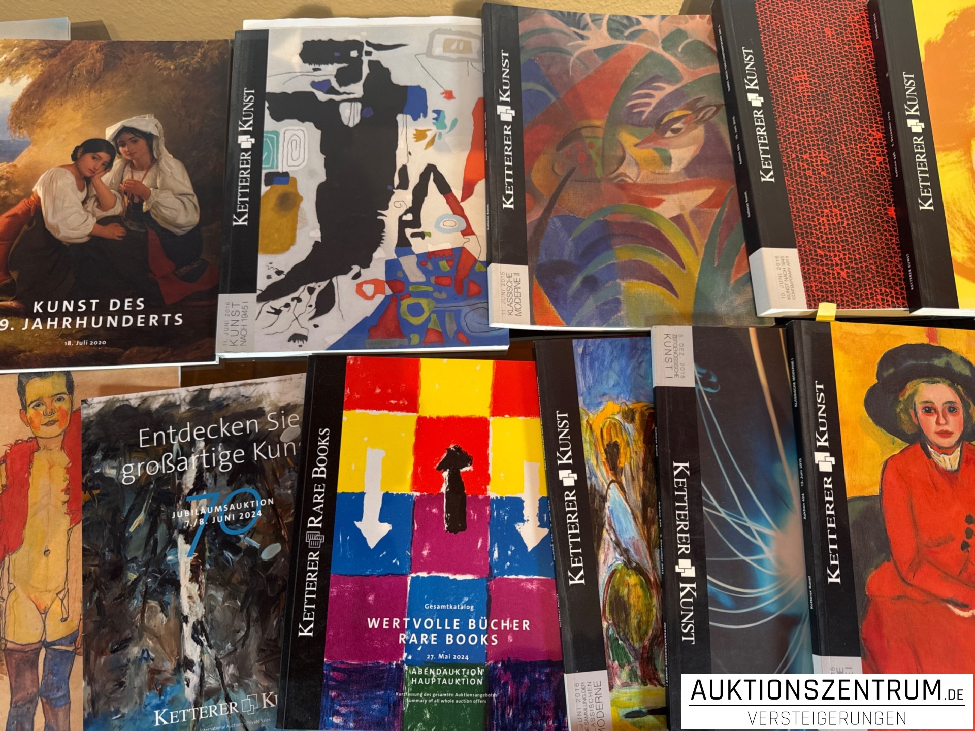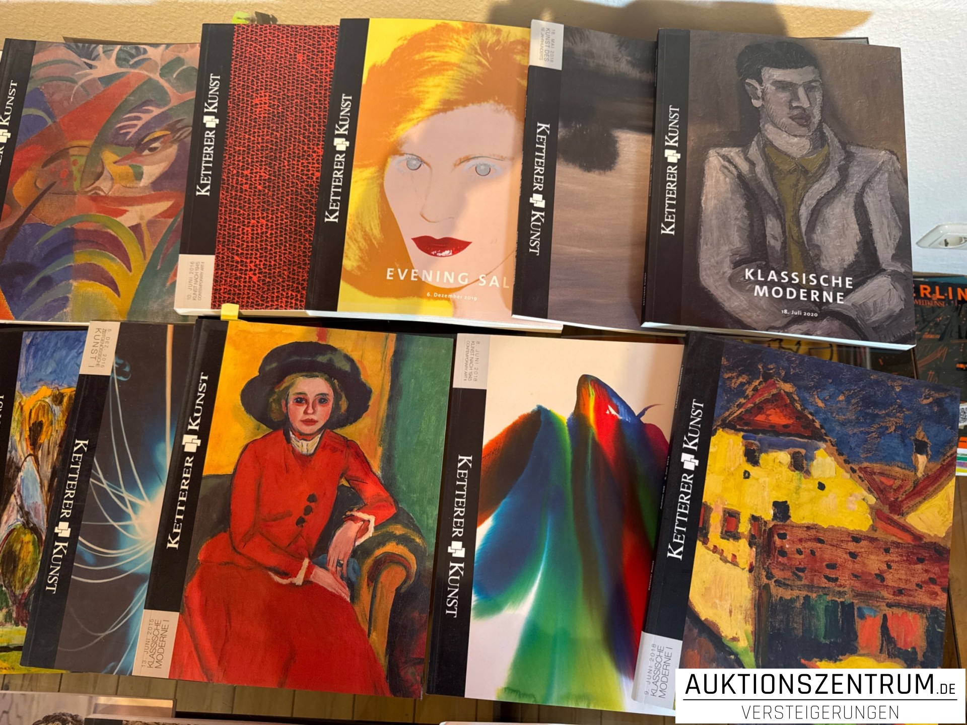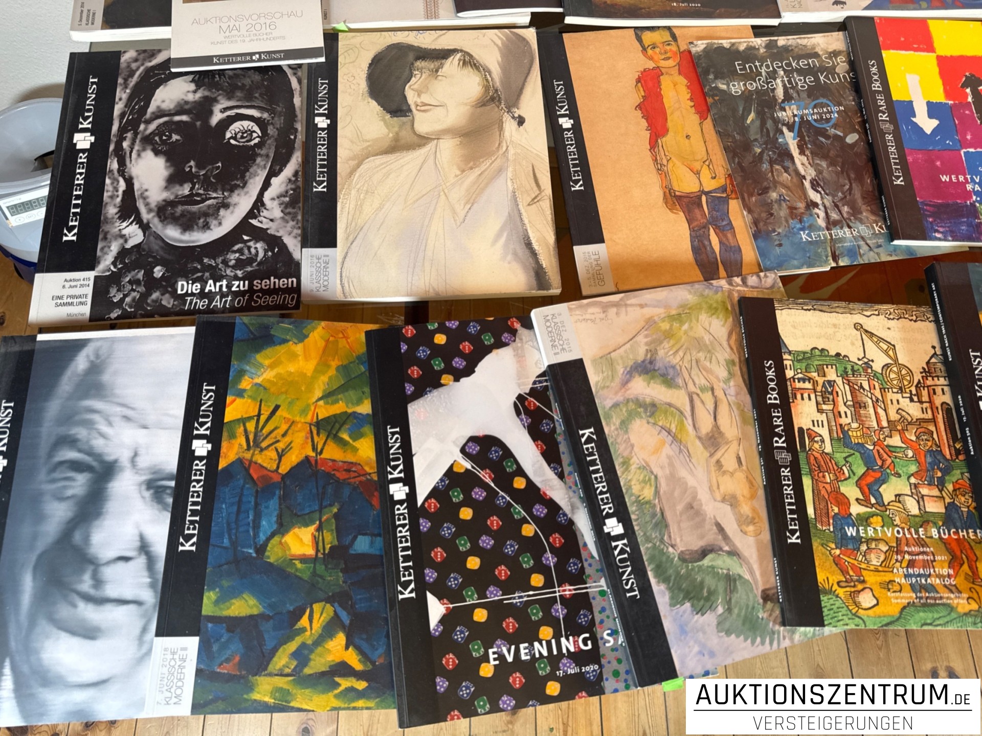Dieses umfangreiche Konvolut umfasst etwa 30 Auktionskataloge des renommierten deutschen Auktionshauses KETTERER KUNST. Die Sammlung deckt verschiedene Bereiche der Kunstgeschichte ab, darunter "Kunst des 19. Jahrhunderts", "Klassische Moderne", "Kunst nach 1945 Contemporary Art" sowie "Wertvolle Bücher Rare Books". Die Kataloge sind reich bebildert und detailliert beschrieben, was sie zu wertvollen Referenzwerken für Kunstliebhaber, Sammler und Händler macht. Die Kataloge sind in einem guten Zustand.