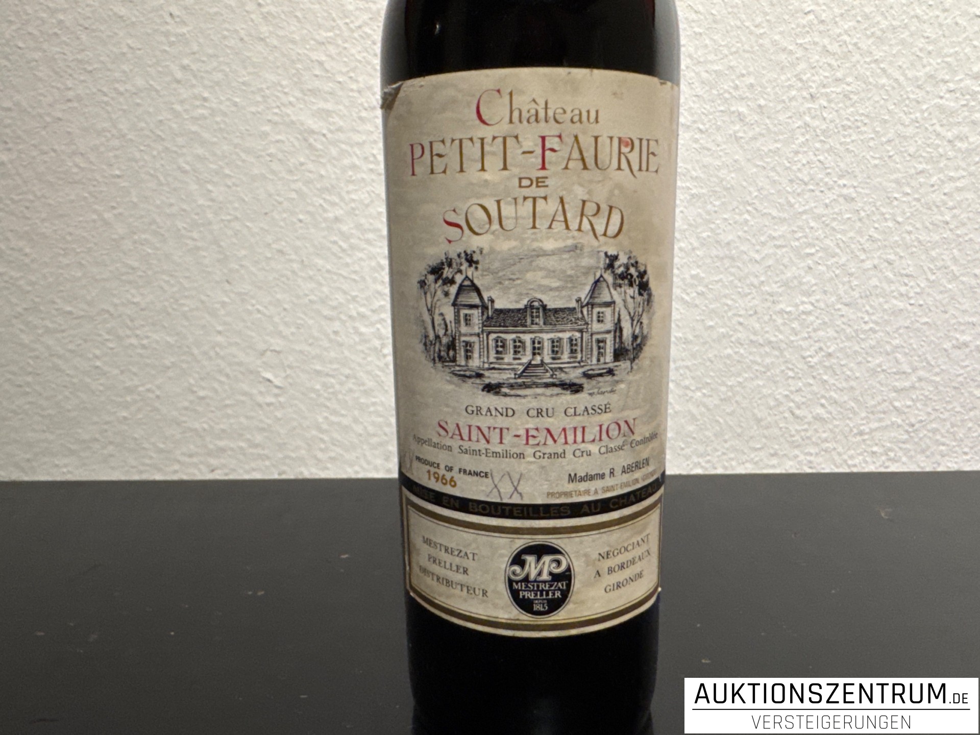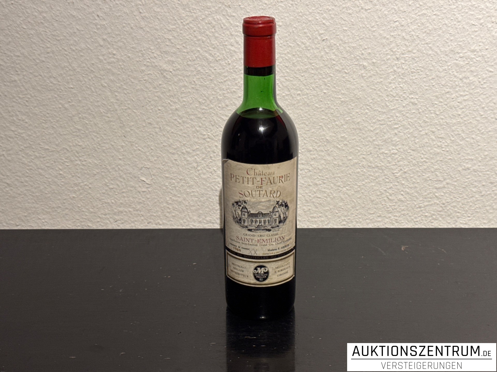 Rotweinflasche mit Inhalt aus dem Bordelaiser Spitzenanbaugebiet Saint-Émilion: Château Petit Faurie de Soutard, Grand Cru Classé, Jahrgang 1966.