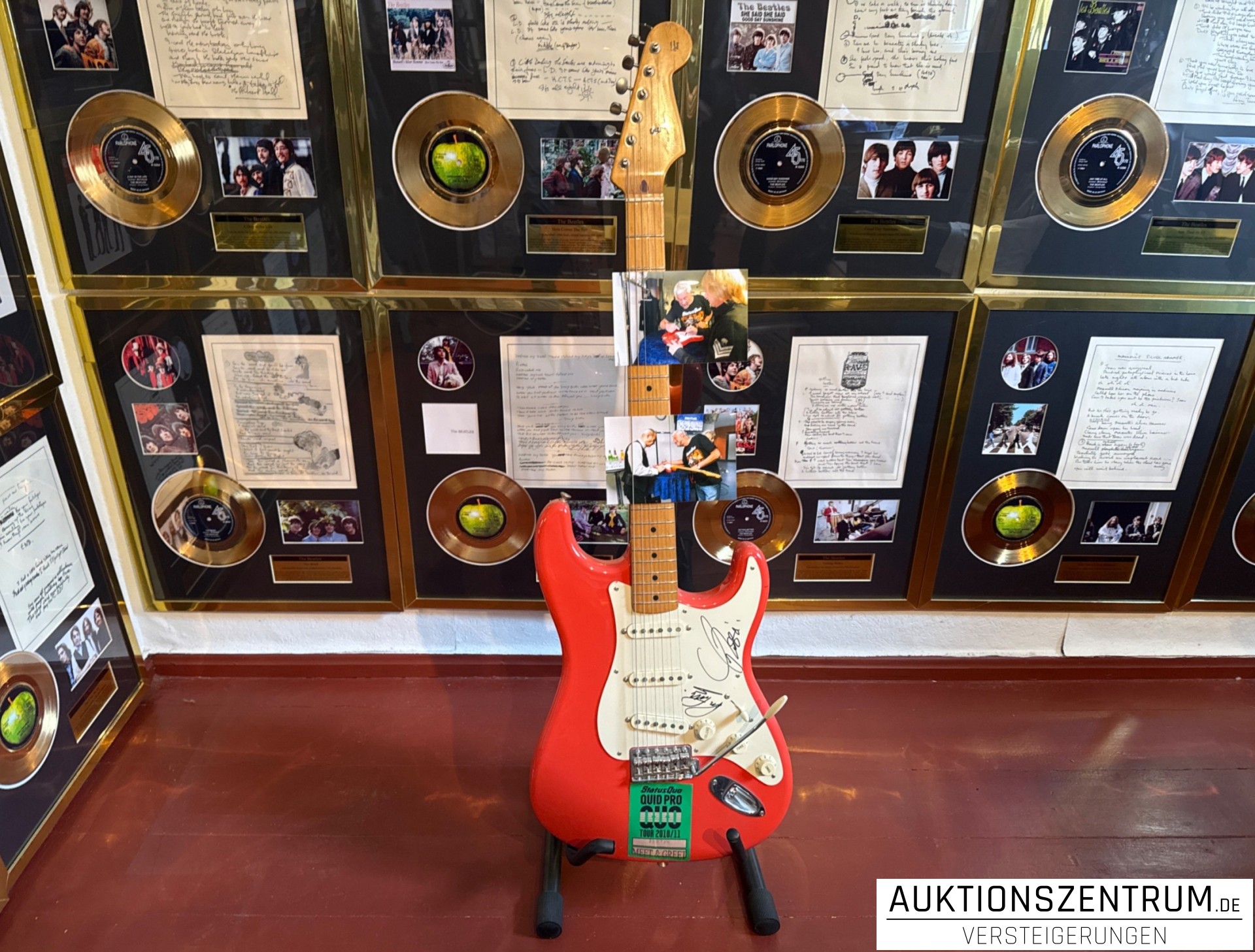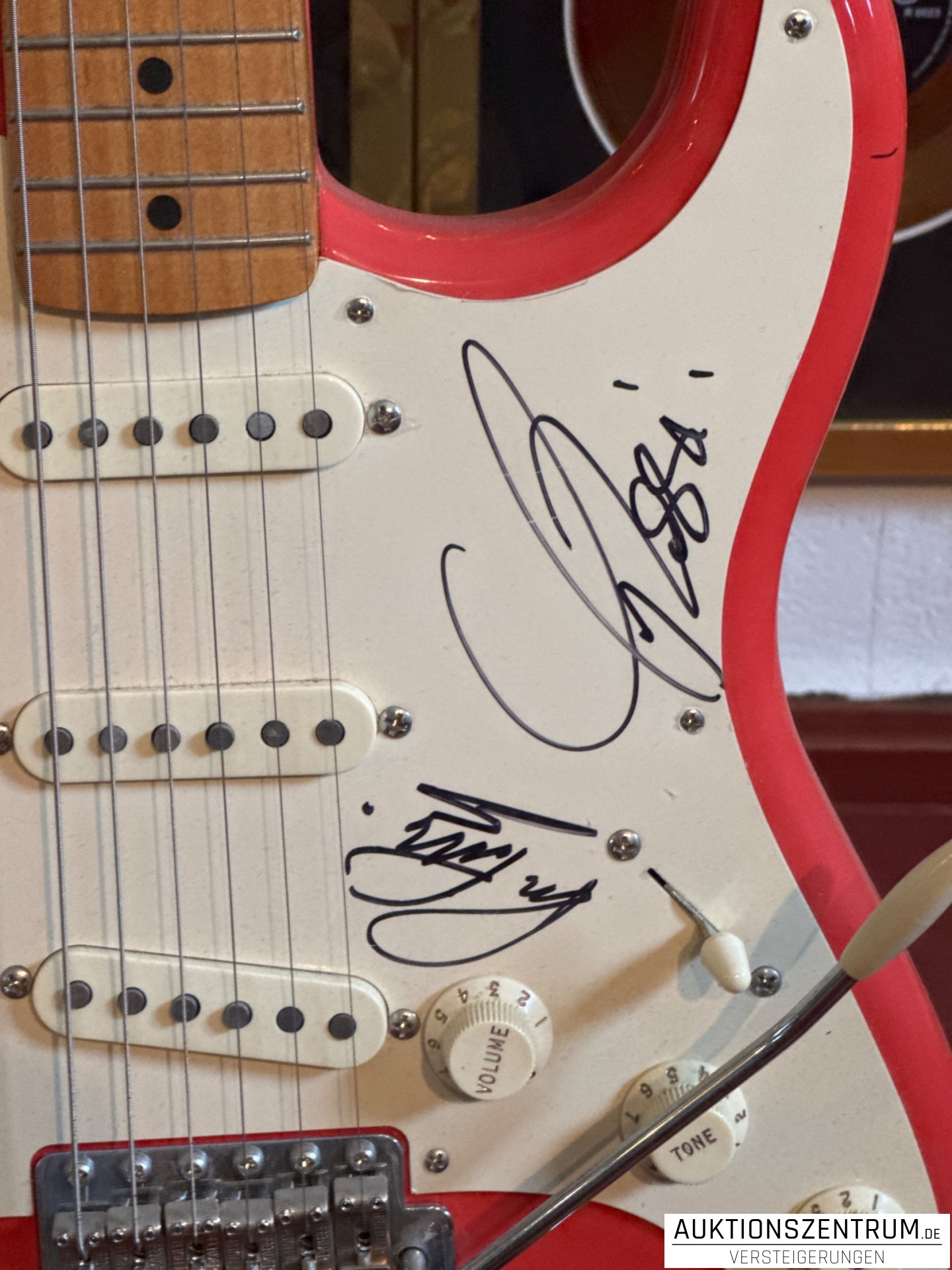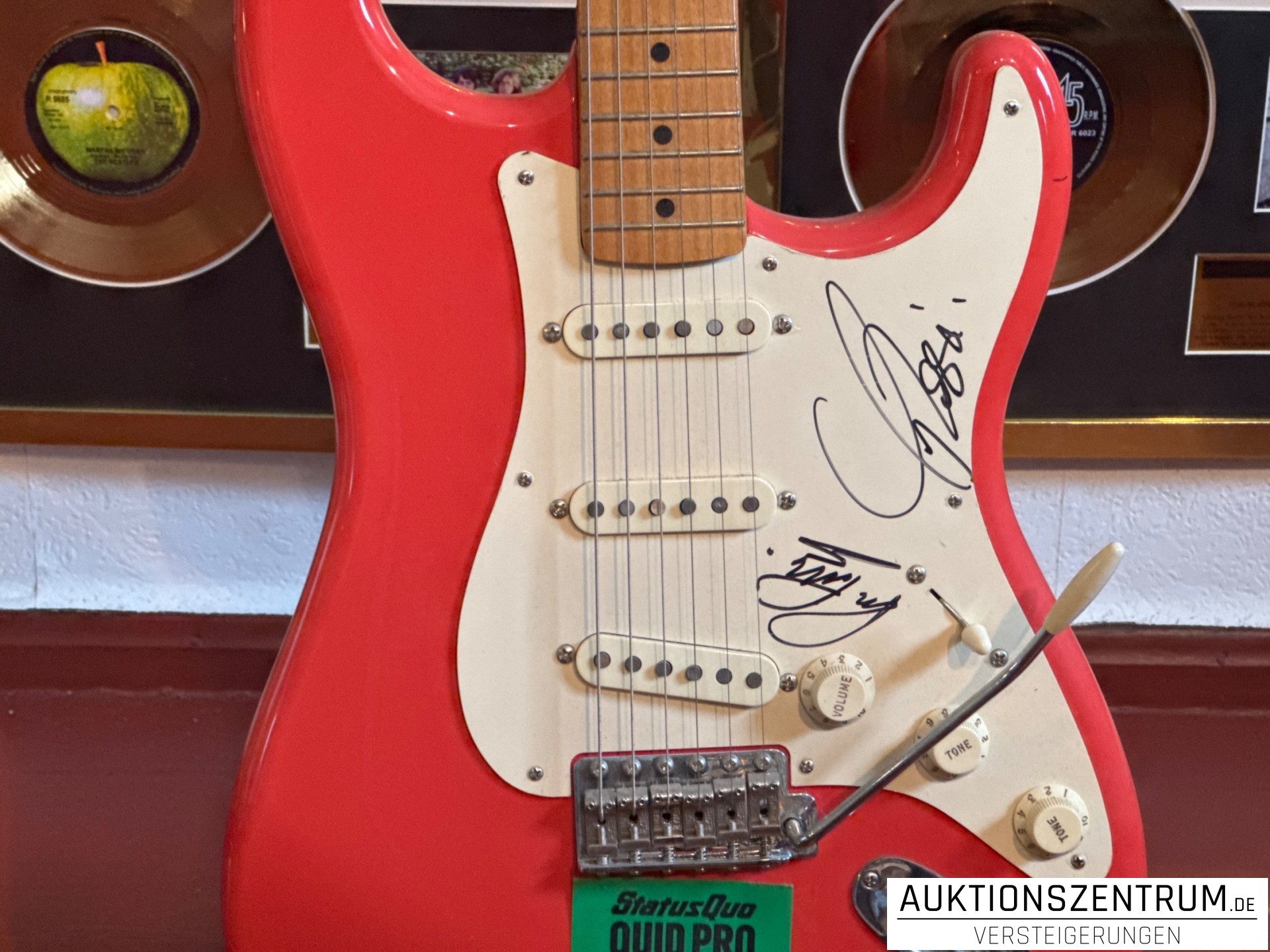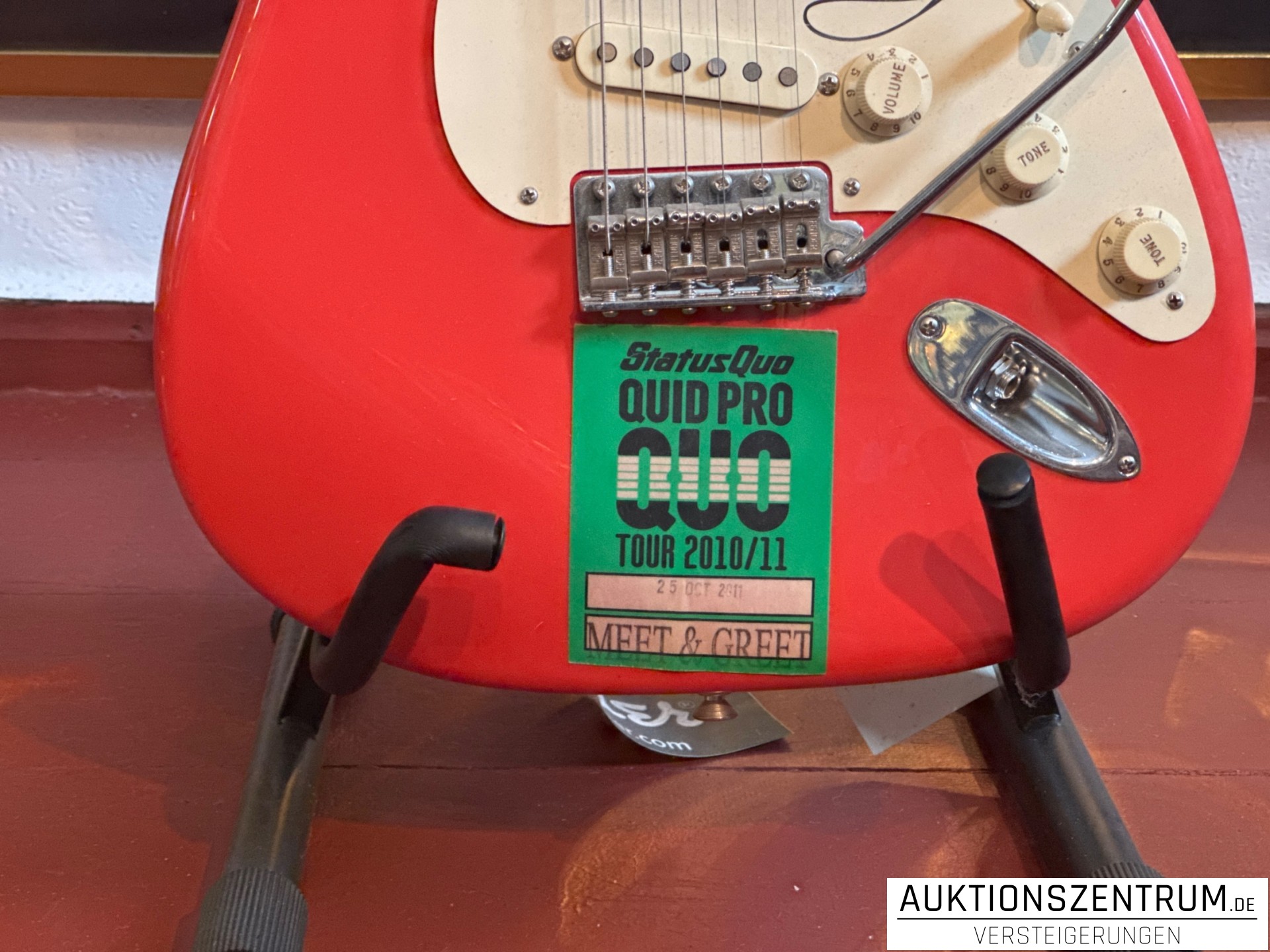 Die Fender E-Gitarre Modell Stratocaster trägt die Signaturen von Francis Rossi und Rick Parfitt und wurde von den Künstlern persönlich übergeben. Die Signatur ist durch Fotos belegt, welche dem Artikel beigelegt sind.